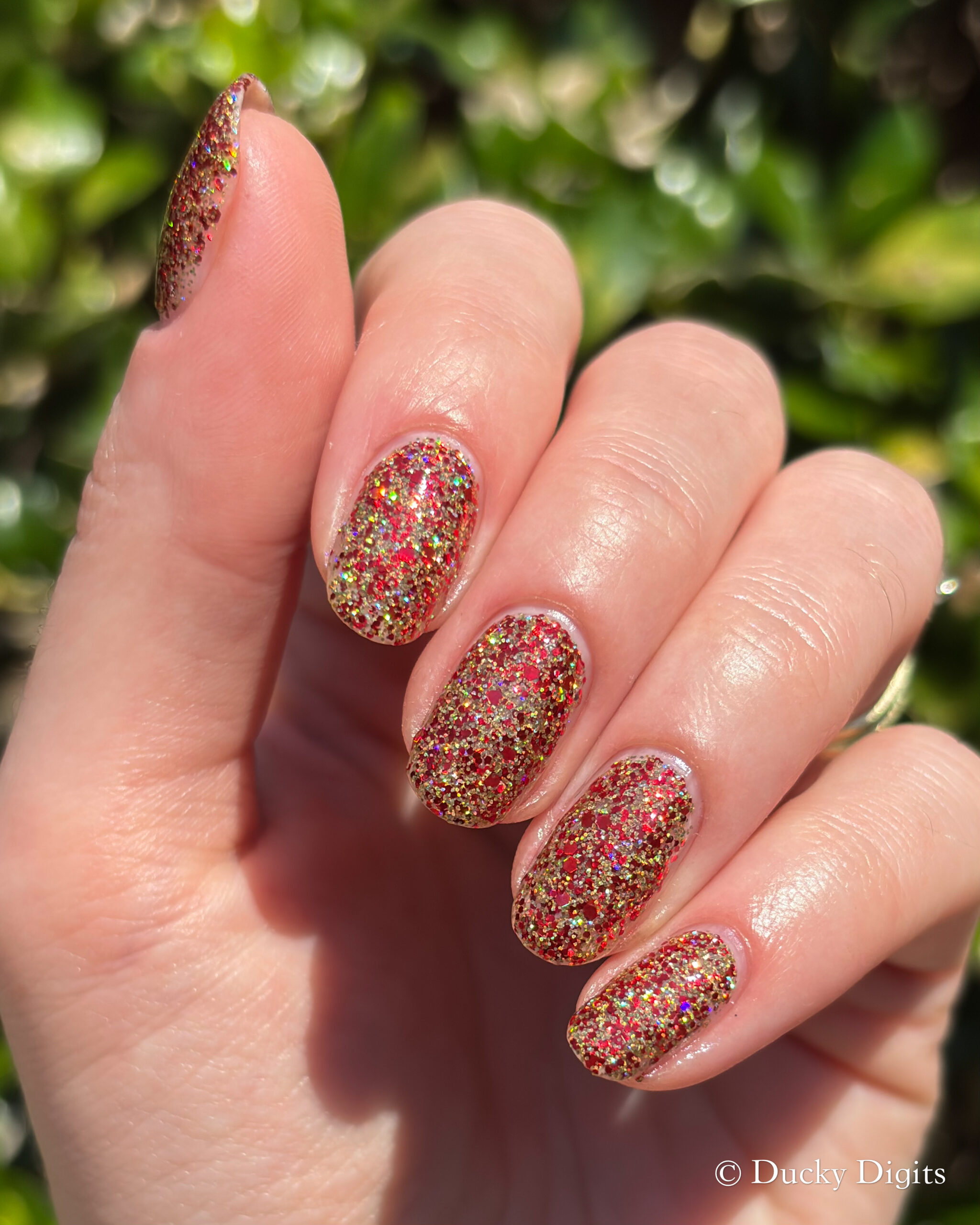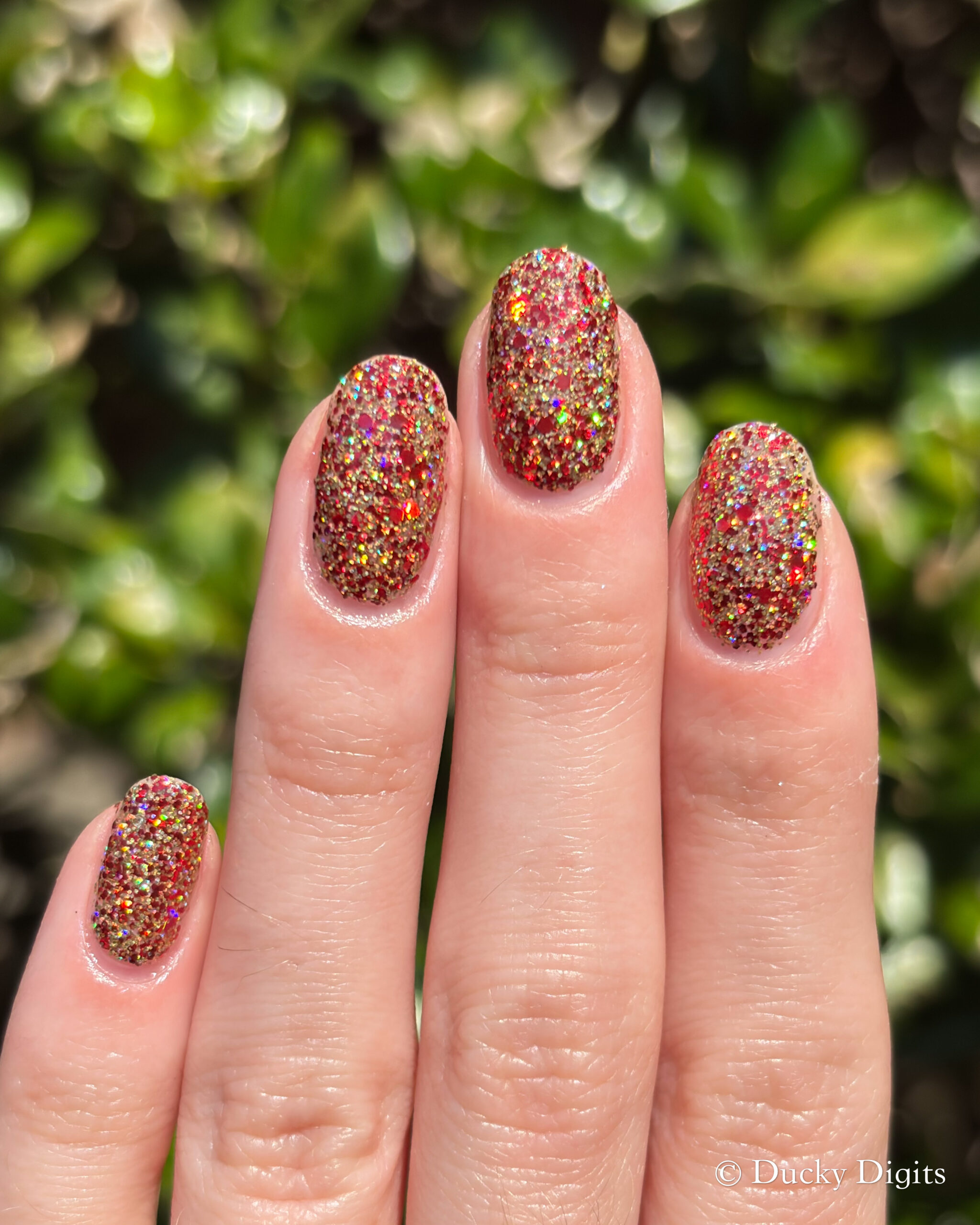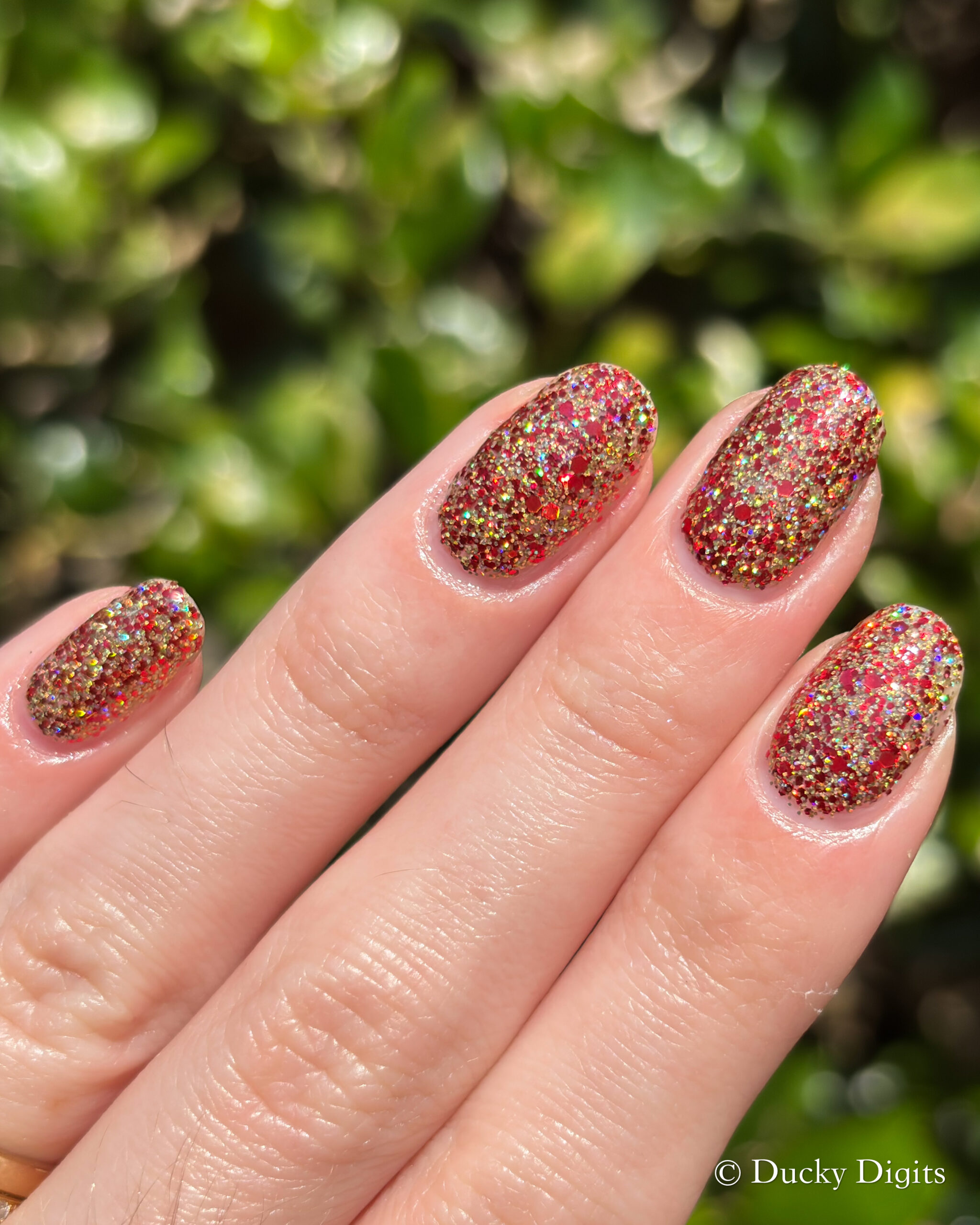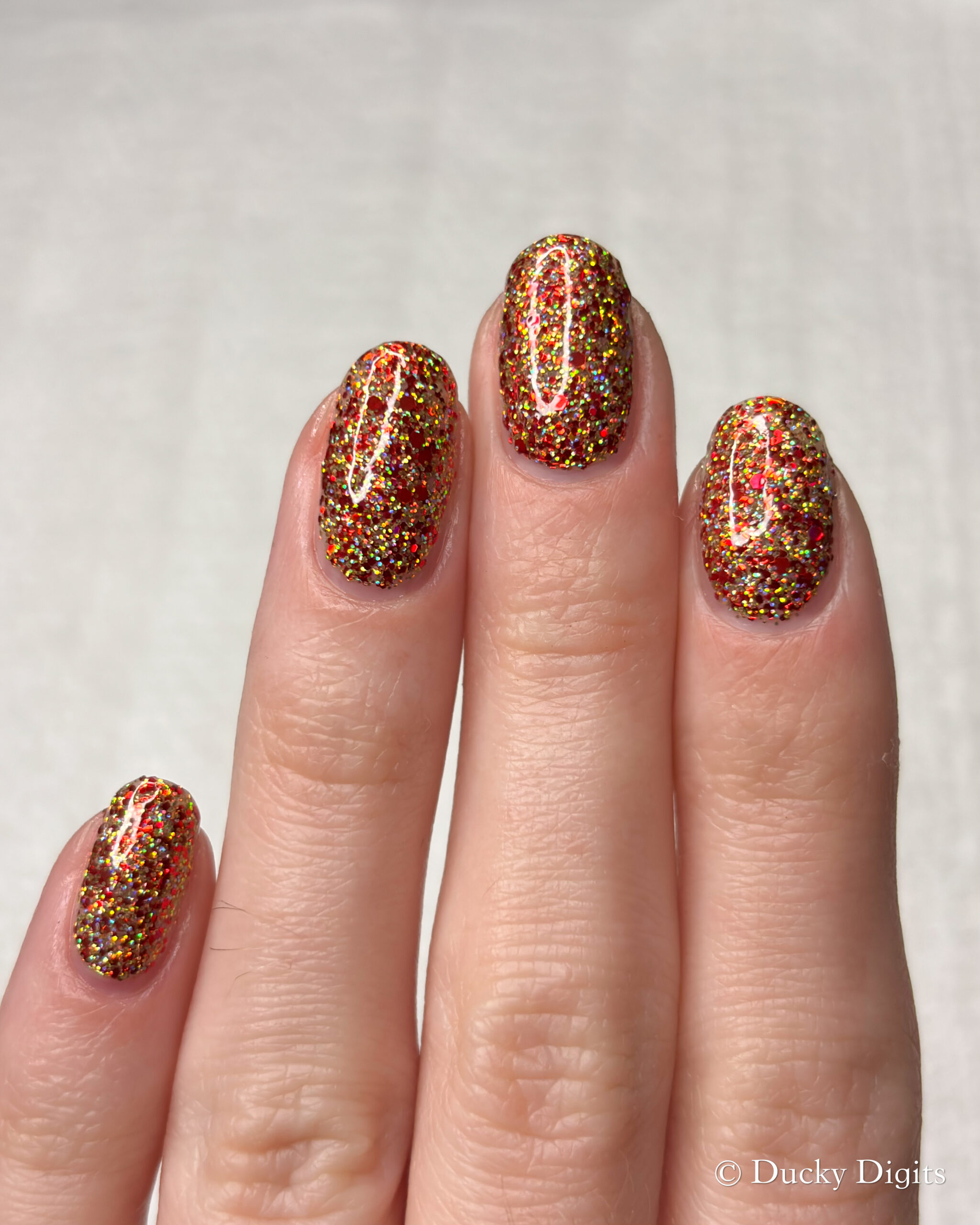 Queen Effin’ Bee is a clear-based glitter bomb loaded with red holo, red metallic and gold holo glitters in various sizes.