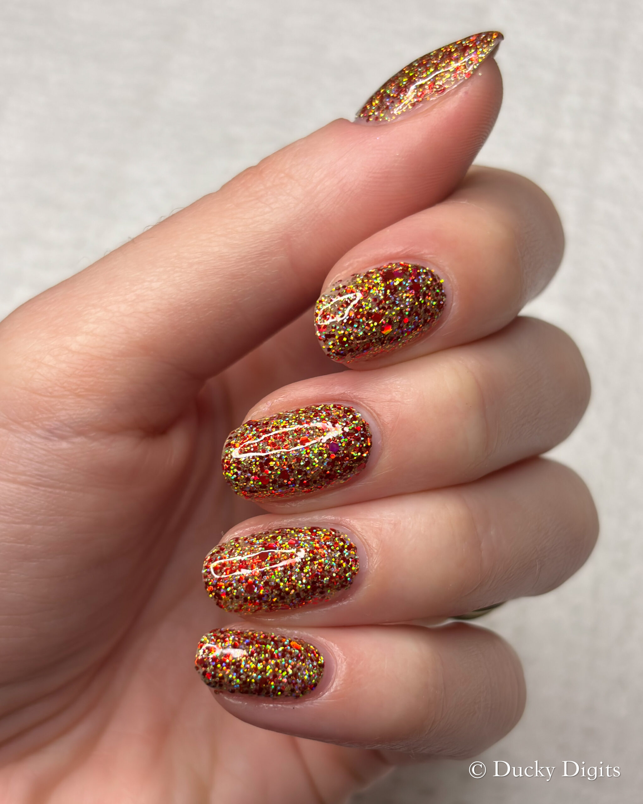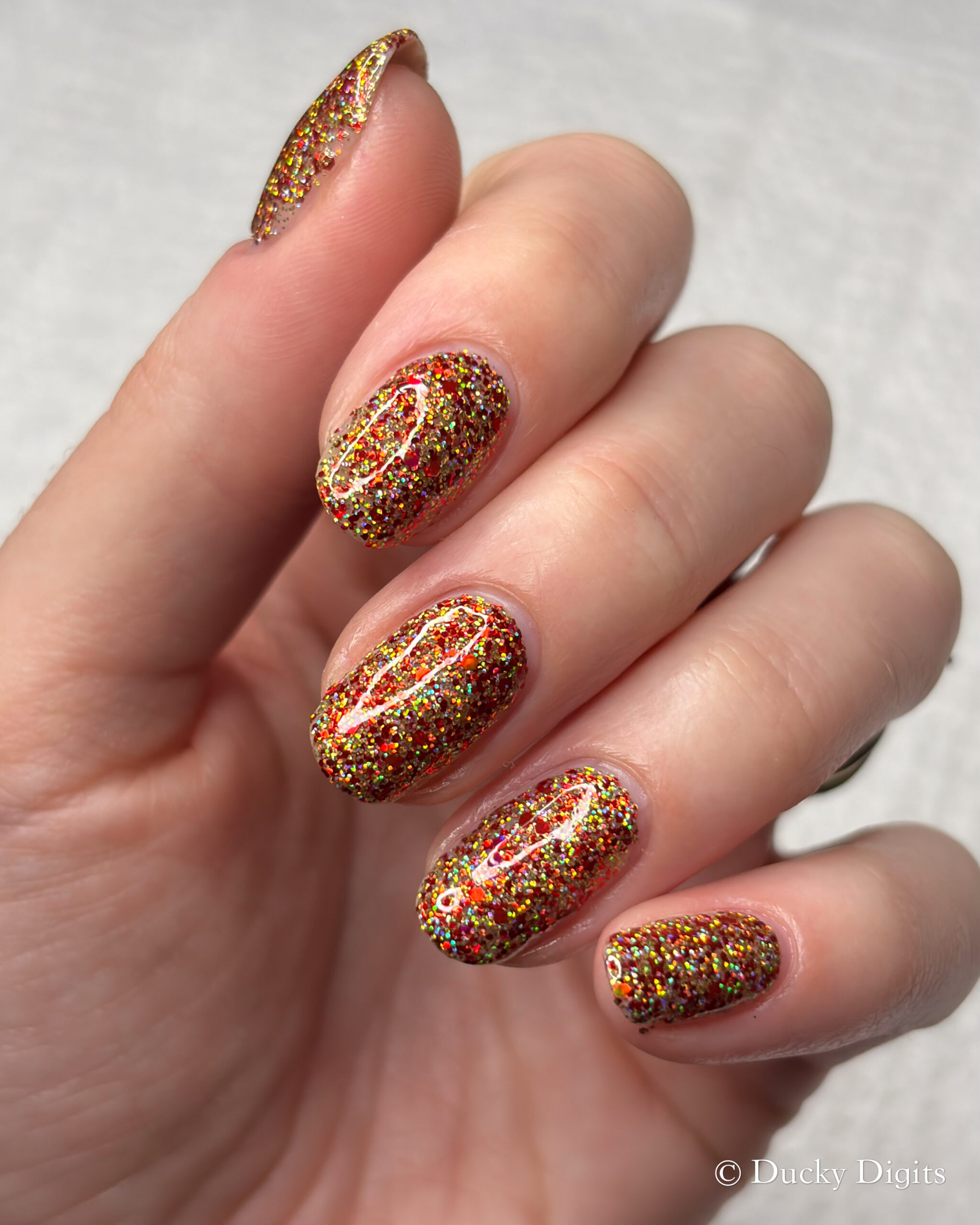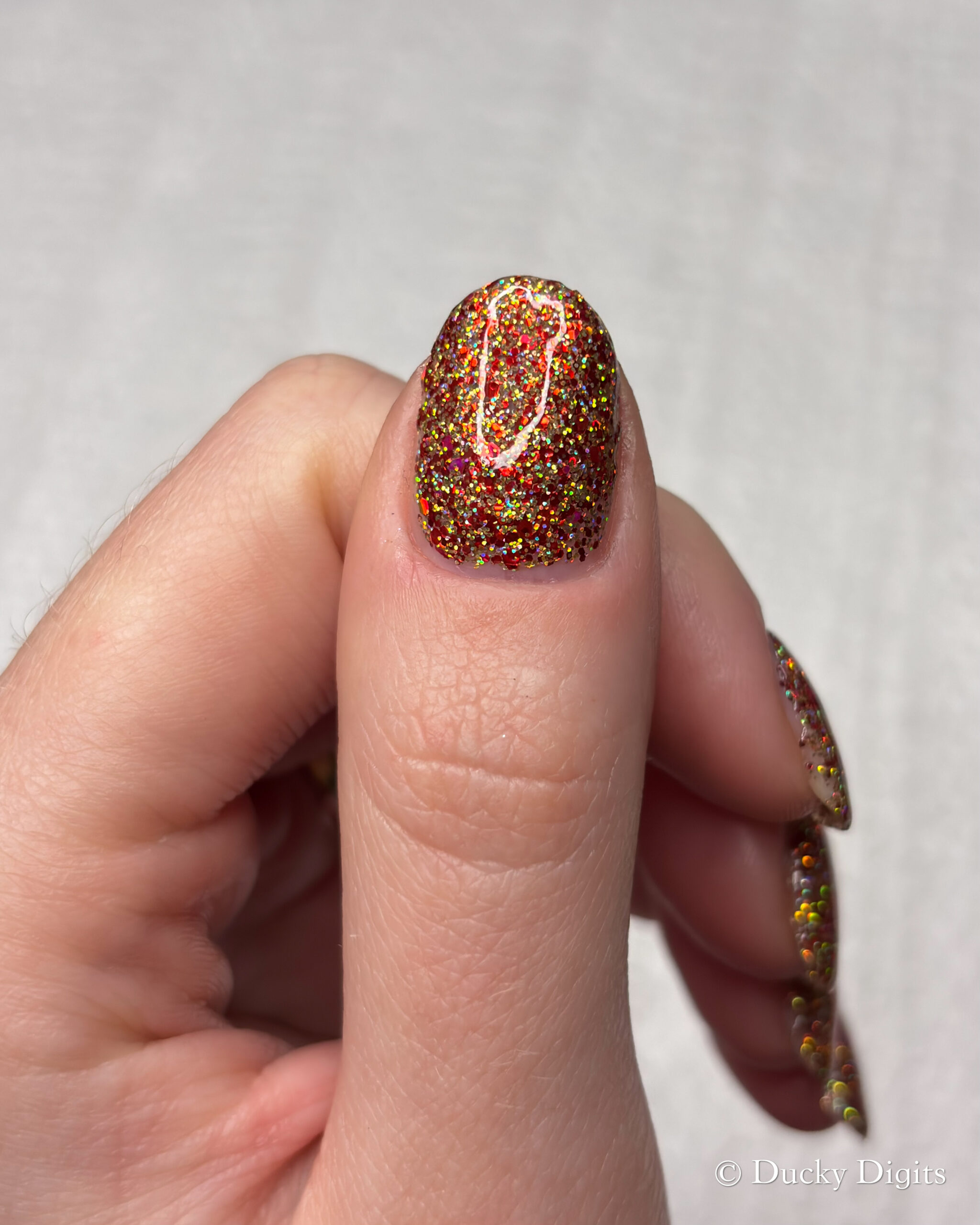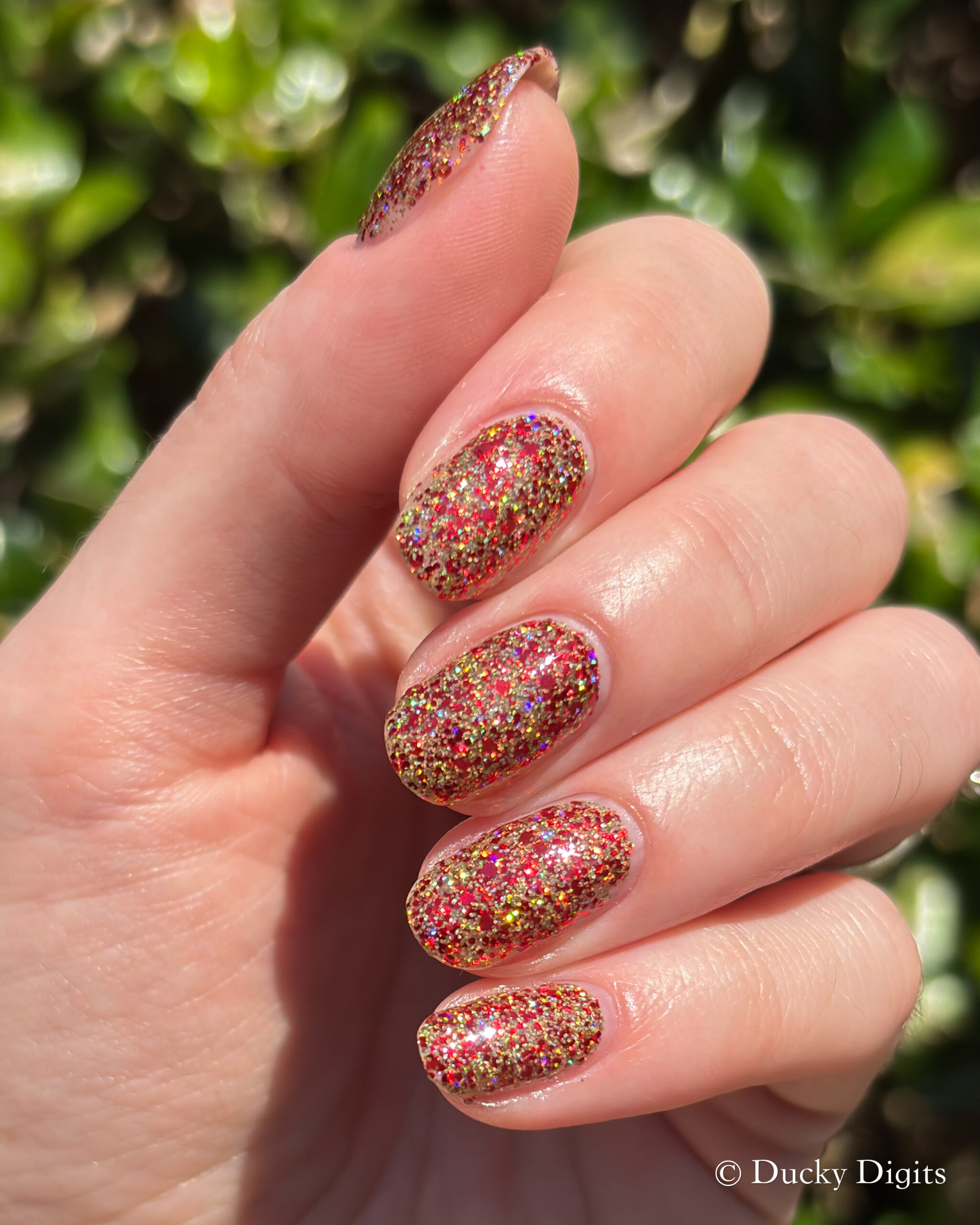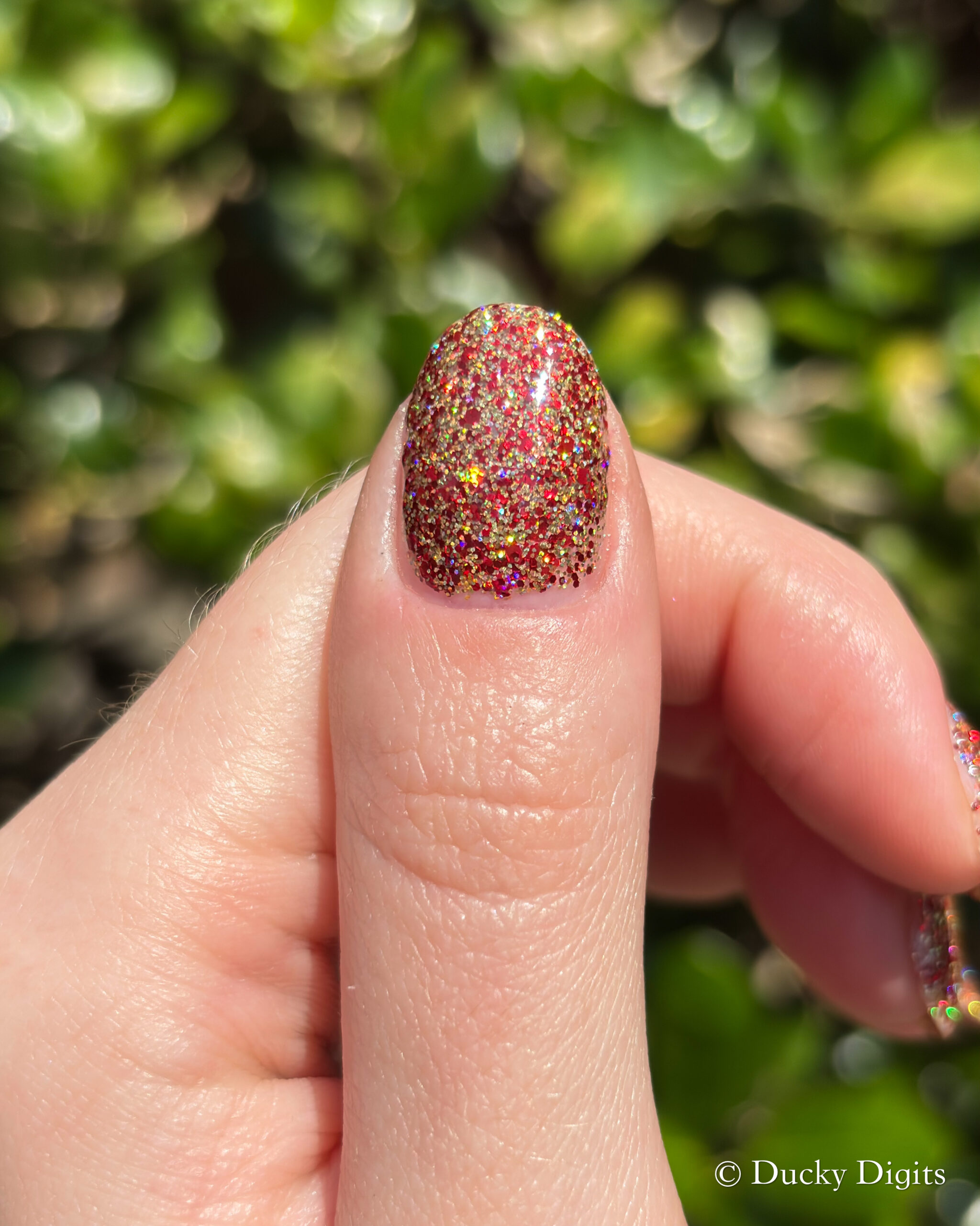 Queen Effin’ Bee is a clear-based glitter bomb loaded with red holo, red metallic and gold holo glitters in various sizes.