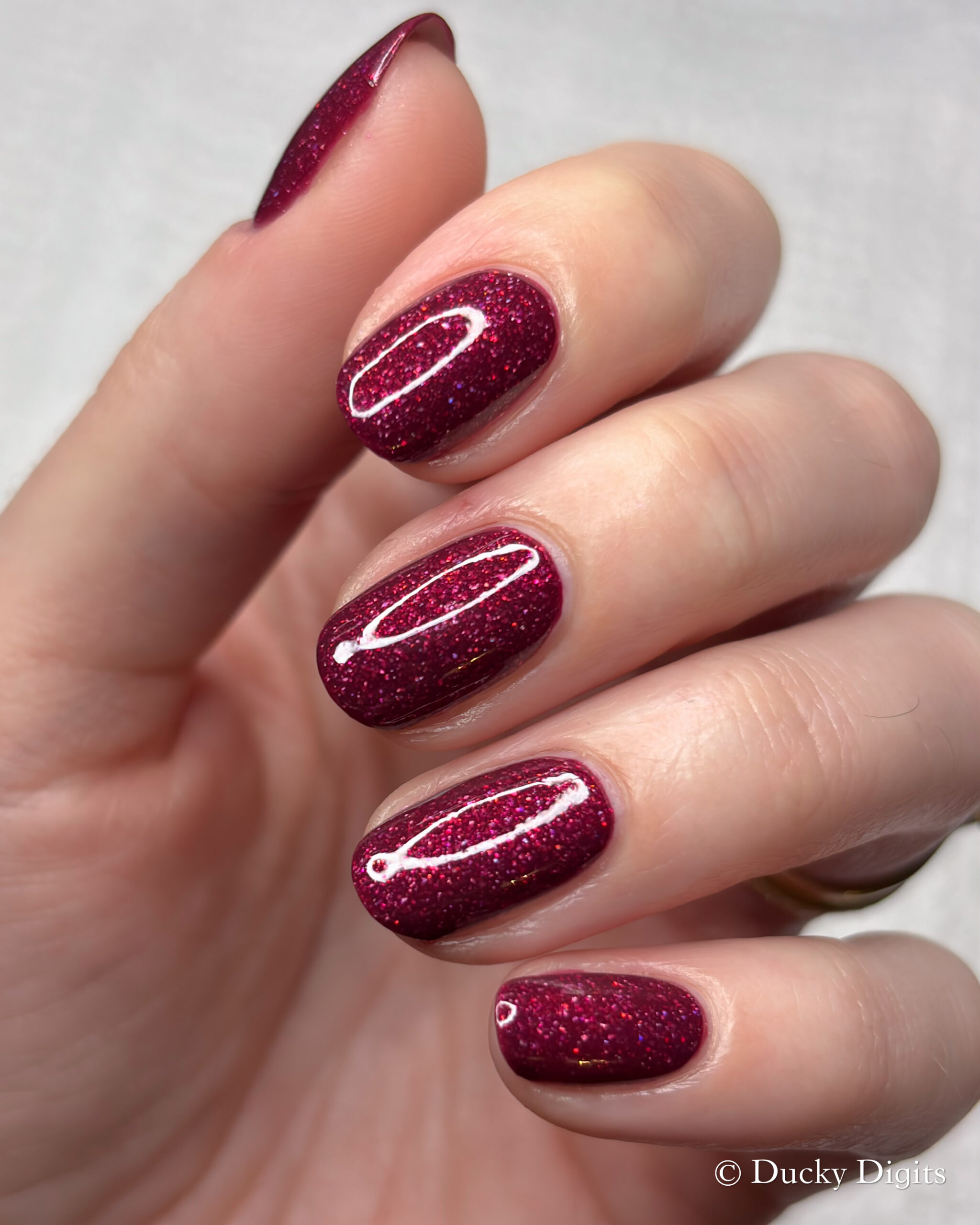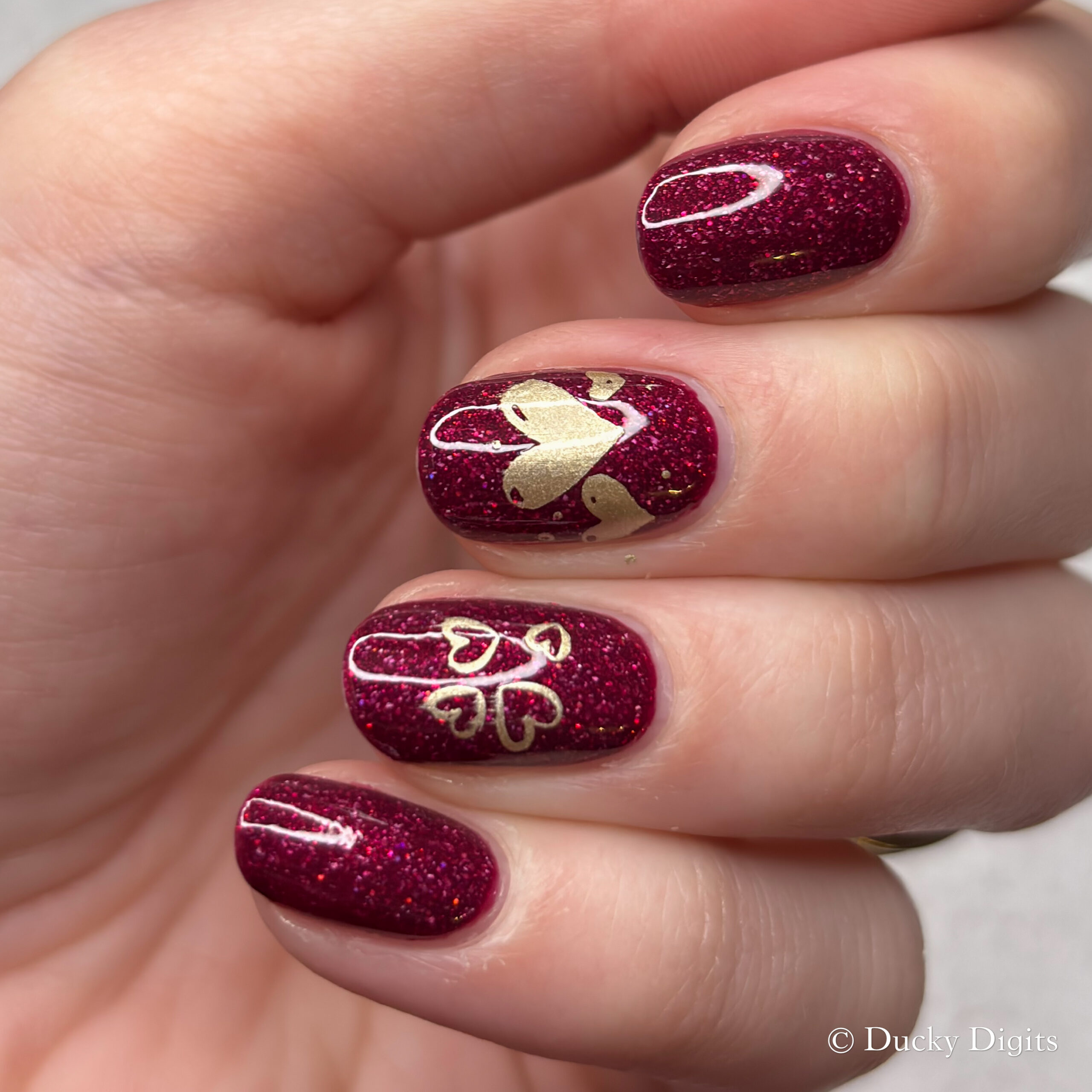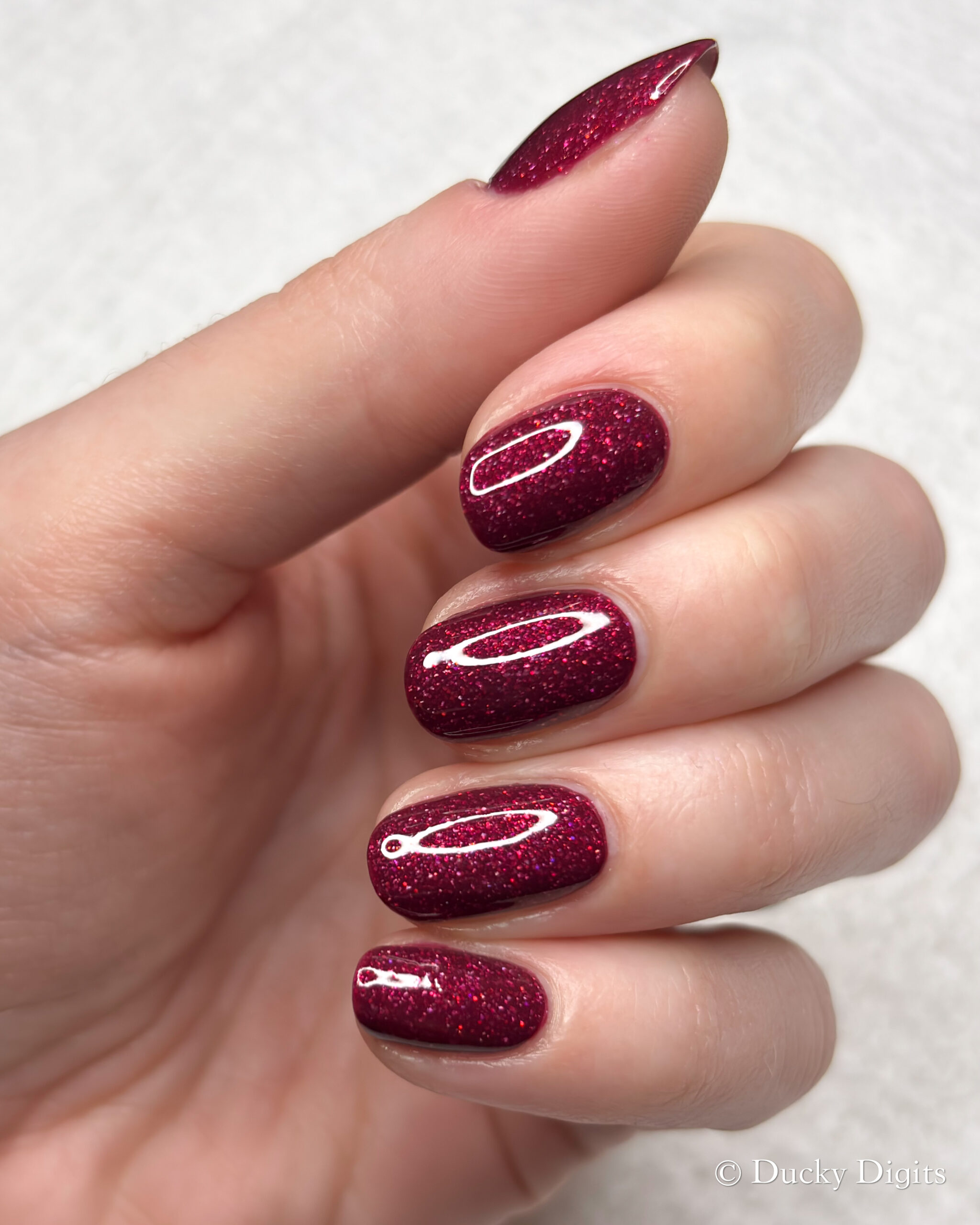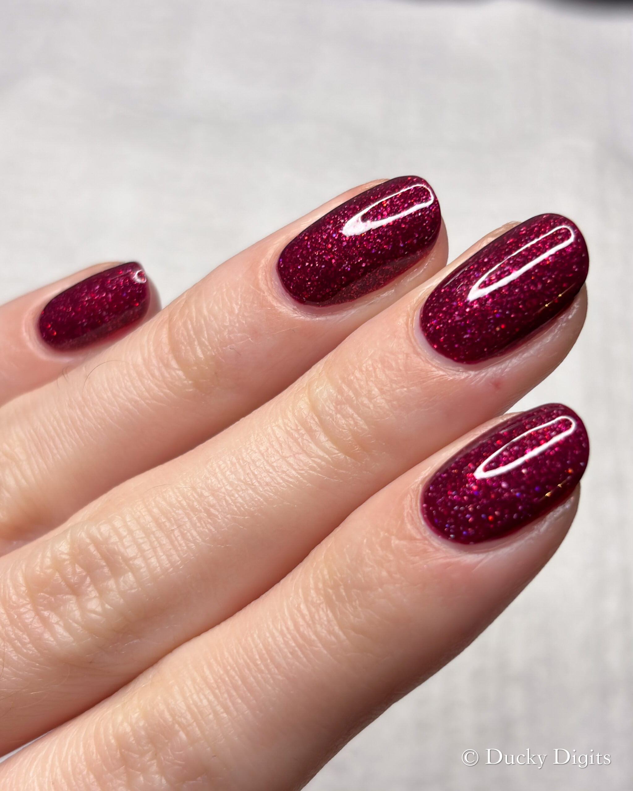 Queen Effin’ Bee is a clear-based glitter bomb loaded with red holo, red metallic and gold holo glitters in various sizes.