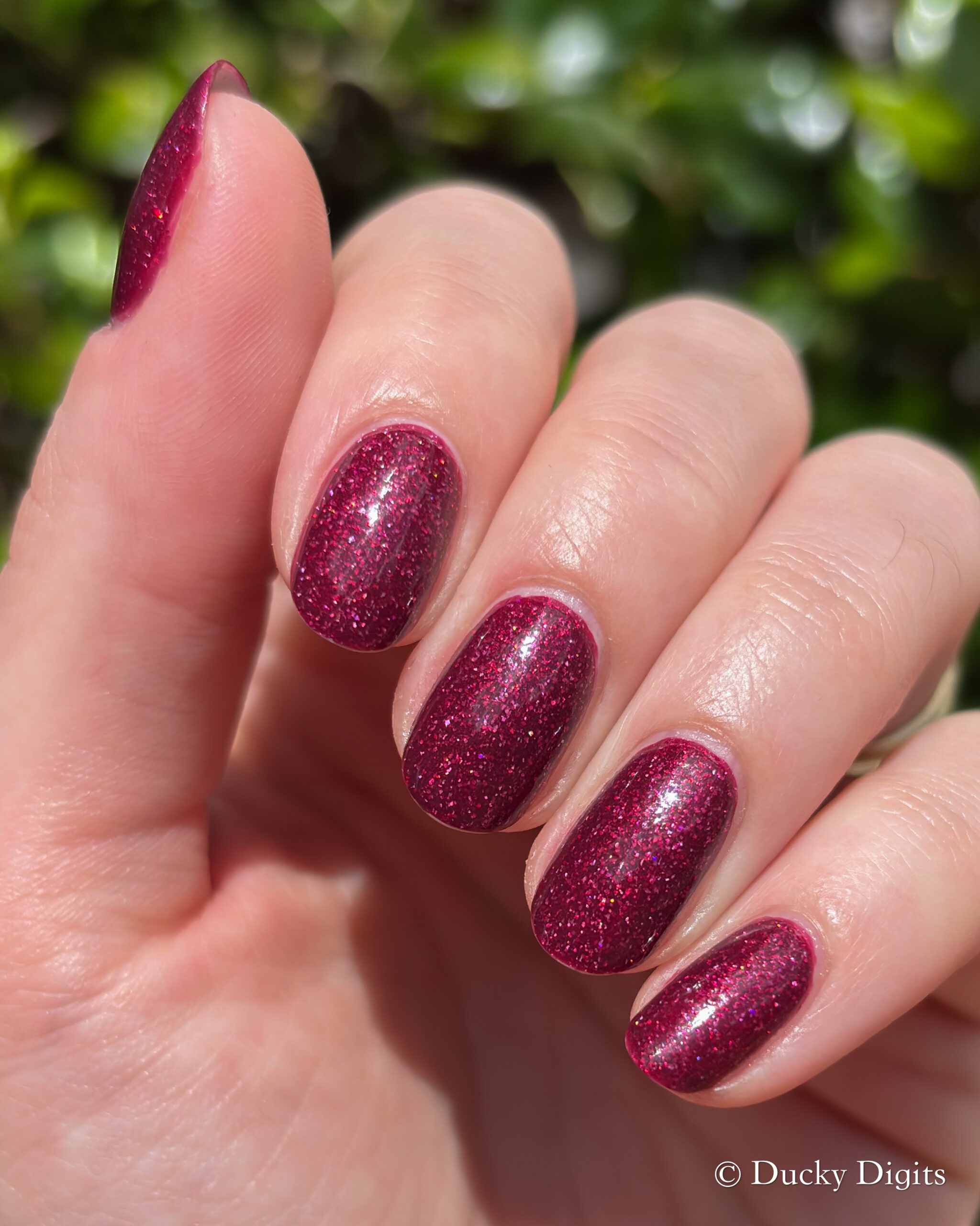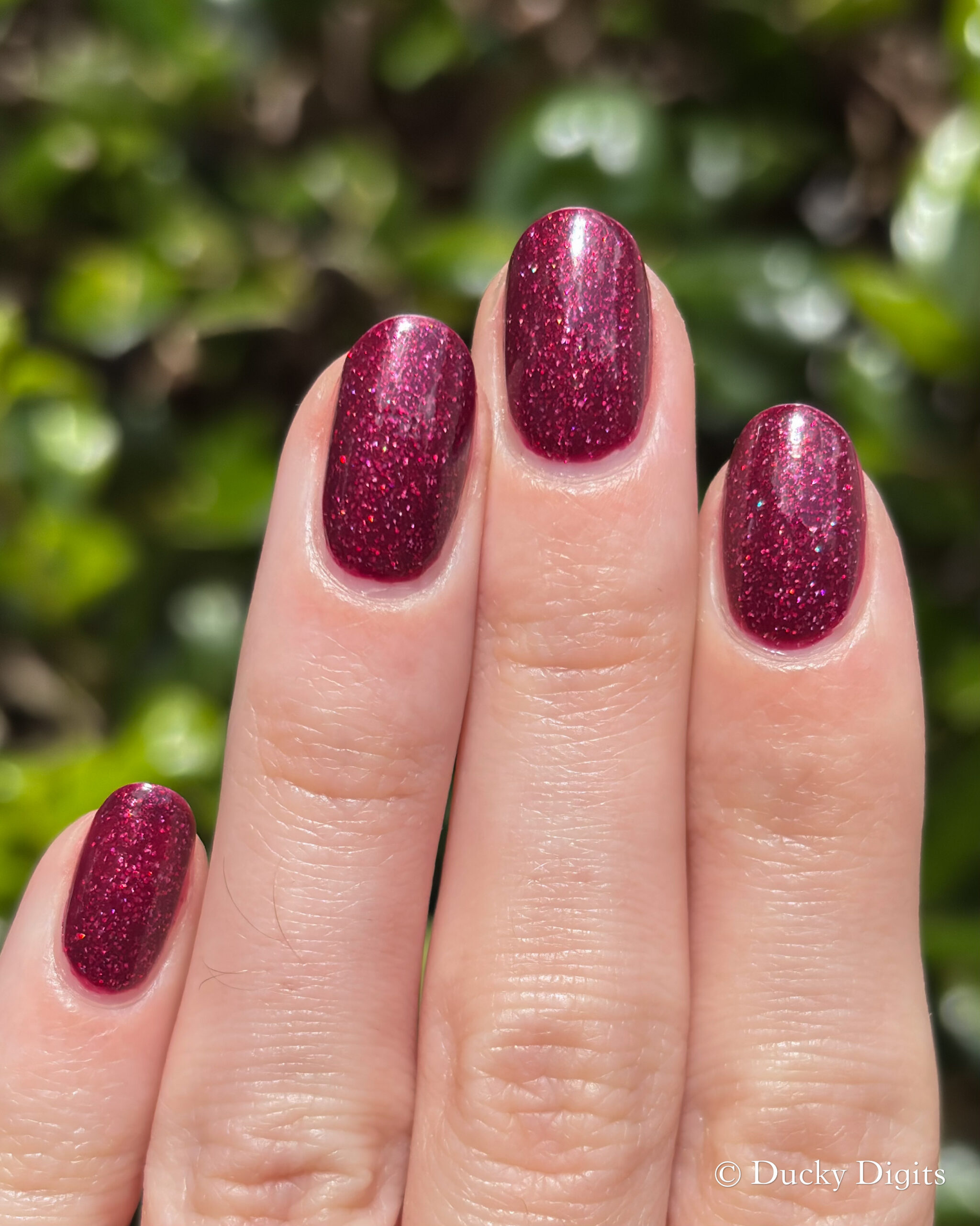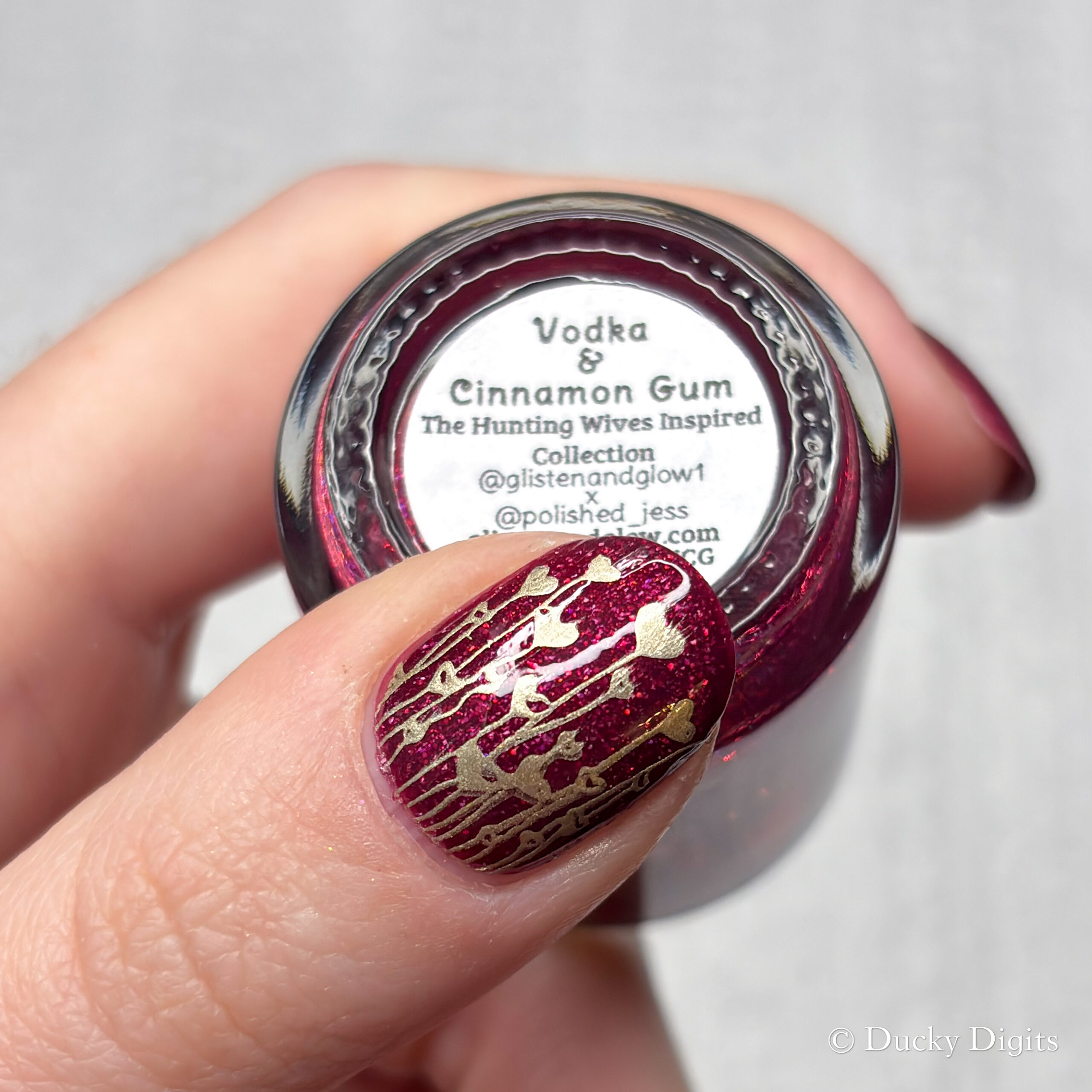 Vodka & Cinnamon Gum is a cranberry polish with color shifting shimmer that shifts pink/orange/red, with red holo microglitter and a shot glass full of holo flakes.