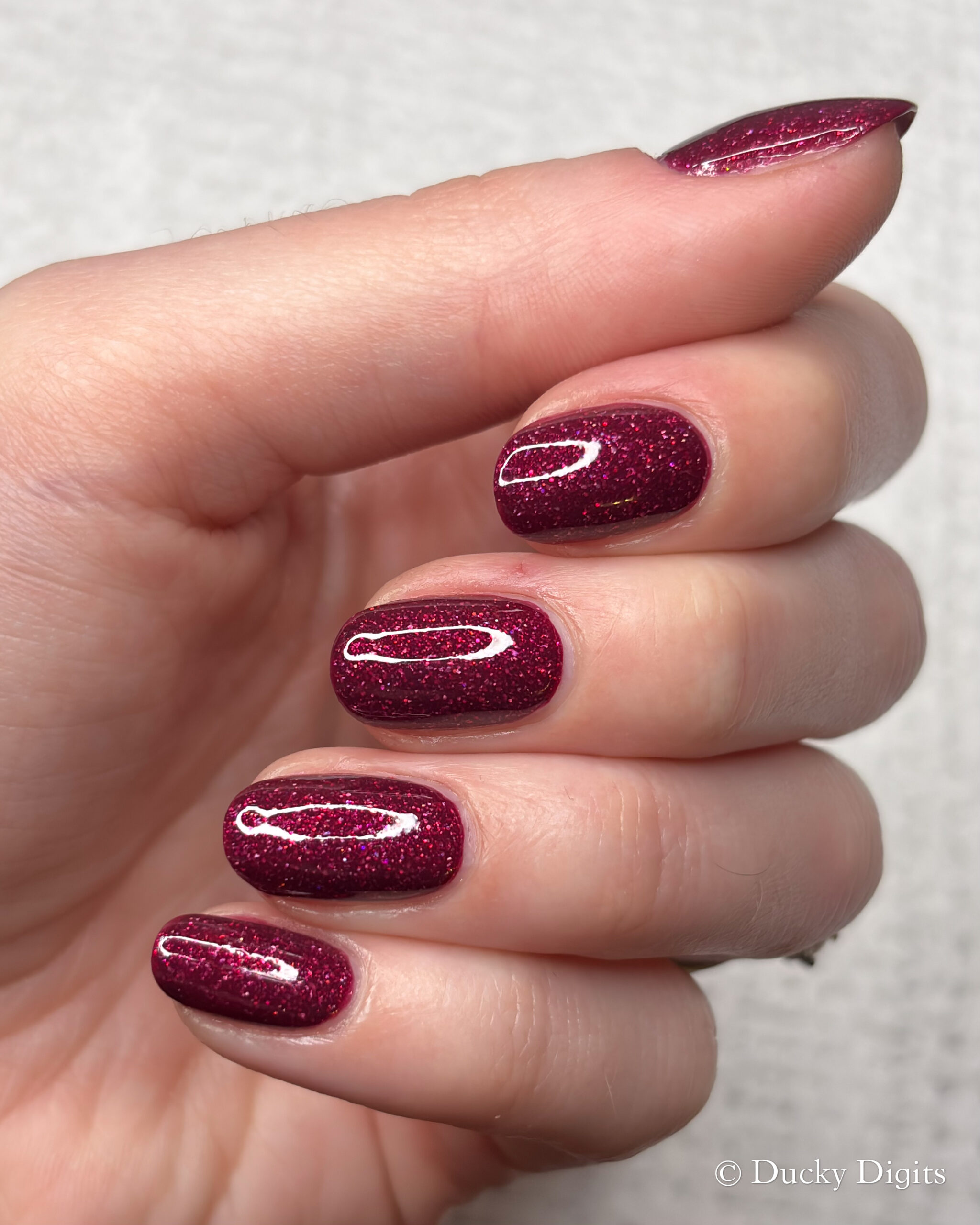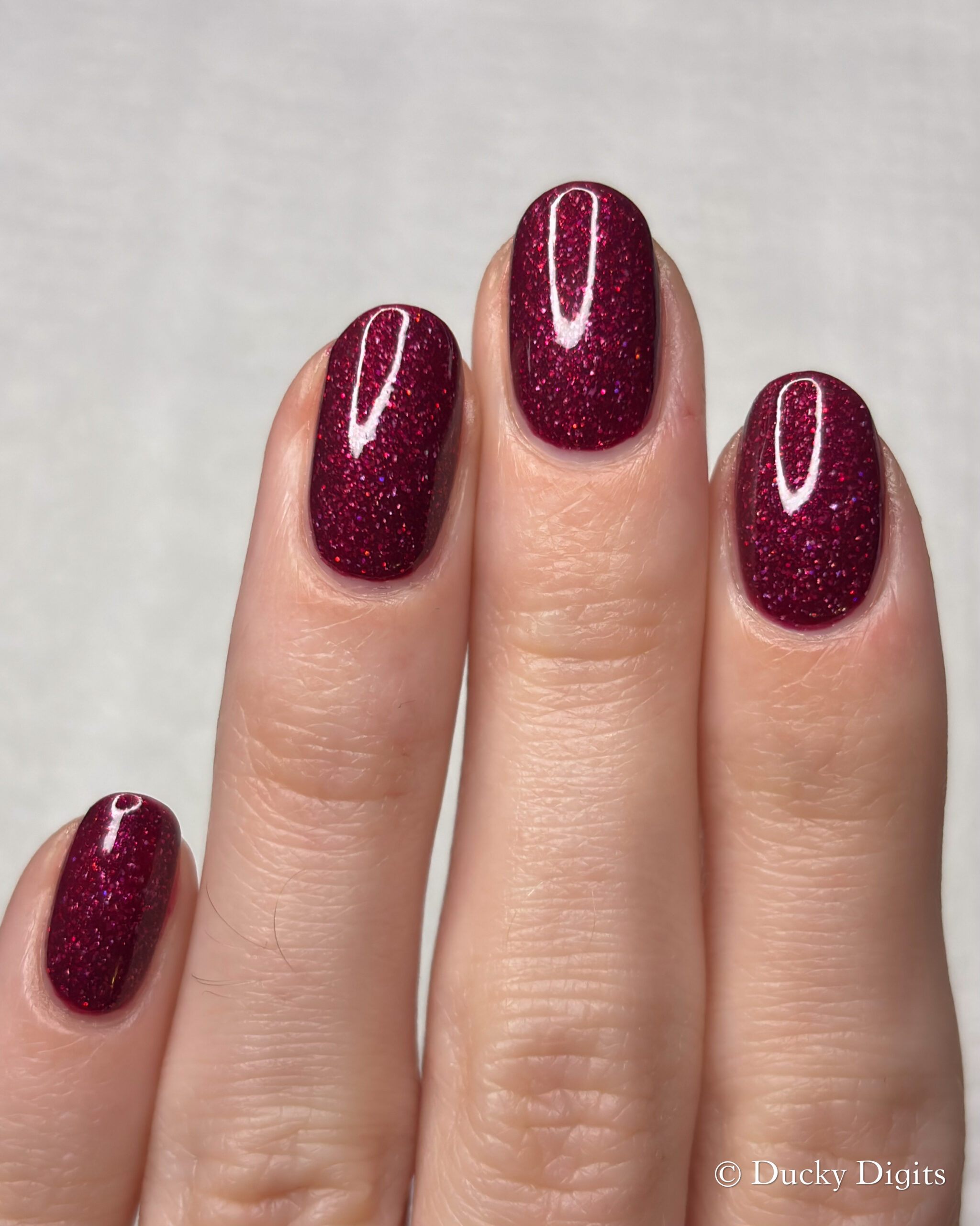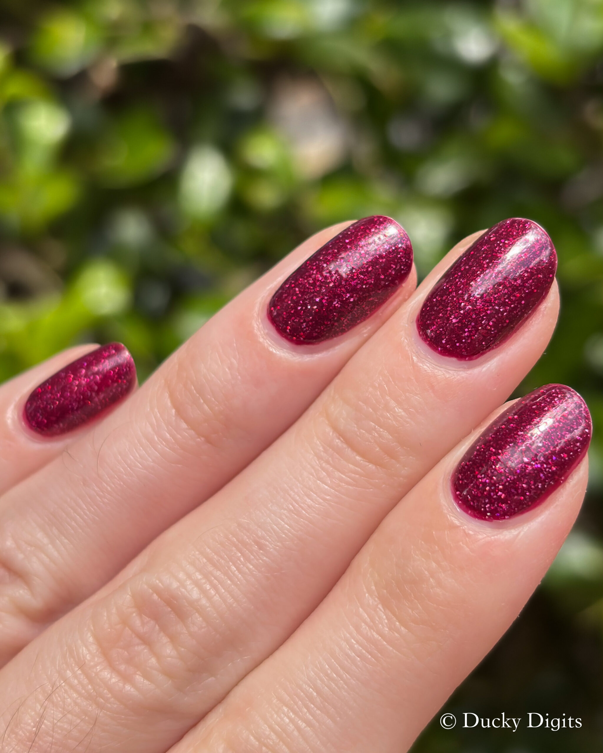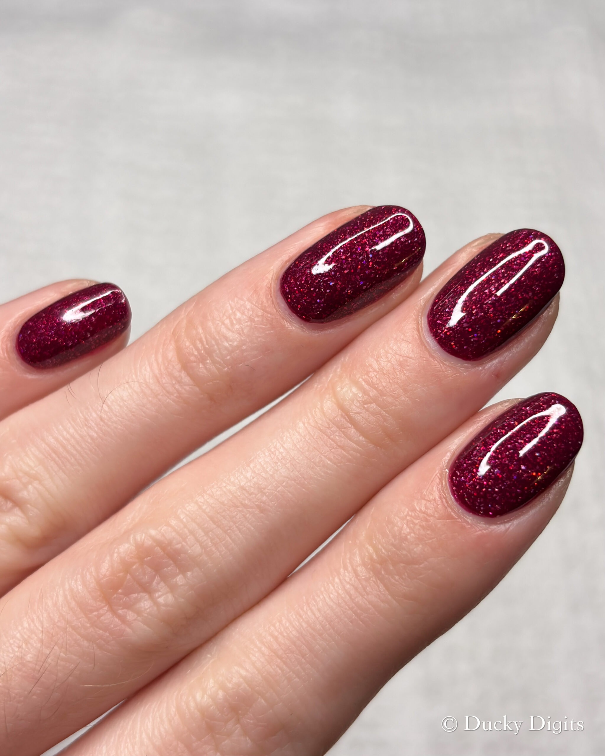 Vodka & Cinnamon Gum is a cranberry polish with color shifting shimmer that shifts pink/orange/red, with red holo microglitter and a shot glass full of holo flakes.