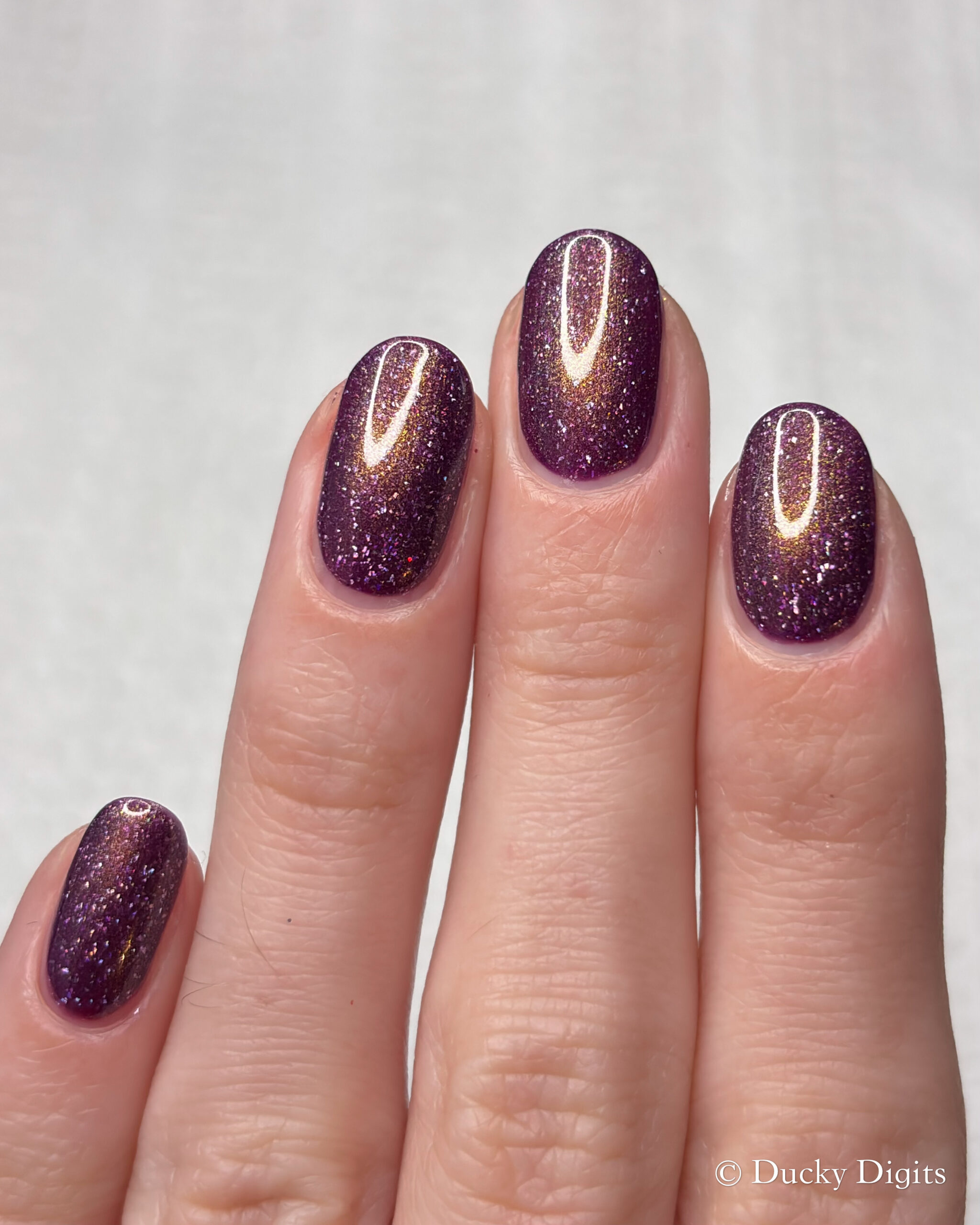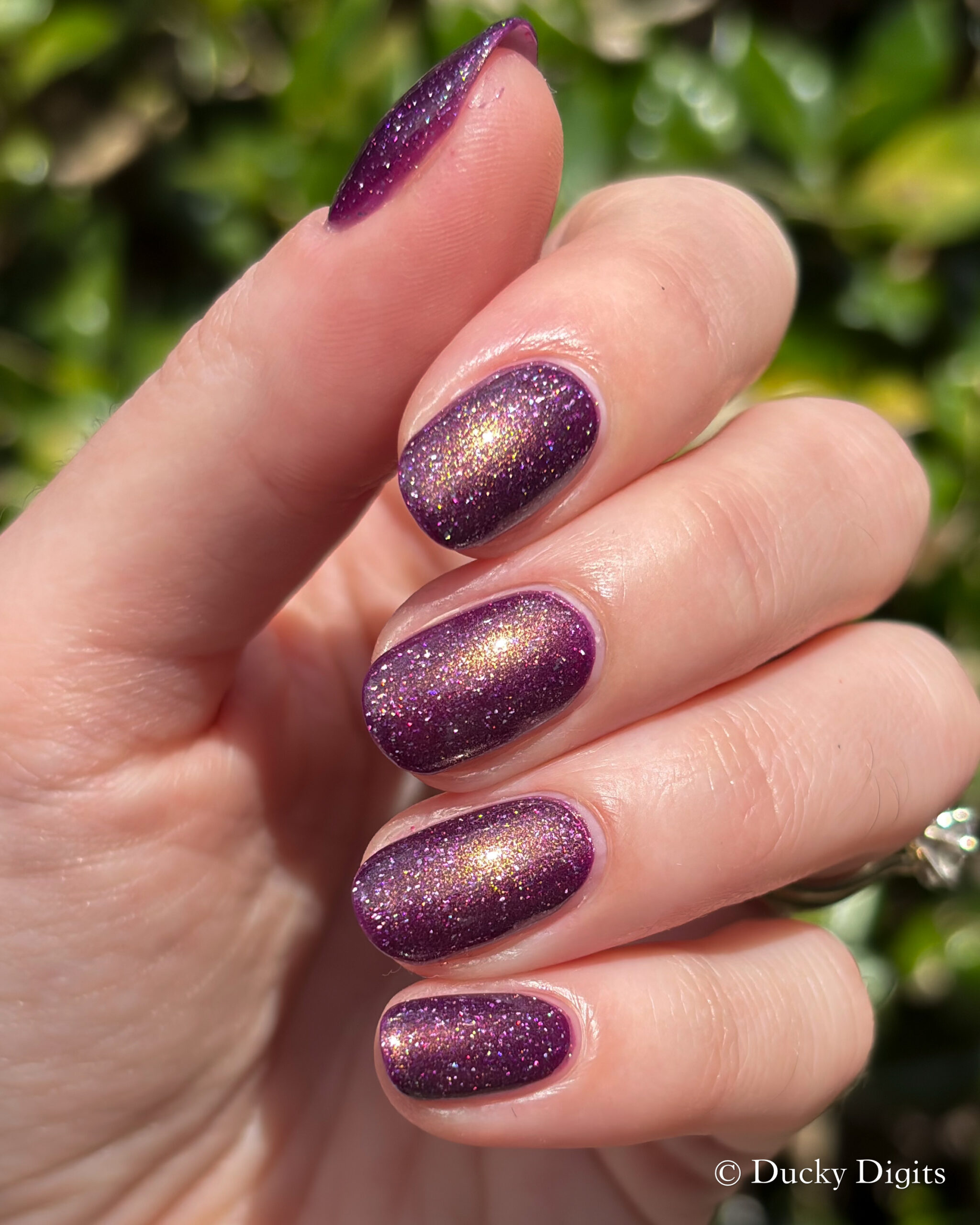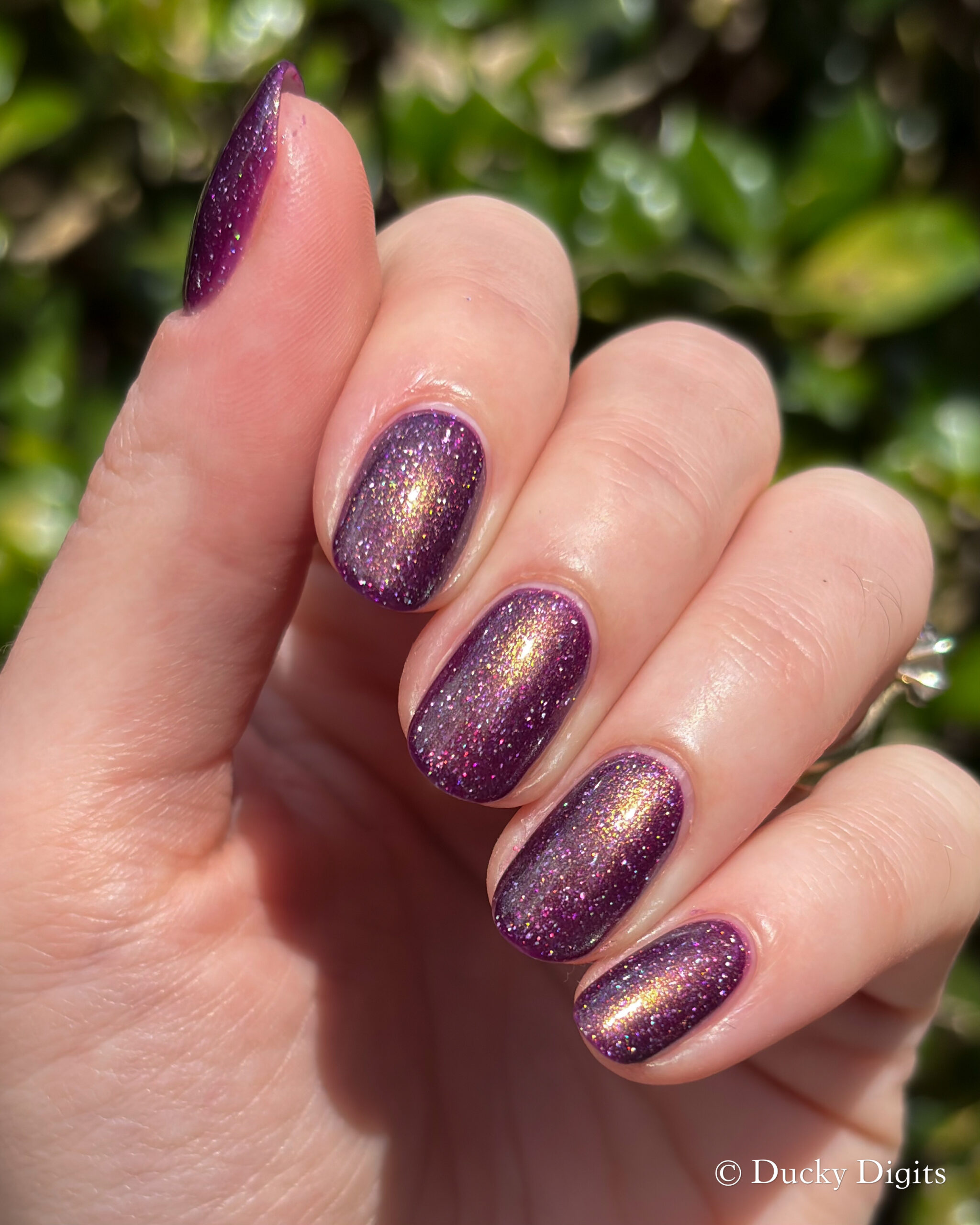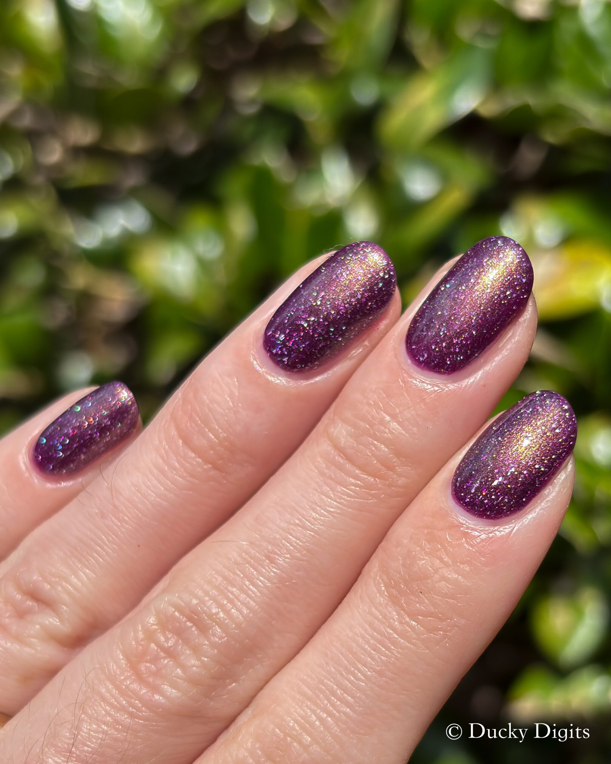 Sweet As Pie is a plum purple jelly polish with color-shifting shimmers that shift gold/green and blue at extreme angles, and holo microflakes.