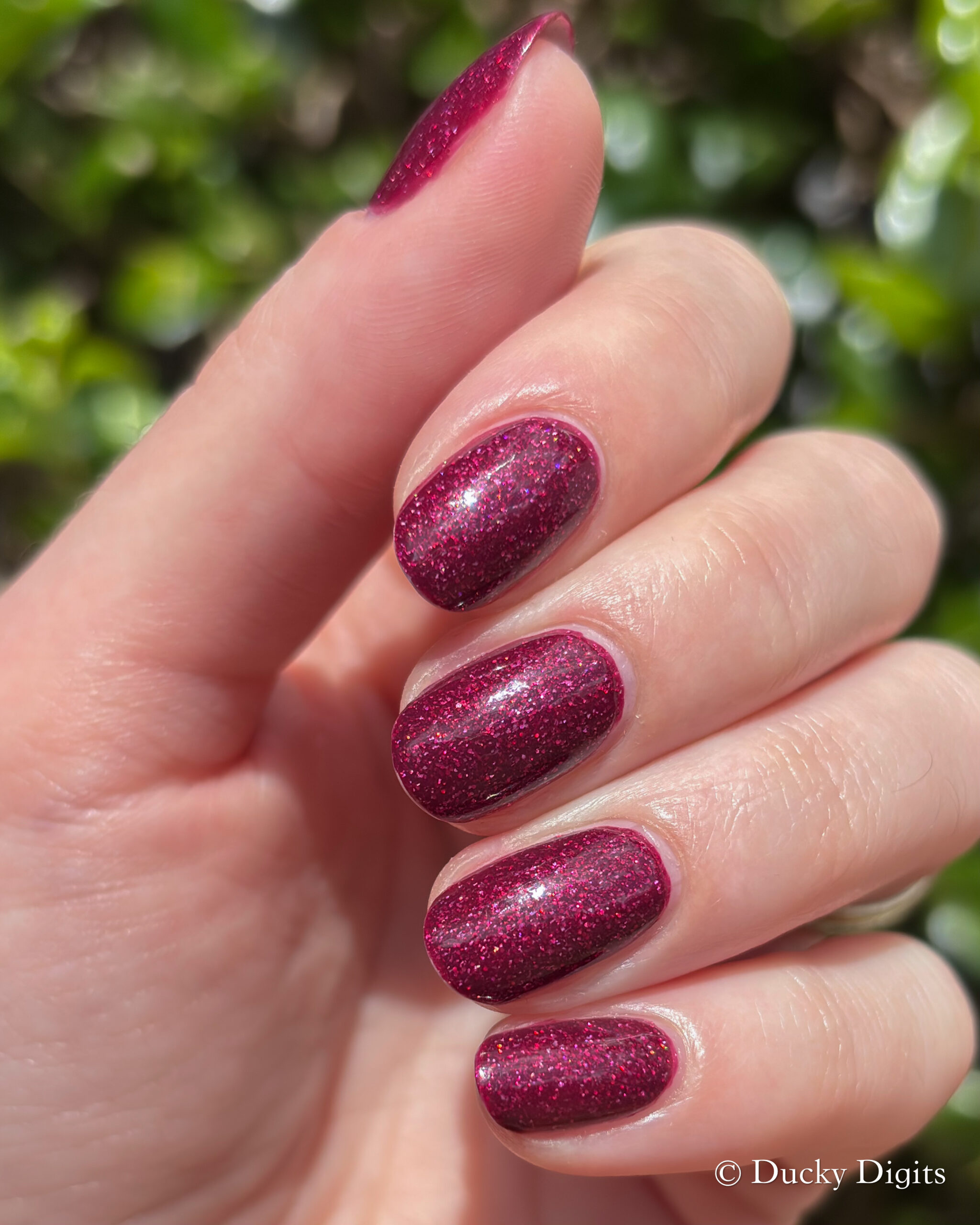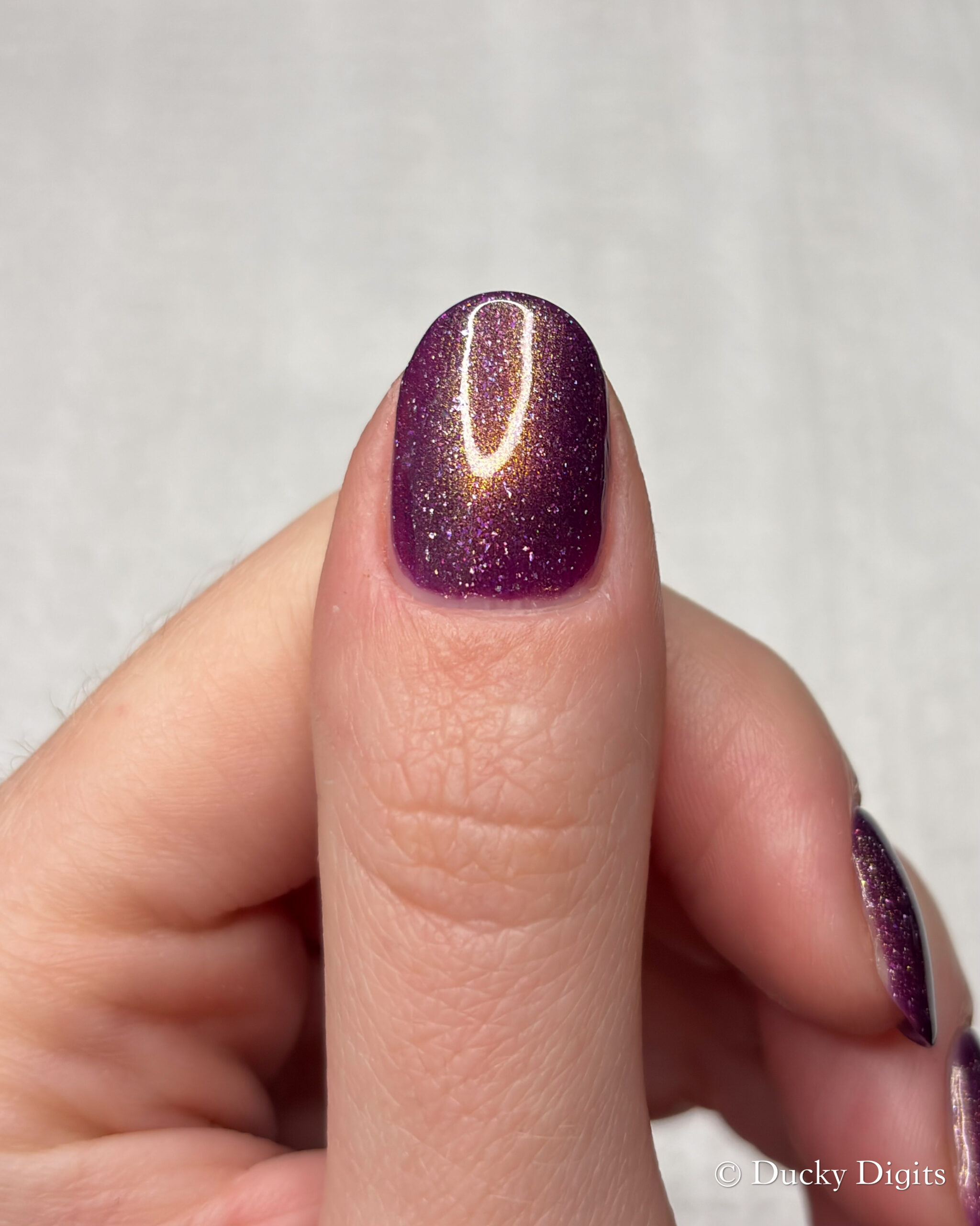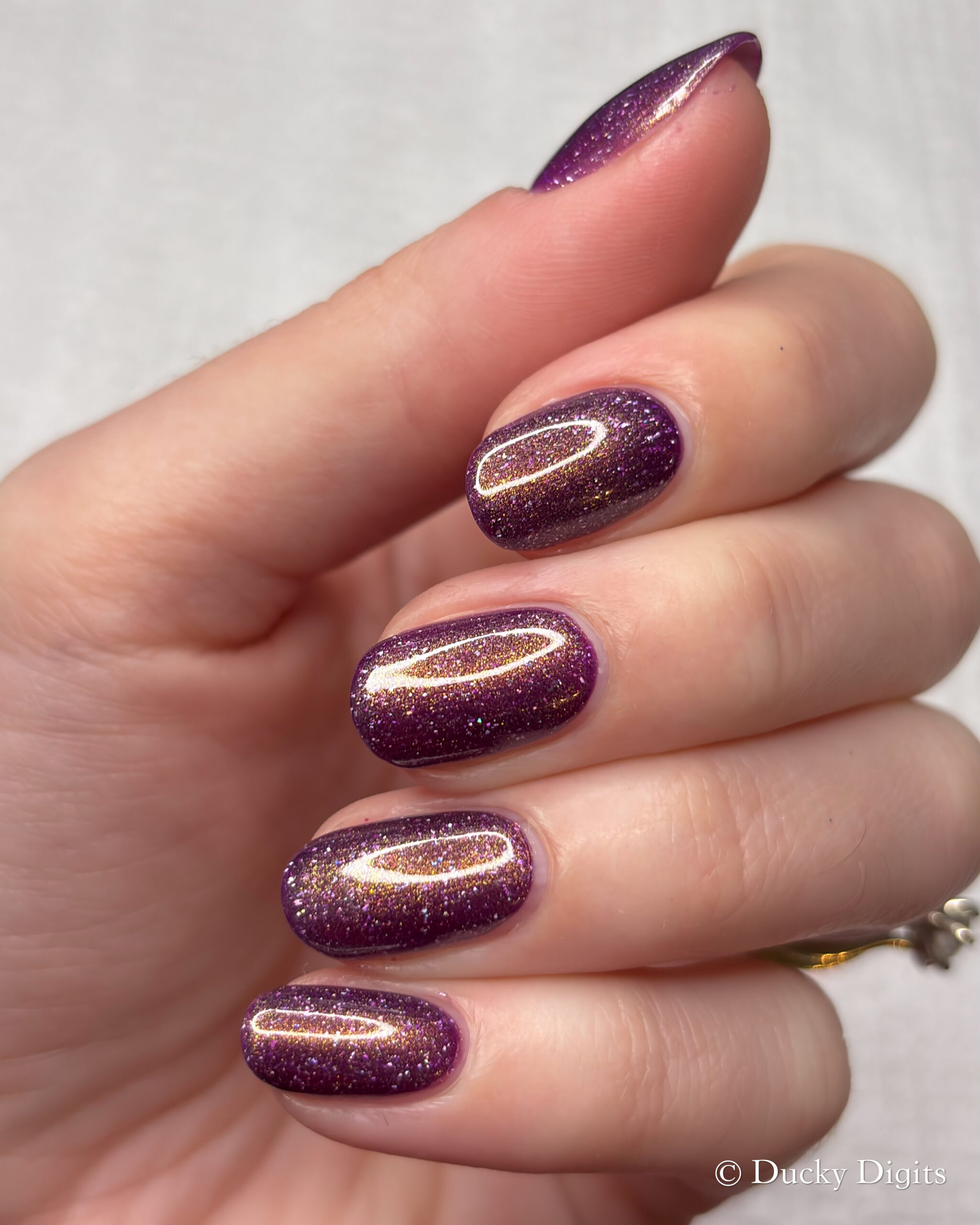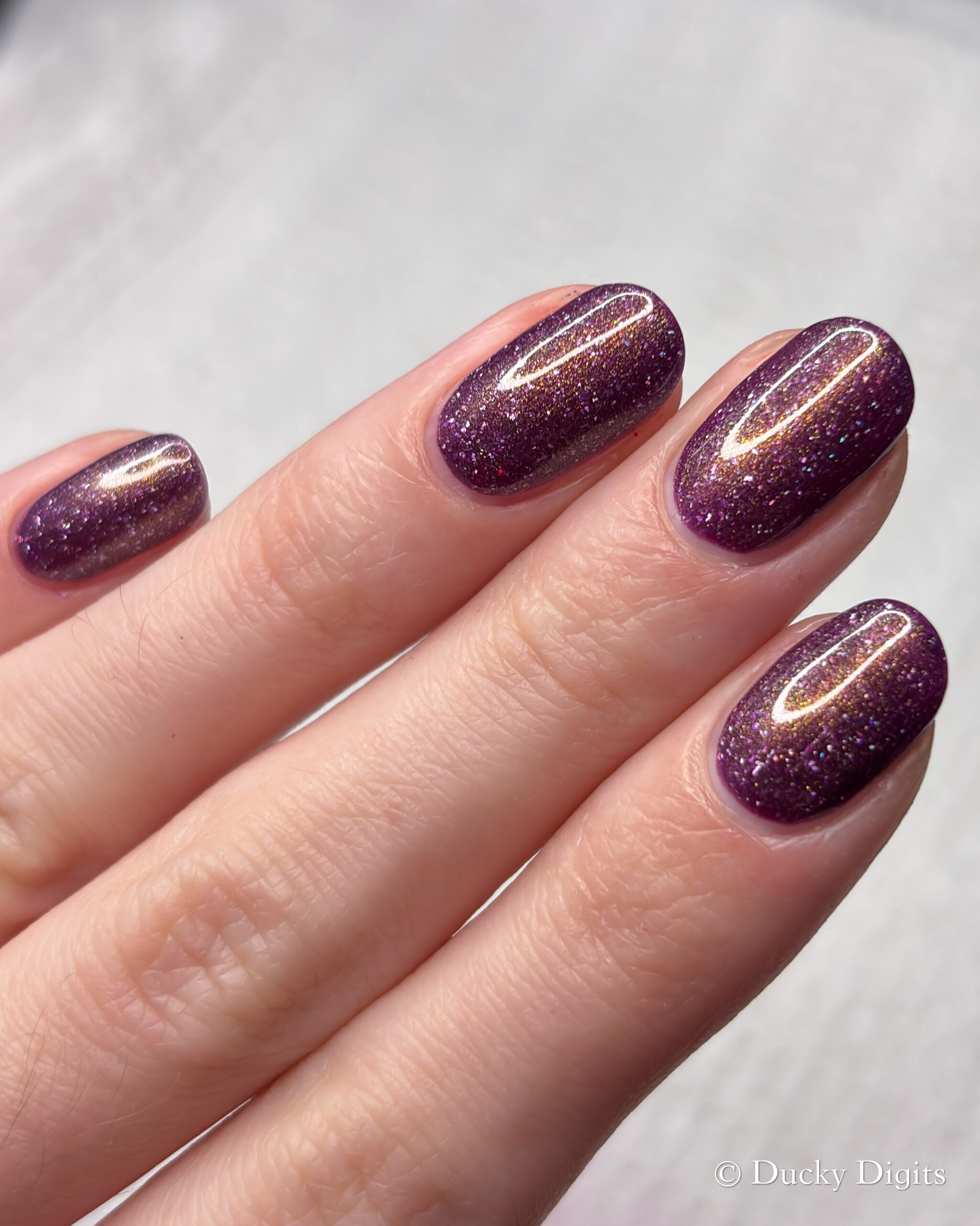 Sweet As Pie is a plum purple jelly polish with color-shifting shimmers that shift gold/green and blue at extreme angles, and holo microflakes.