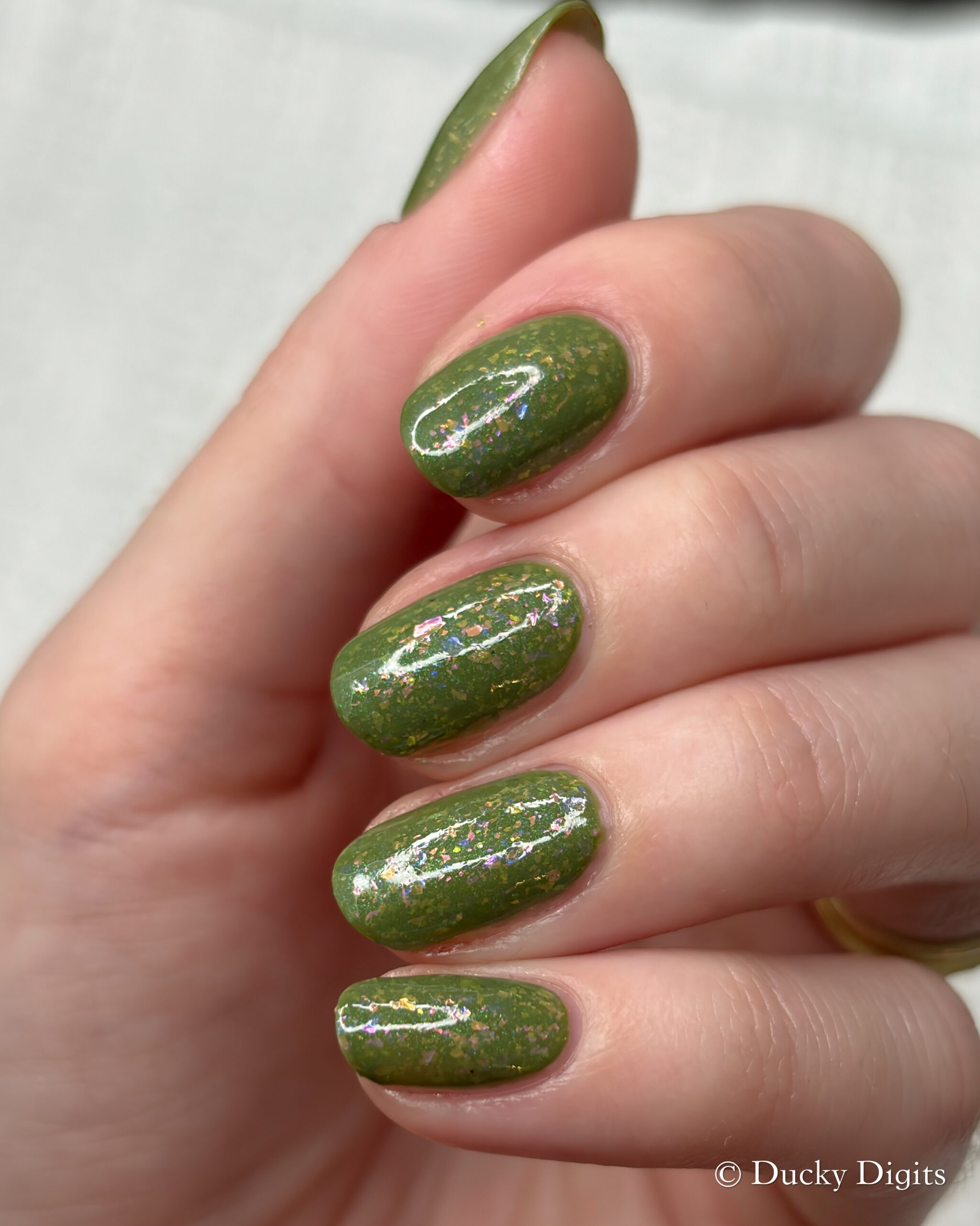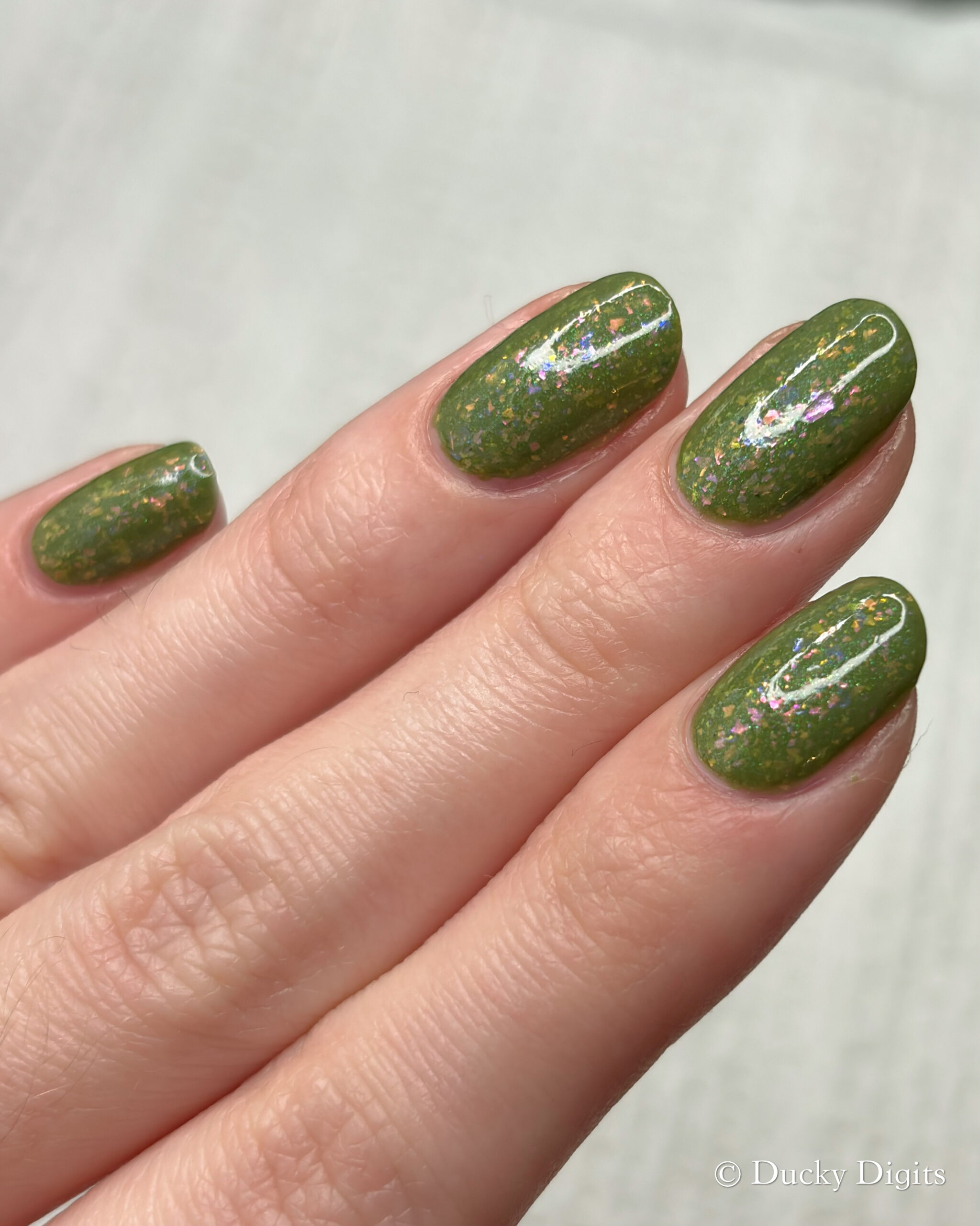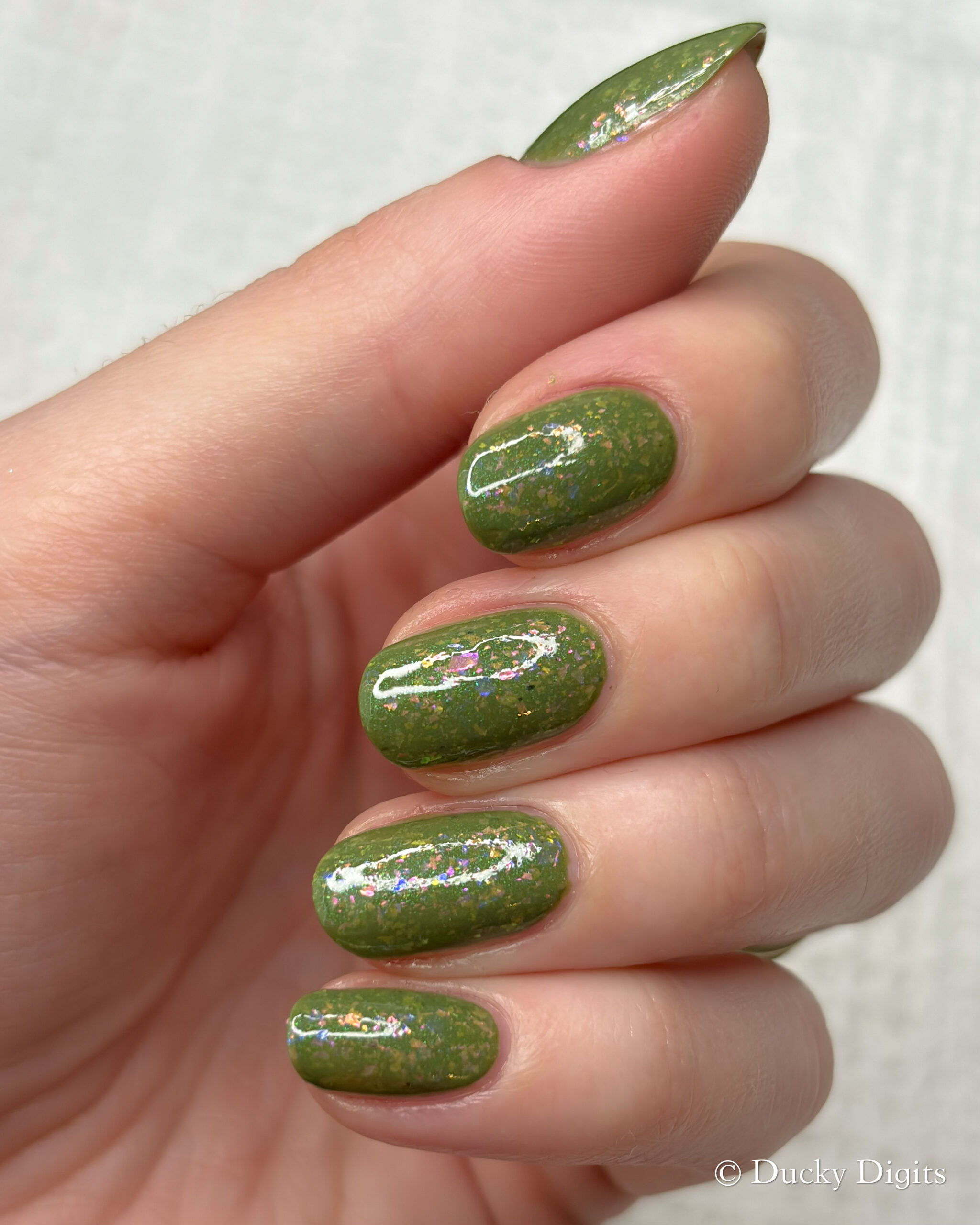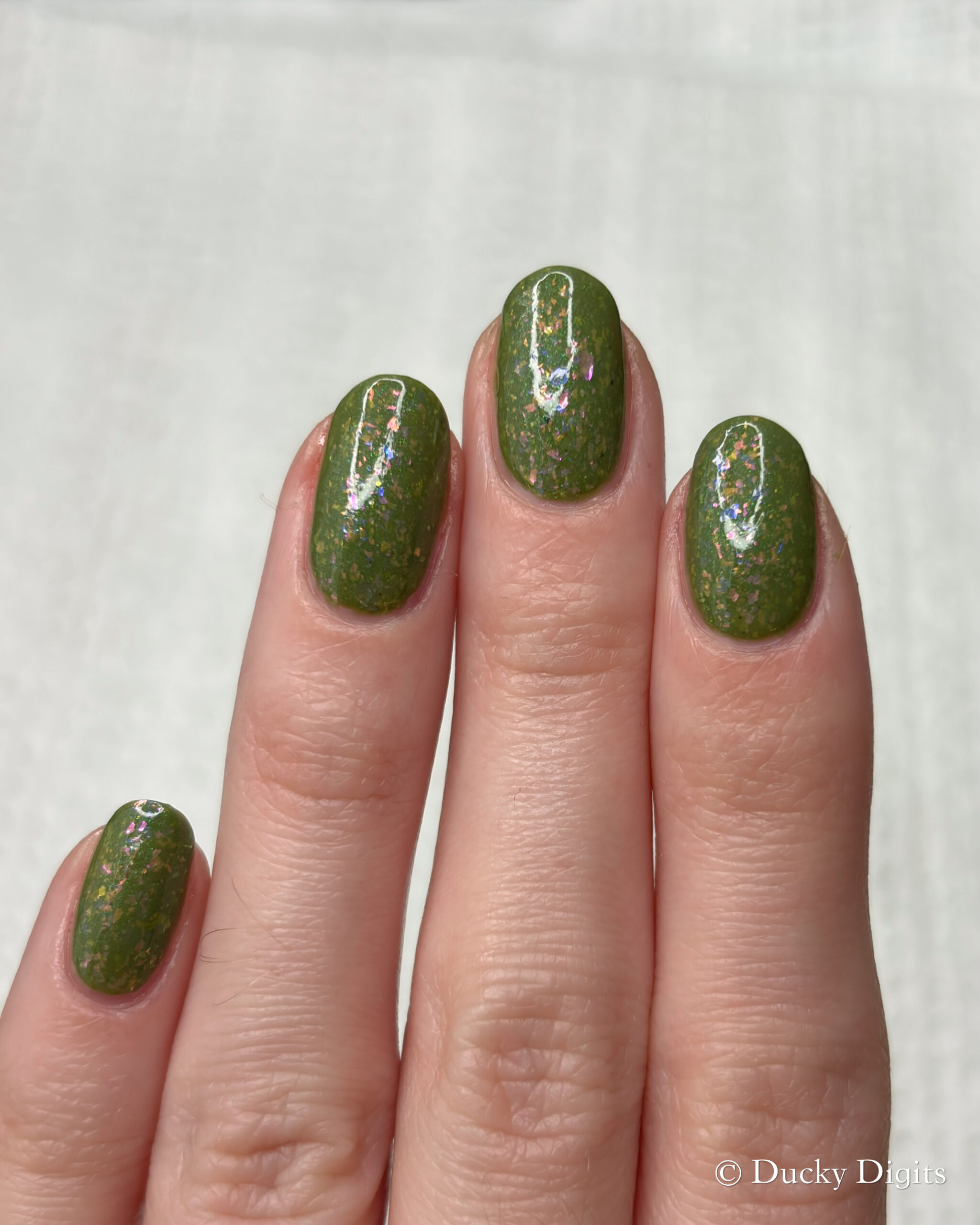 Maple Brook Moss is an olive green crelly polish loaded with two types of color-shifting iridescent flakes that shift from pink/purple/orange and blue/green/yellow, and a reflection of green/blue shimmer.