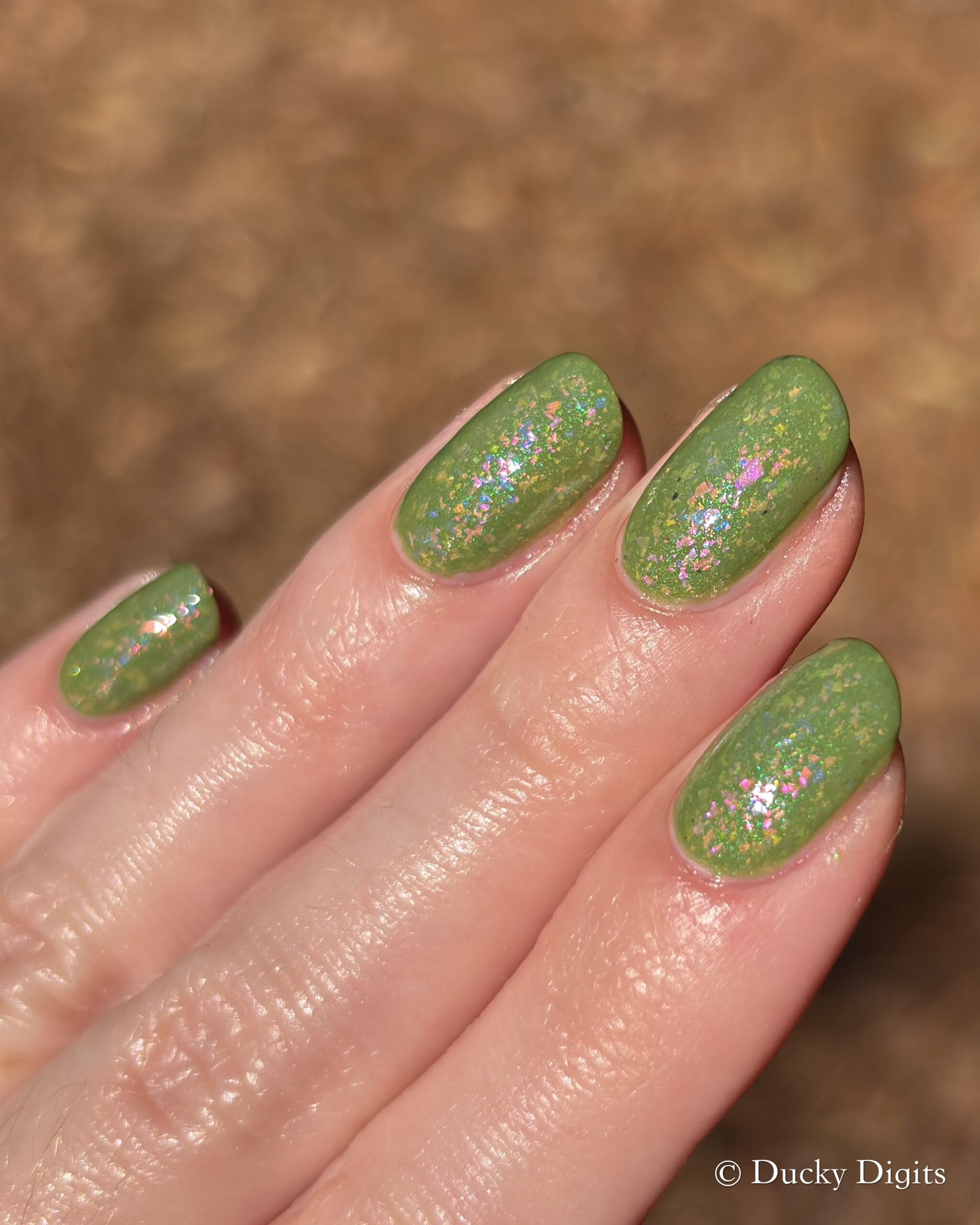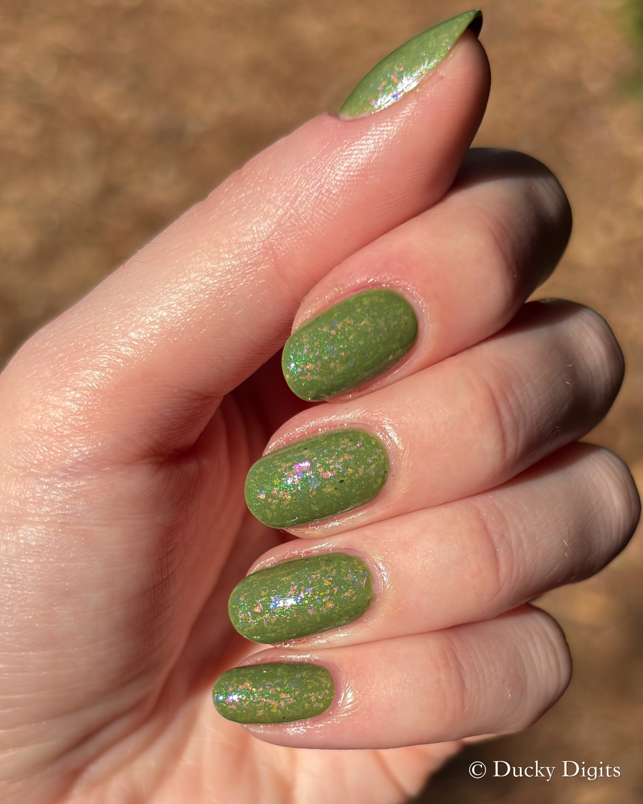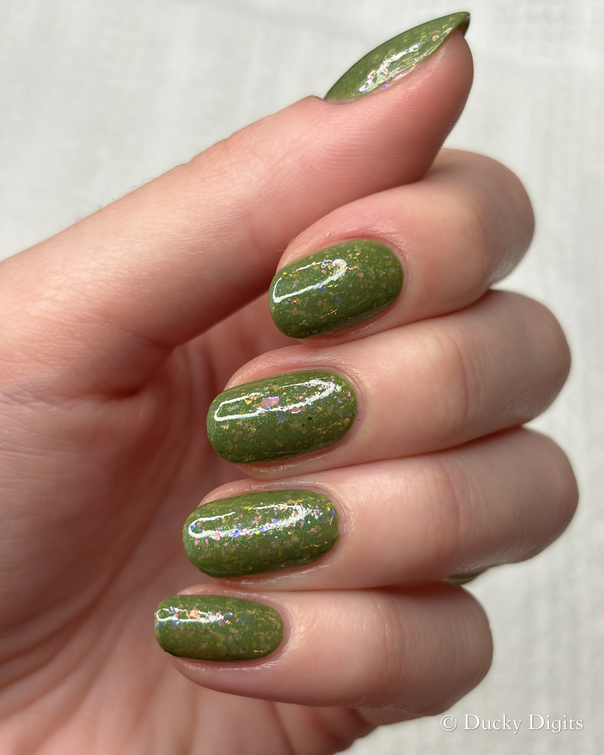 Maple Brook Moss is an olive green crelly polish loaded with two types of color-shifting iridescent flakes that shift from pink/purple/orange and blue/green/yellow, and a reflection of green/blue shimmer.