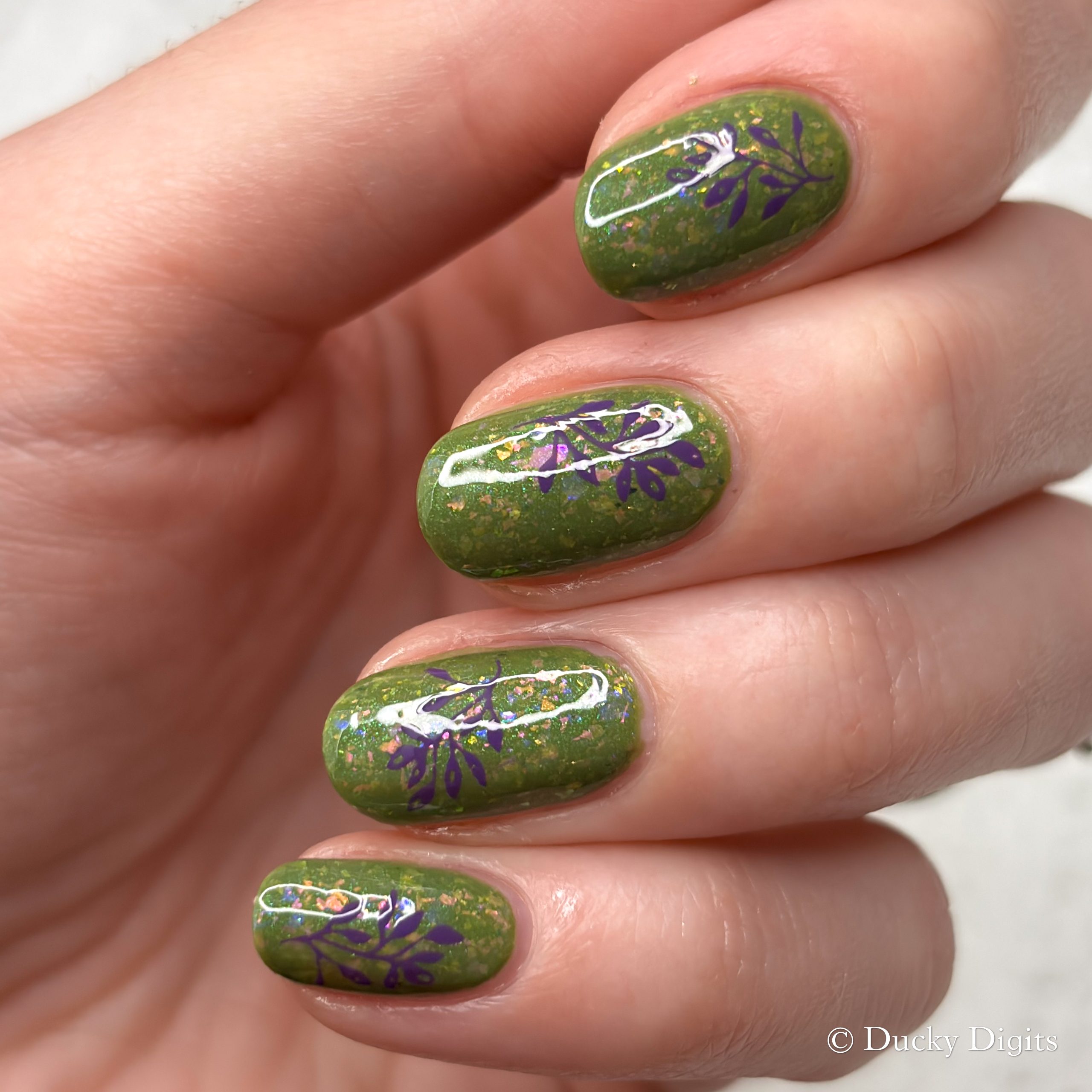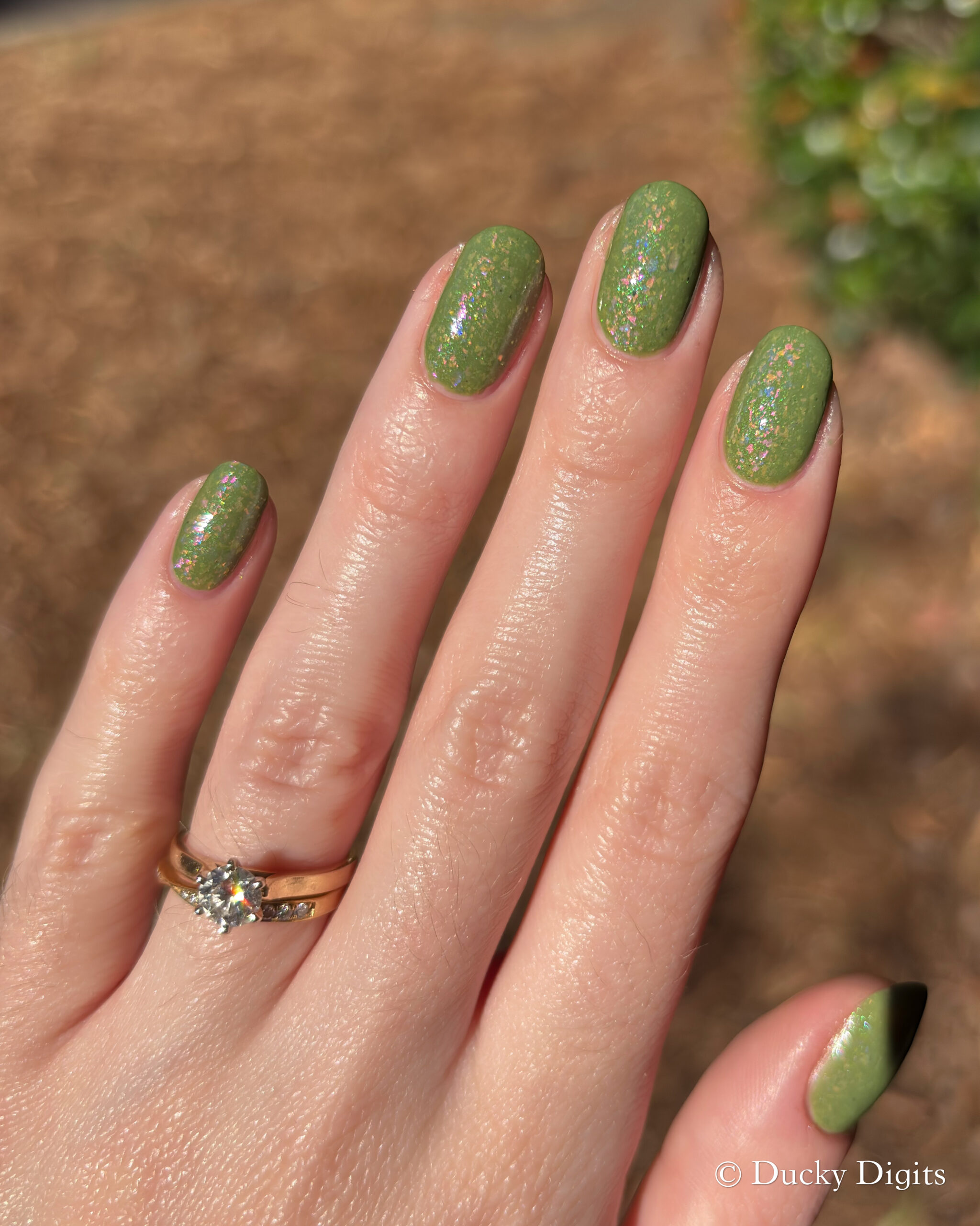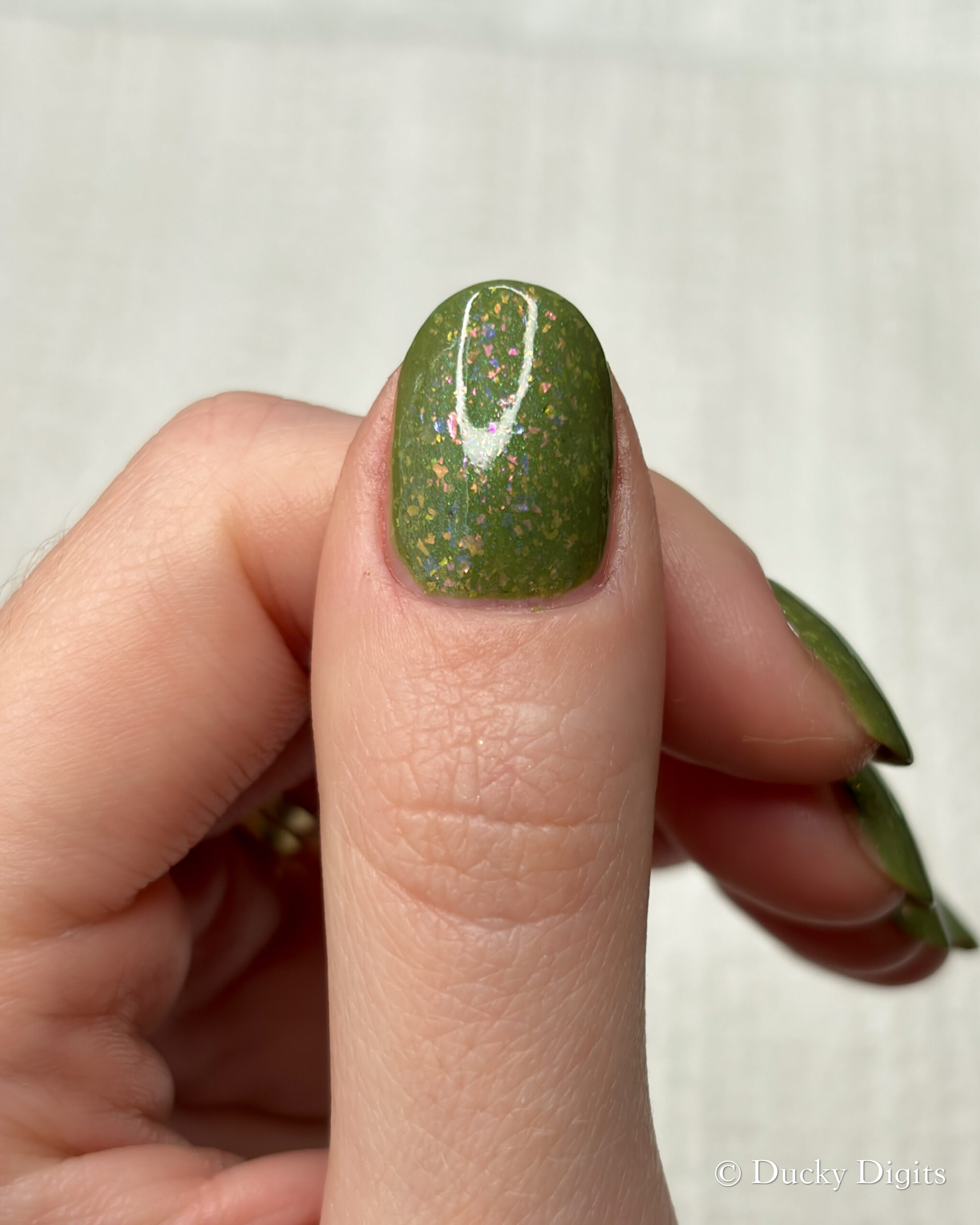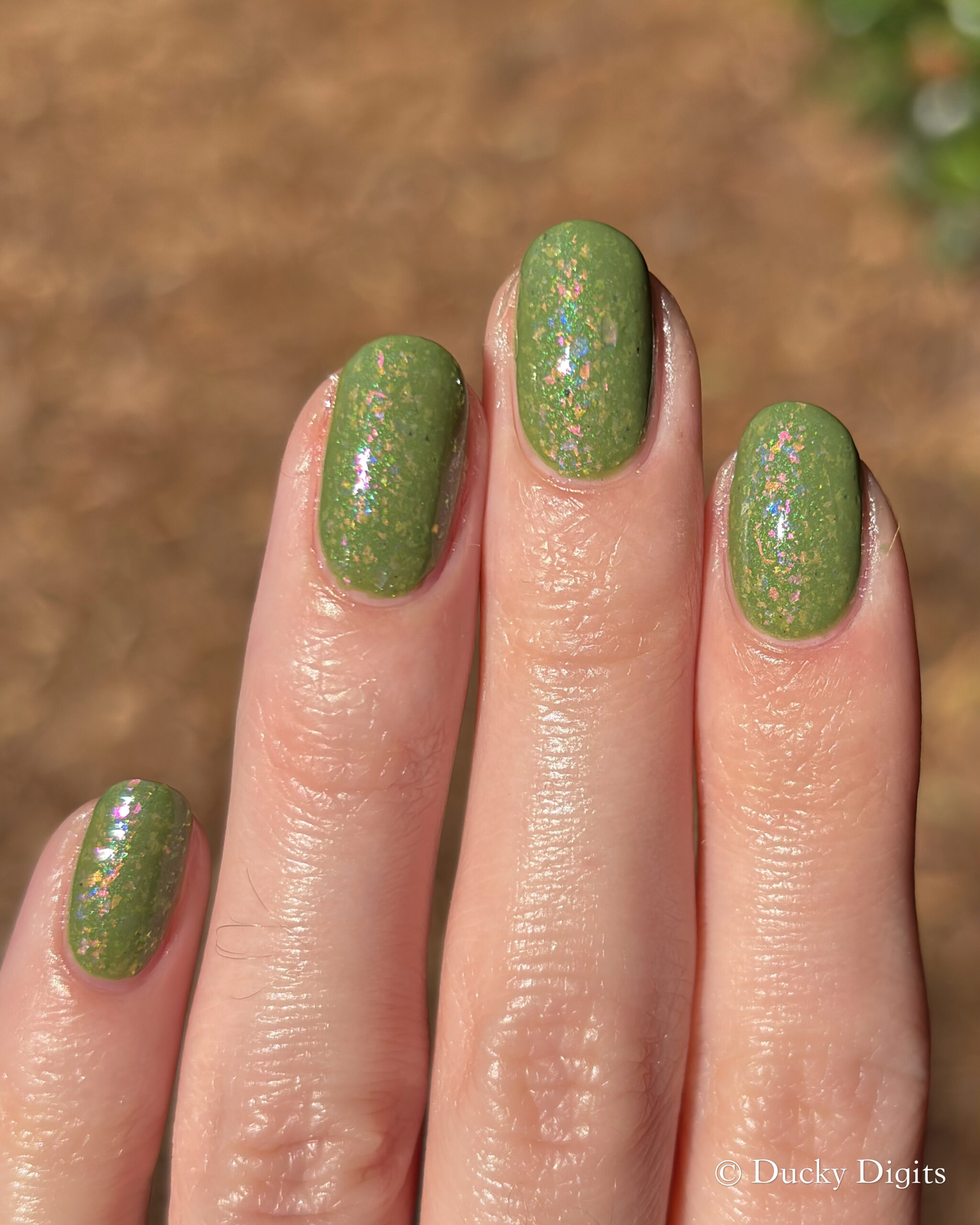 Maple Brook Moss is an olive green crelly polish loaded with two types of color-shifting iridescent flakes that shift from pink/purple/orange and blue/green/yellow, and a reflection of green/blue shimmer.