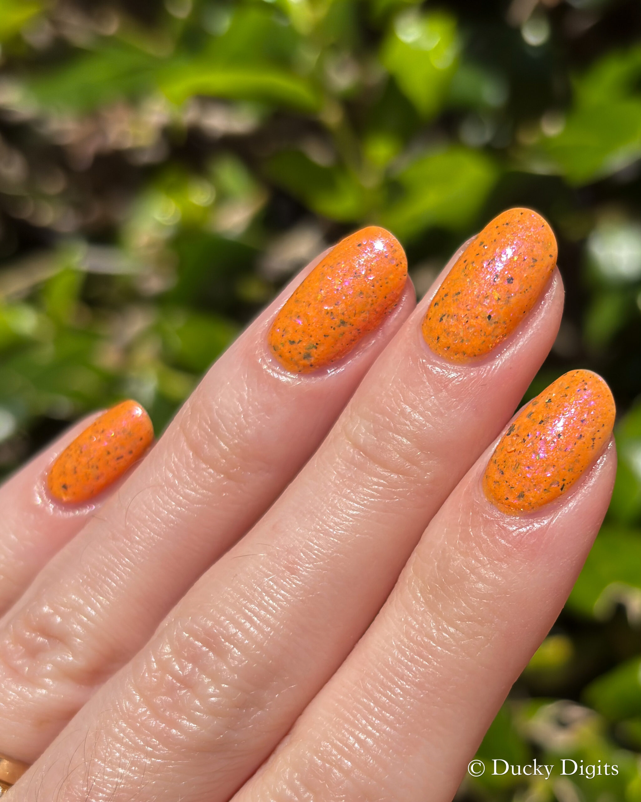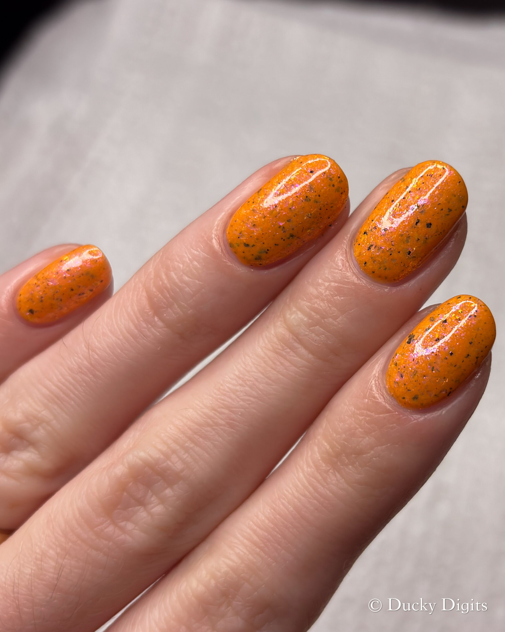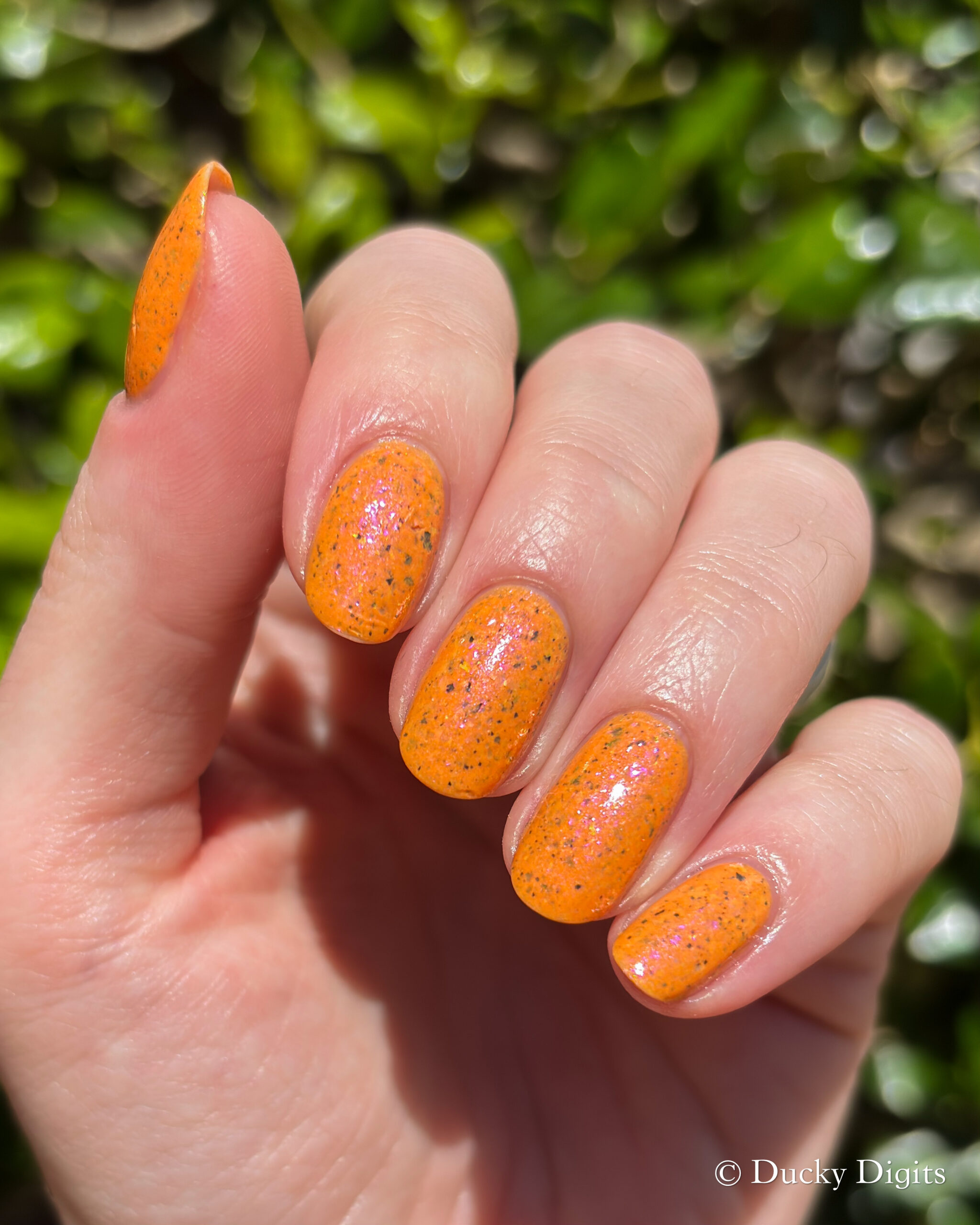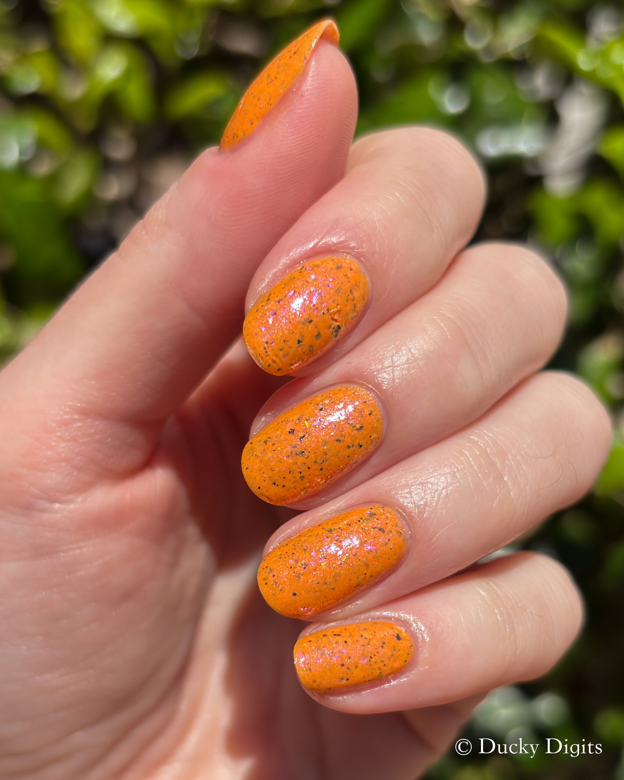 Camo & Cowboy Boots is a light and bright orange crelly loaded with color-shifting iridescent flakes that shift pink/red/orange/yellow, and shimmer that shifts pink/red/yellow, and green and black microflakes.