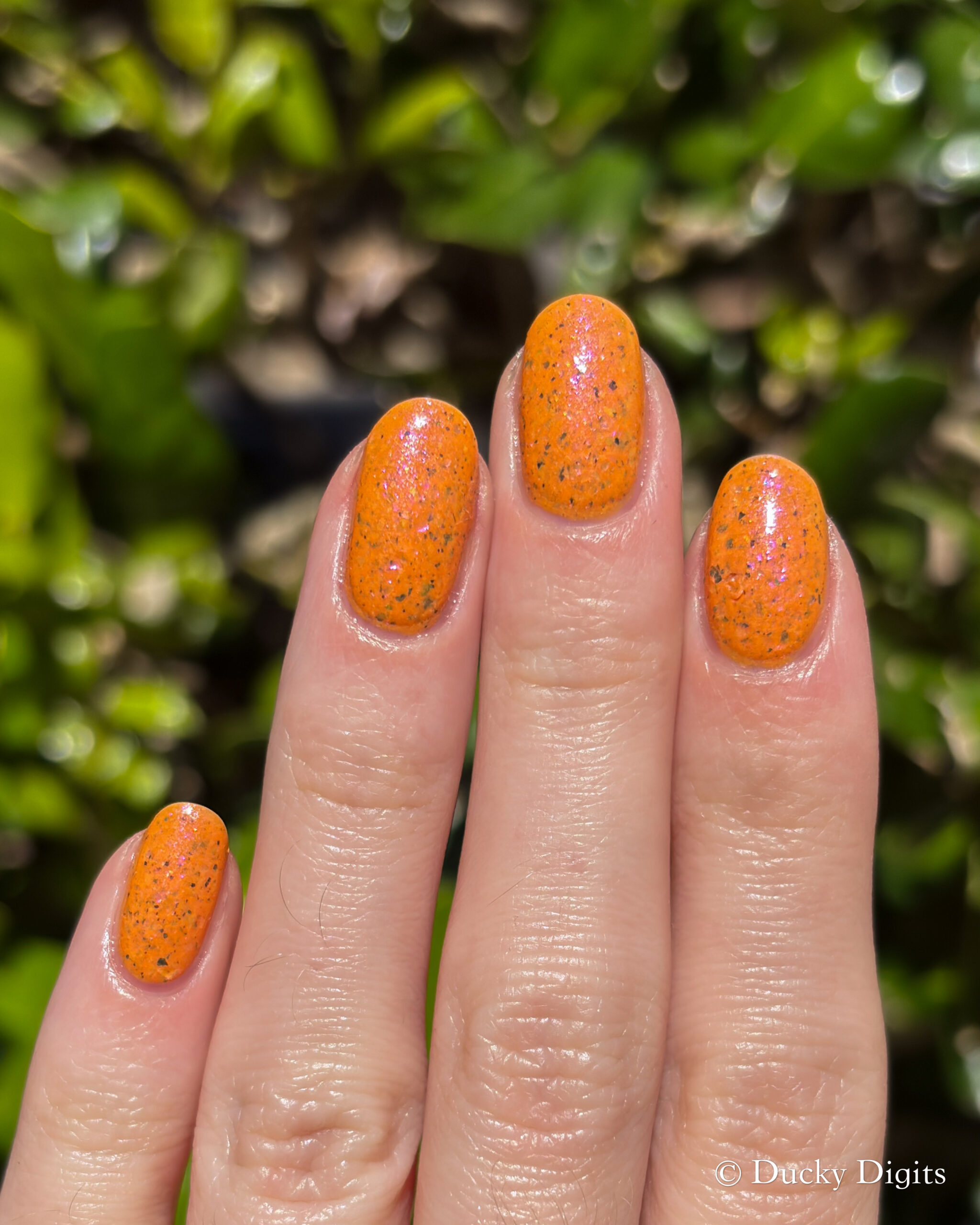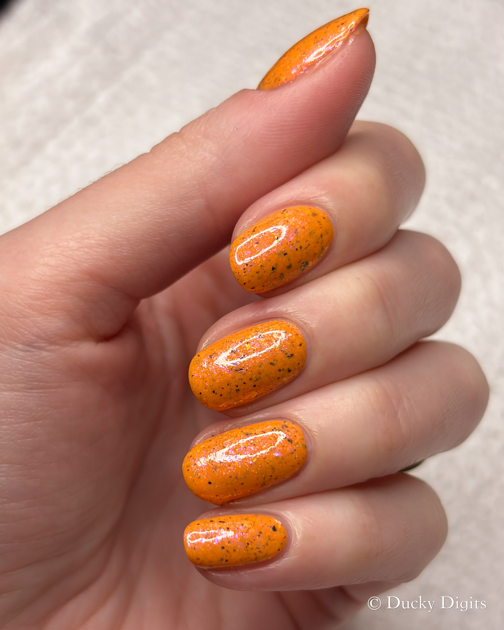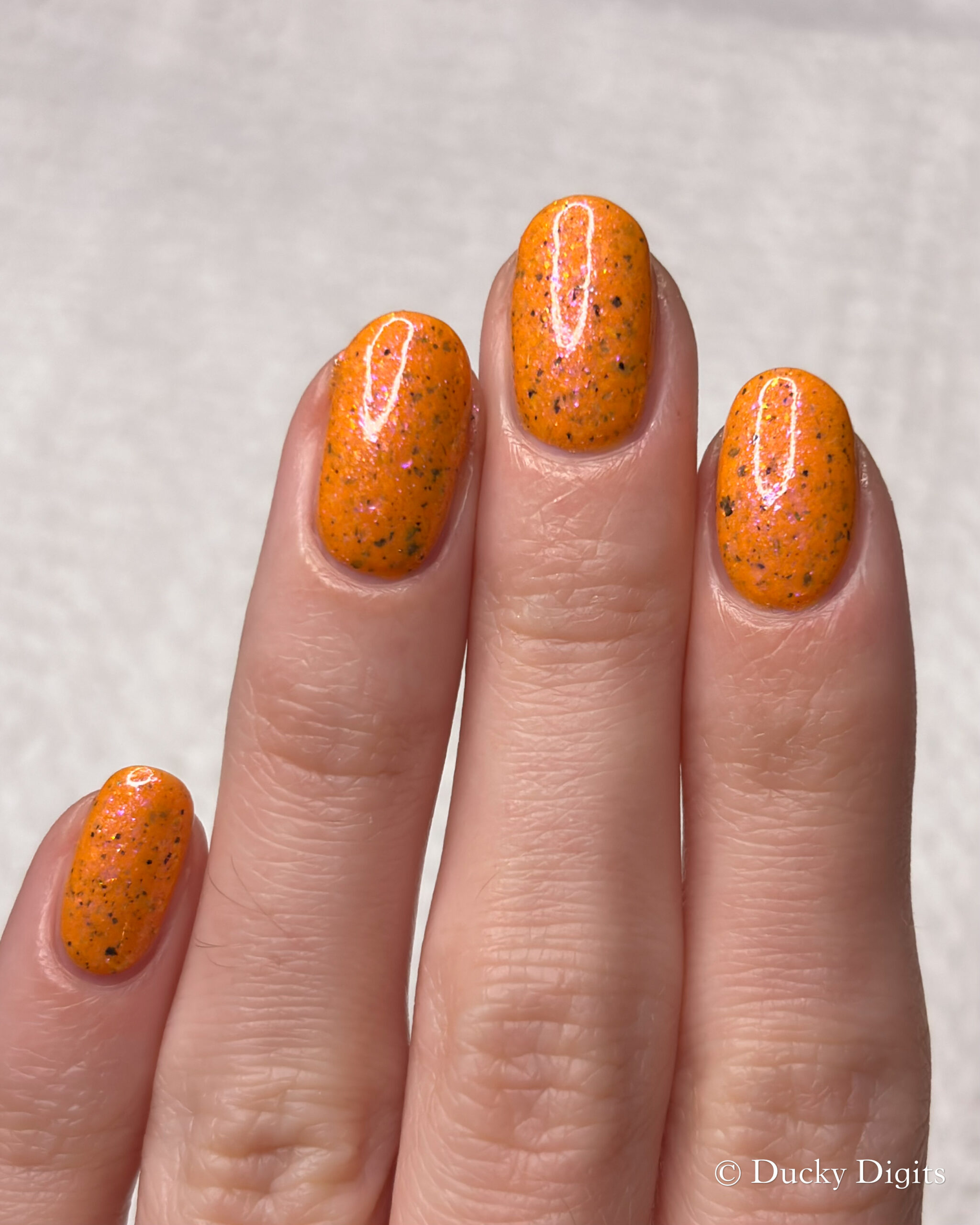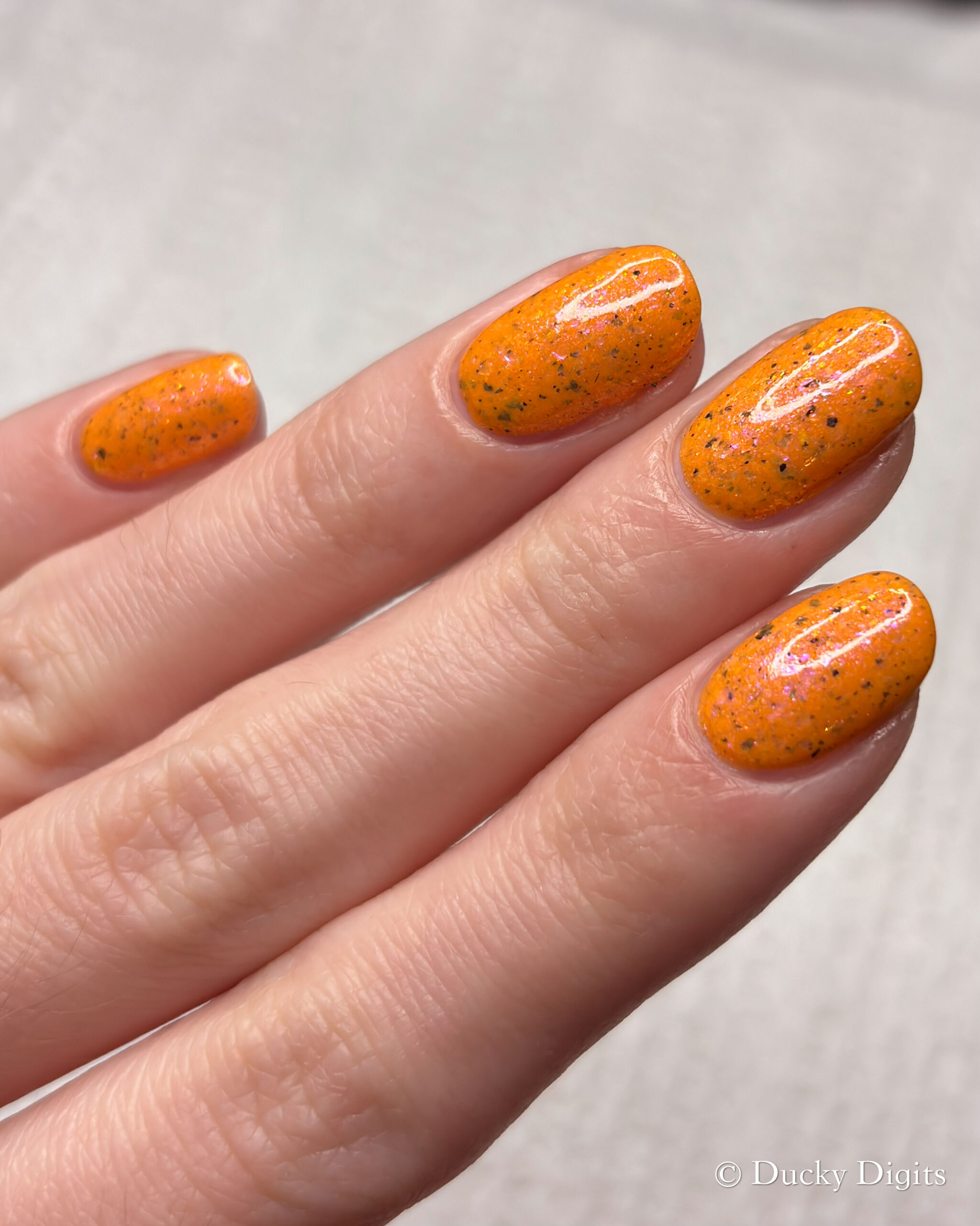 Camo & Cowboy Boots is a light and bright orange crelly loaded with color-shifting iridescent flakes that shift pink/red/orange/yellow, and shimmer that shifts pink/red/yellow, and green and black microflakes.
