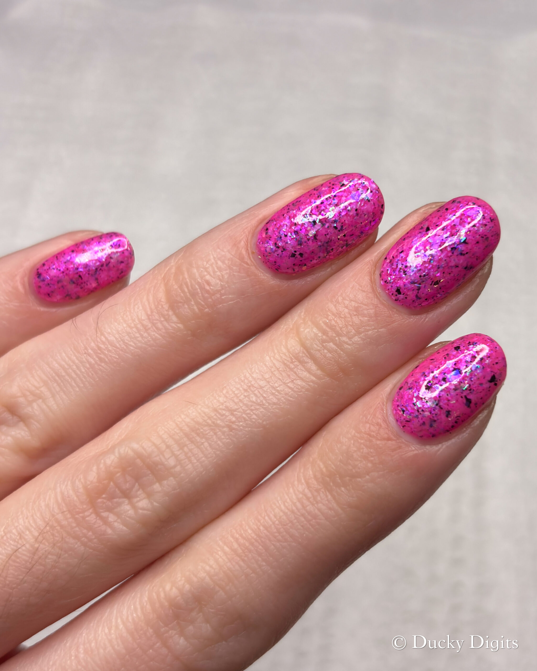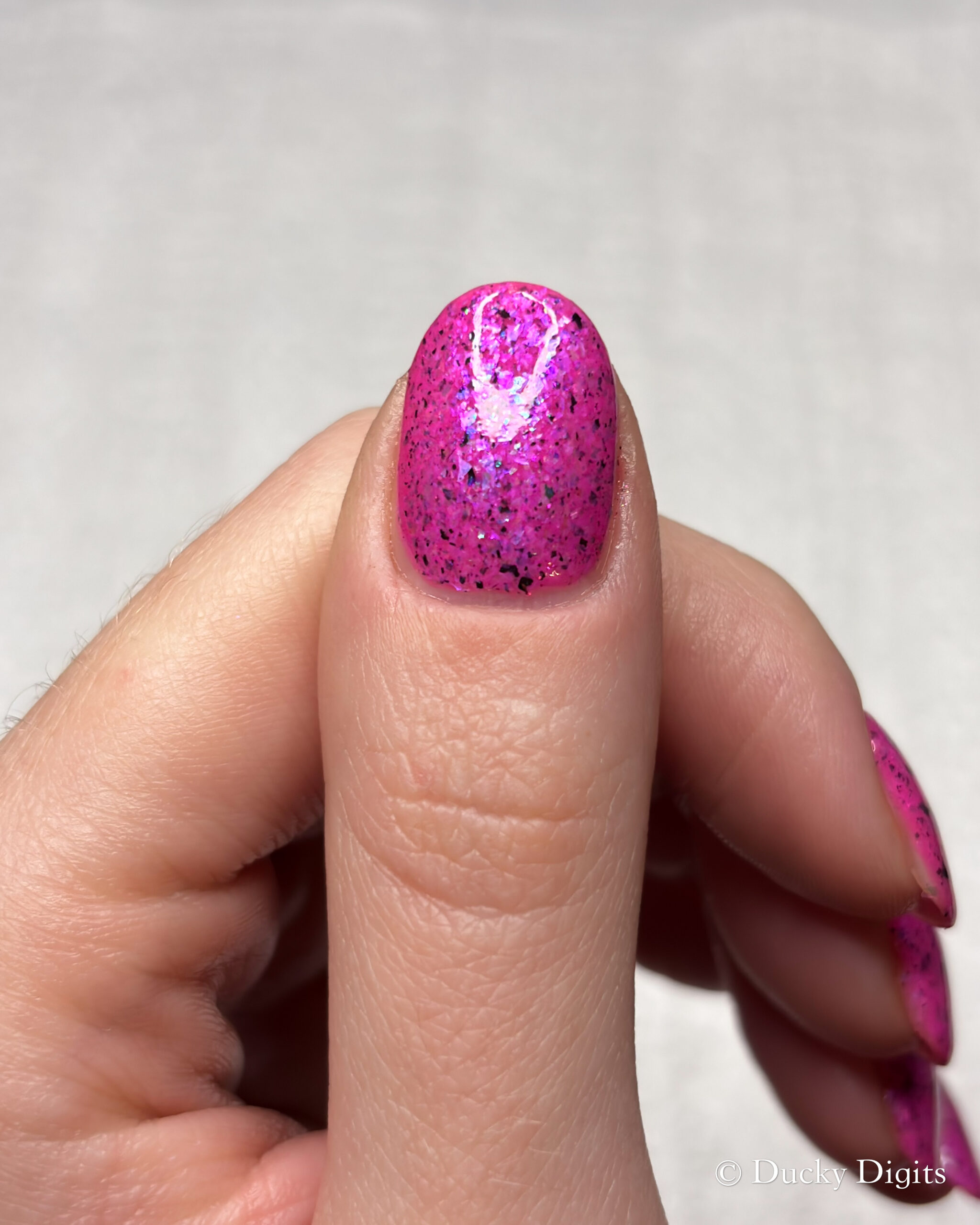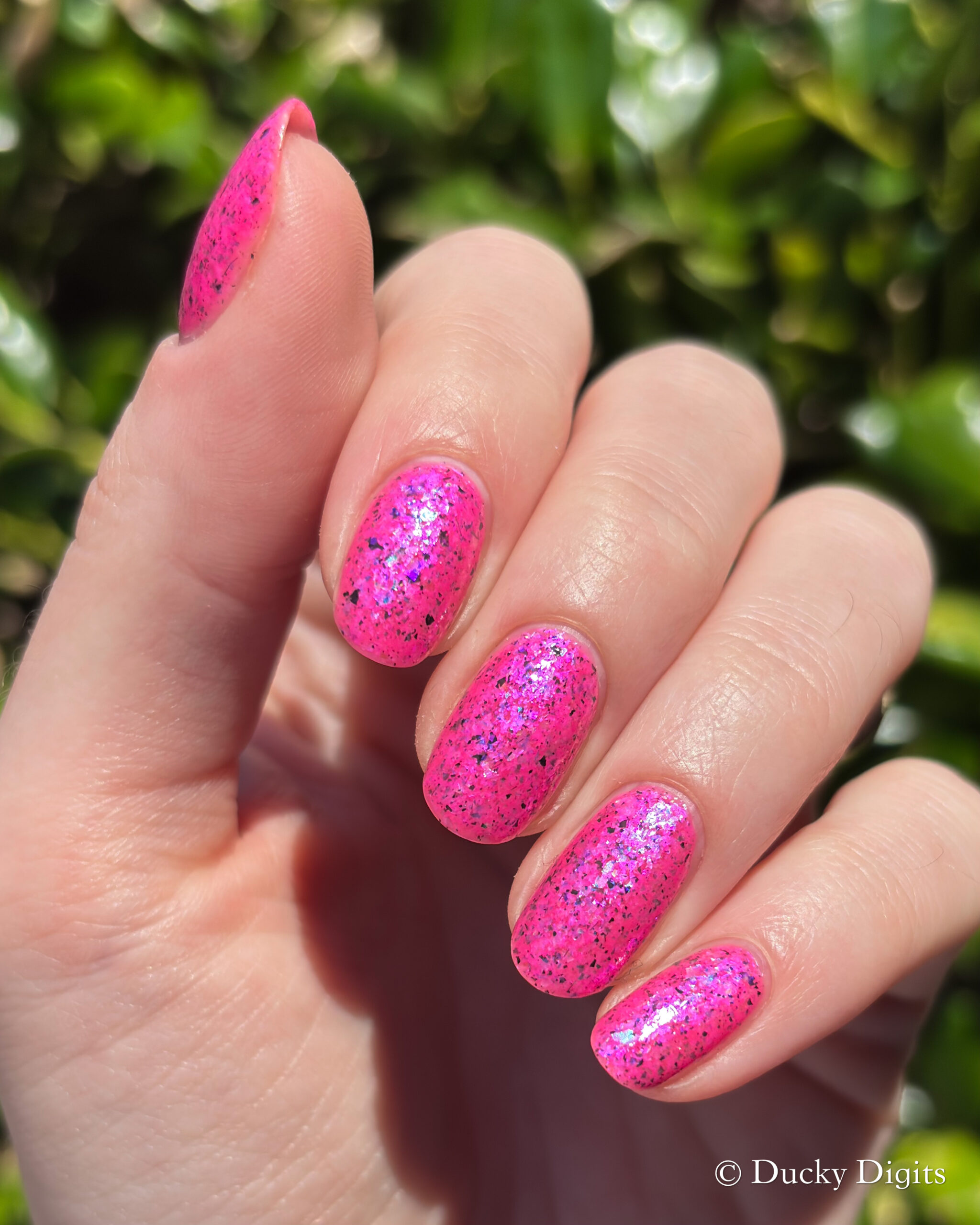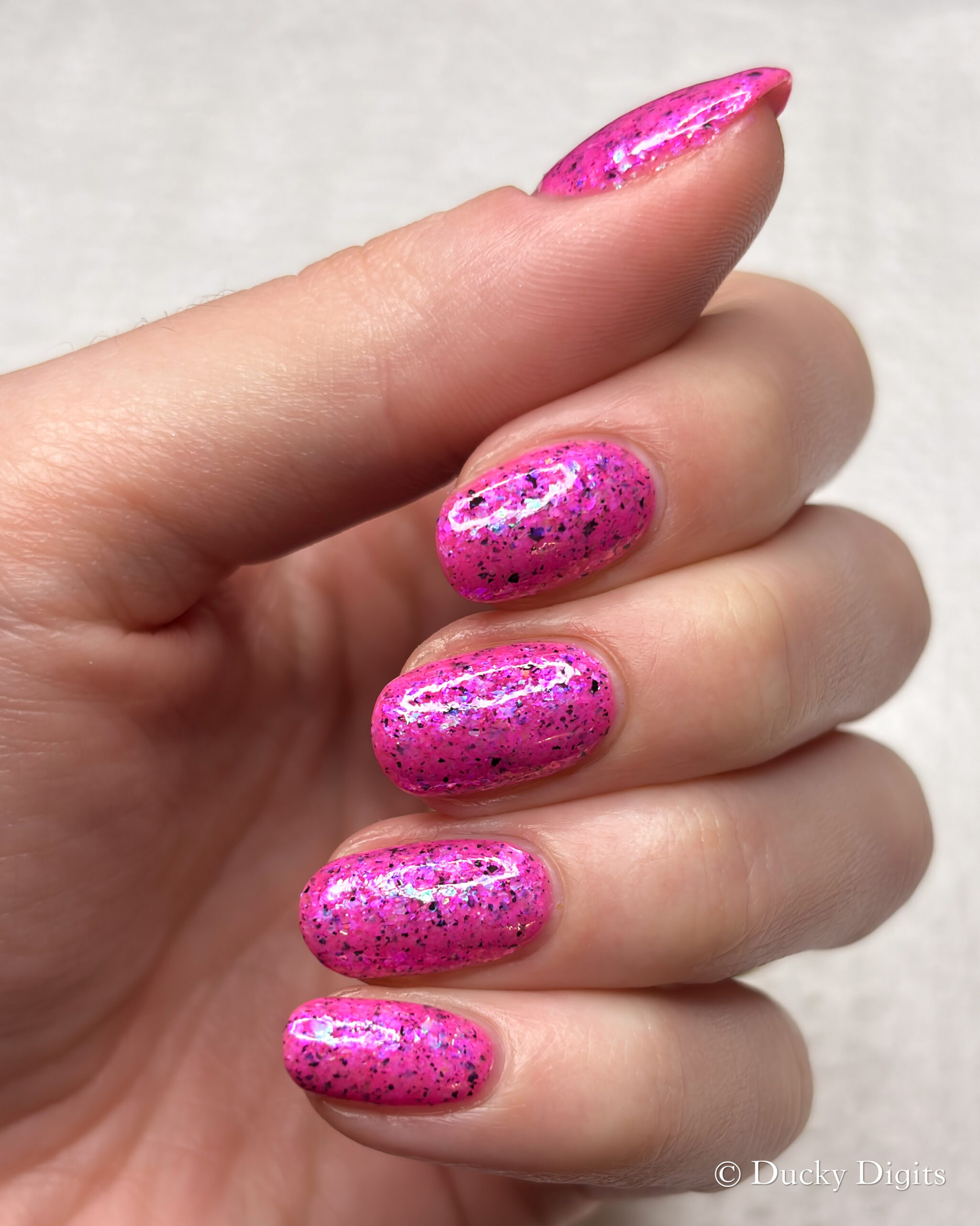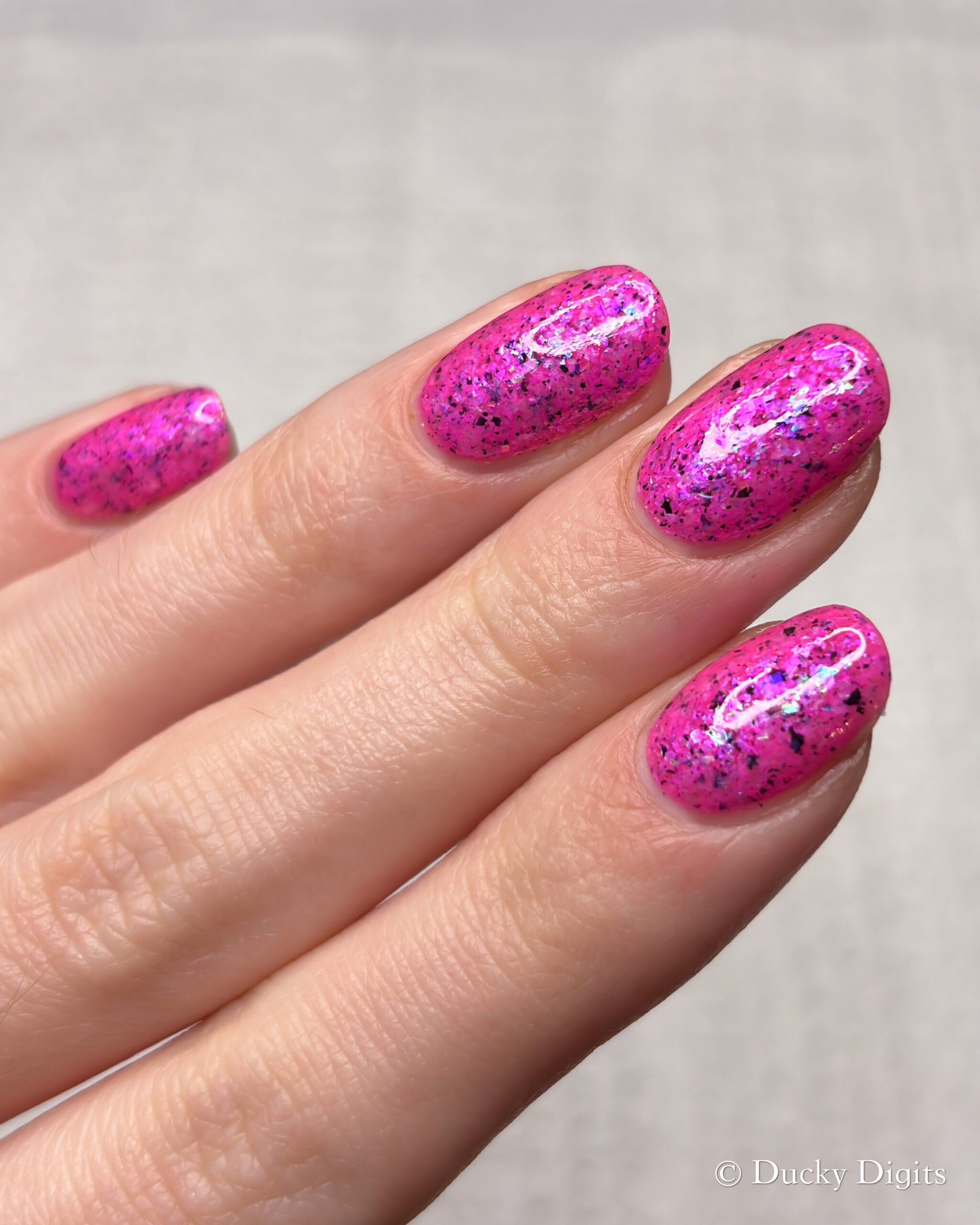 We Don’t Work, We Wife is a bright pink jelly polish with two different types of color-shifting iridescent flakes that shift pink/purple/orange and blue/green/yellow, with black microflakes.
