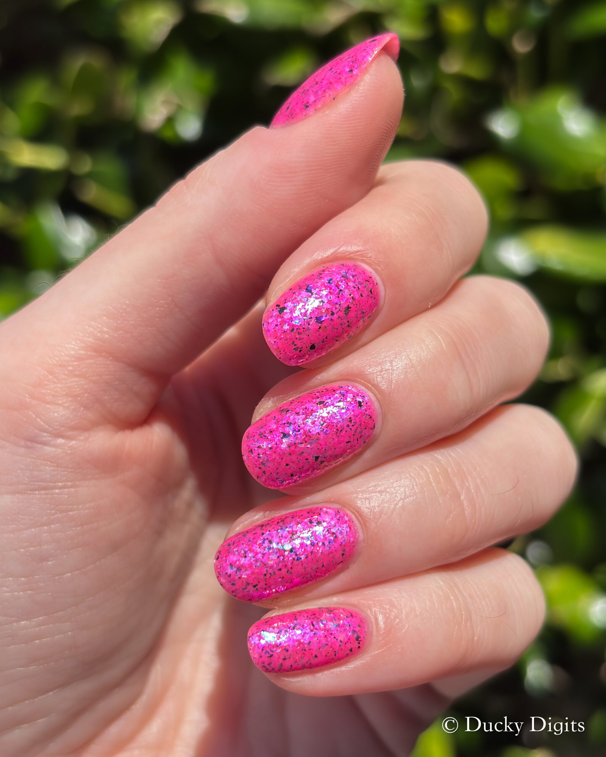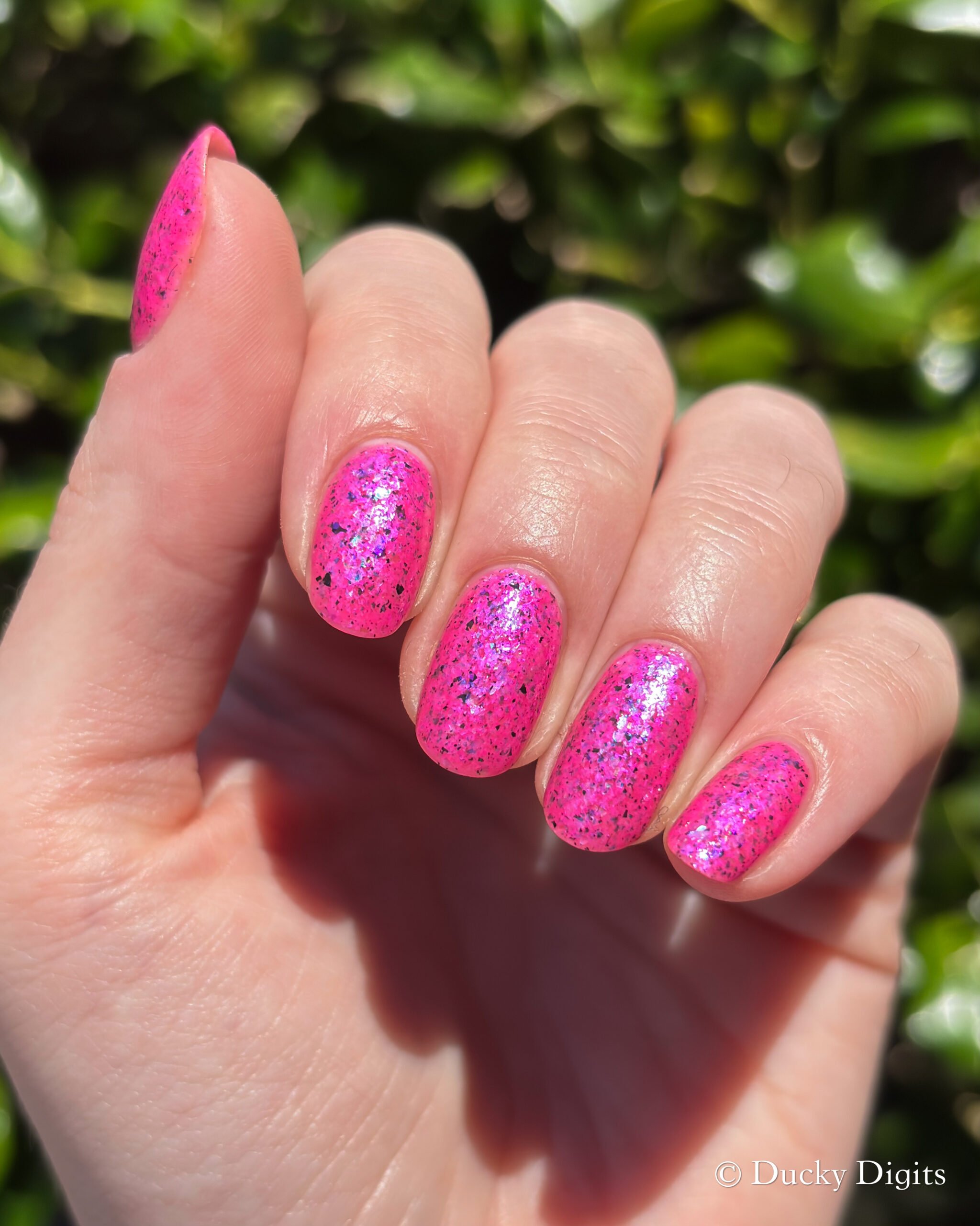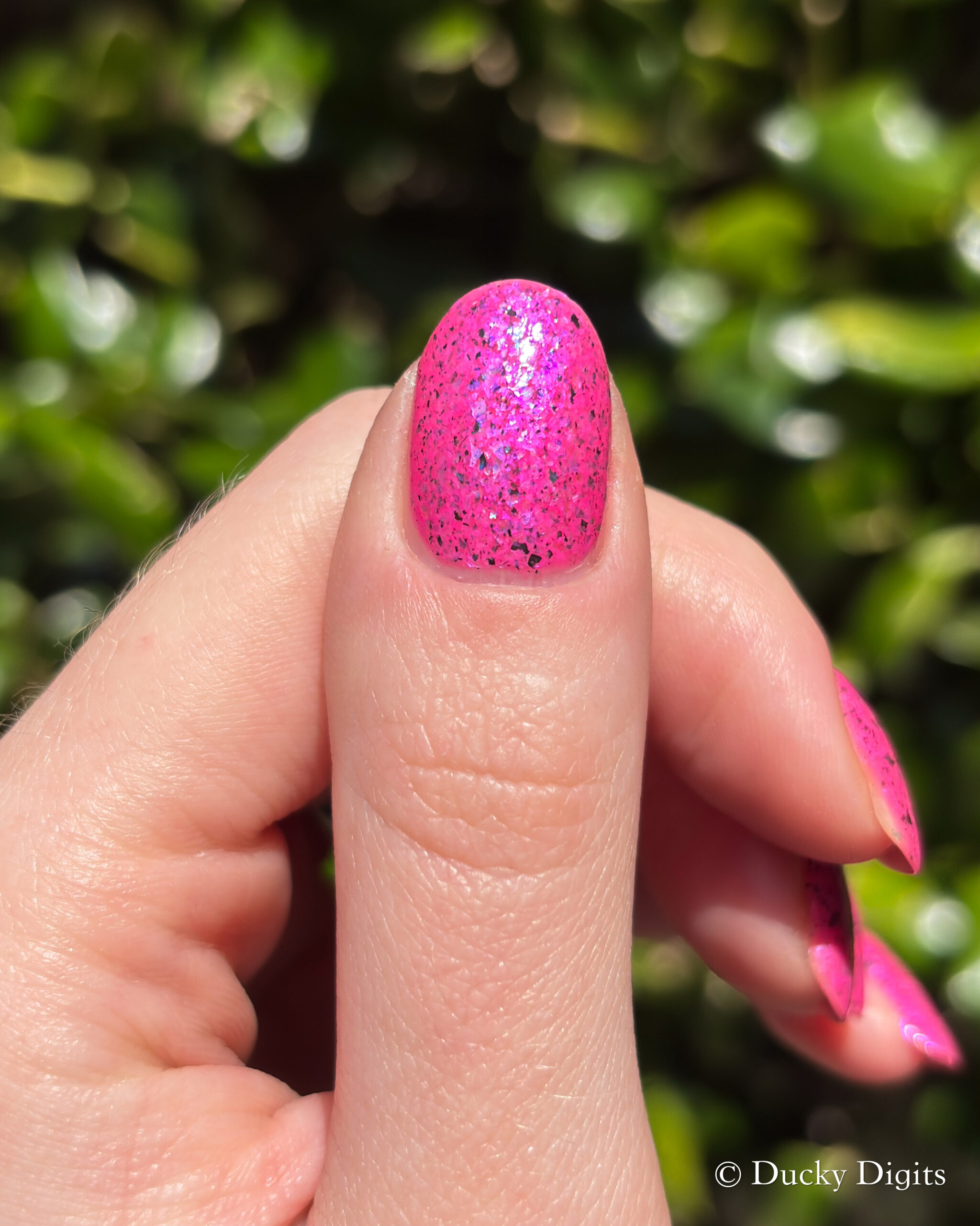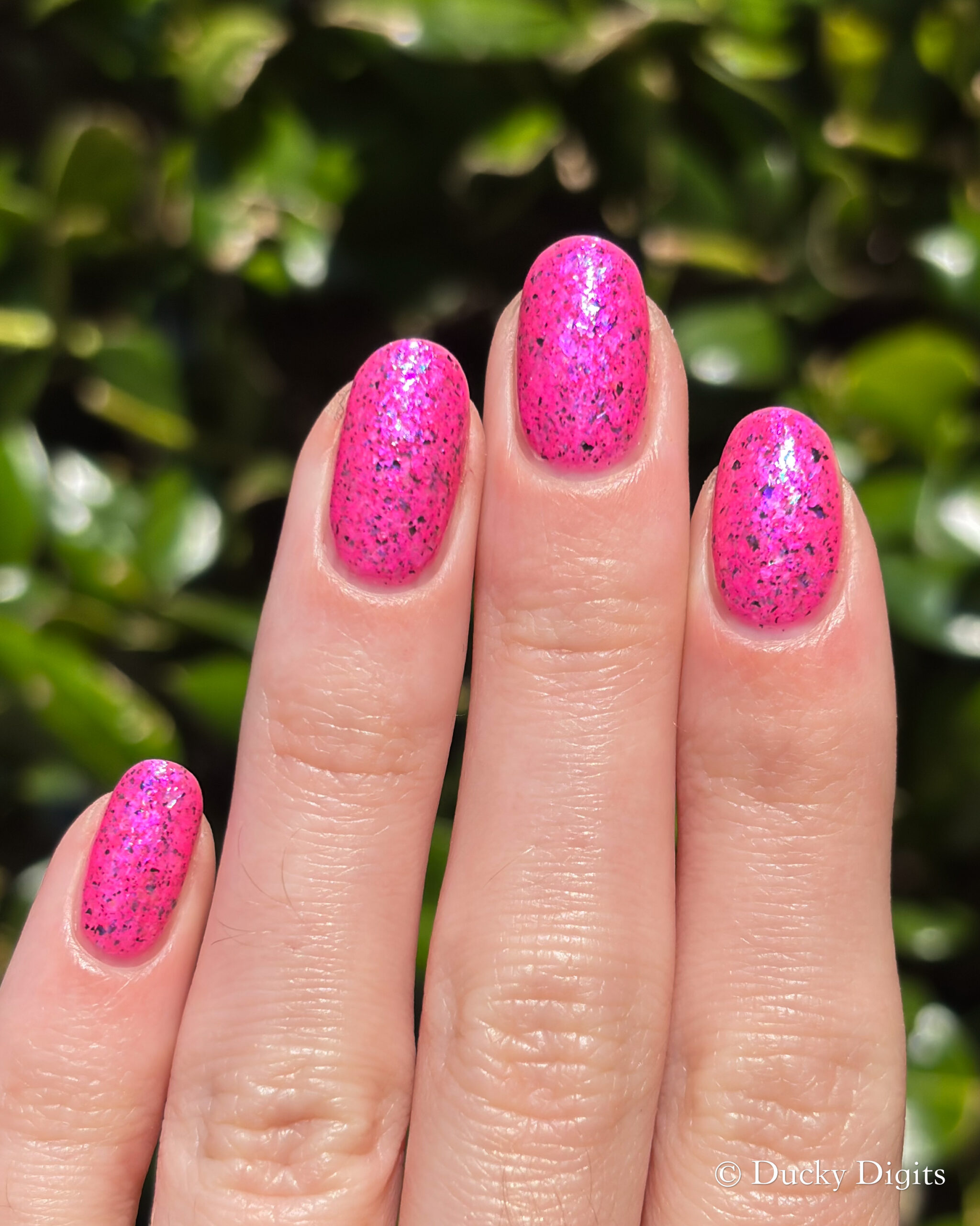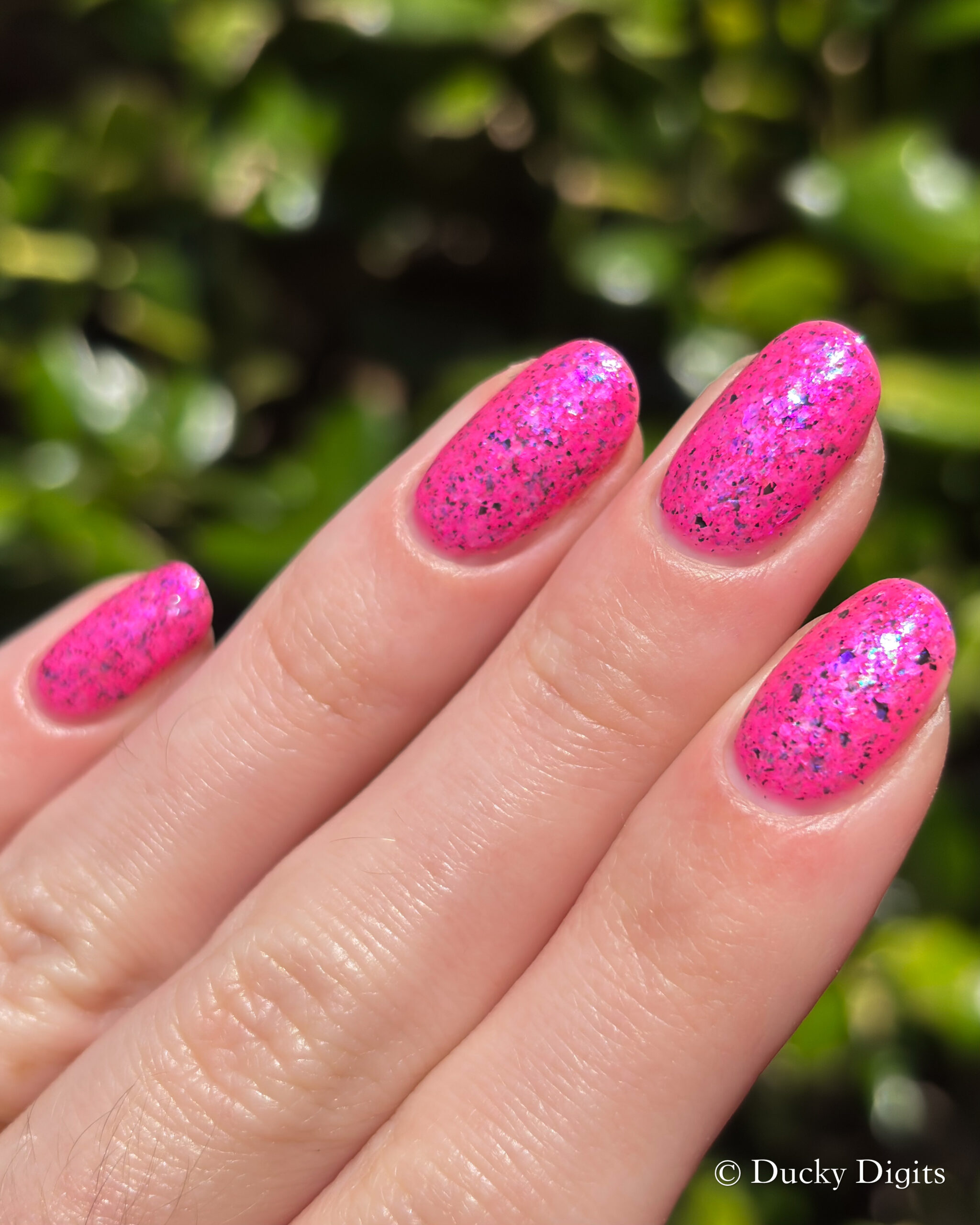 We Don’t Work, We Wife is a bright pink jelly polish with two different types of color-shifting iridescent flakes that shift pink/purple/orange and blue/green/yellow, with black microflakes.