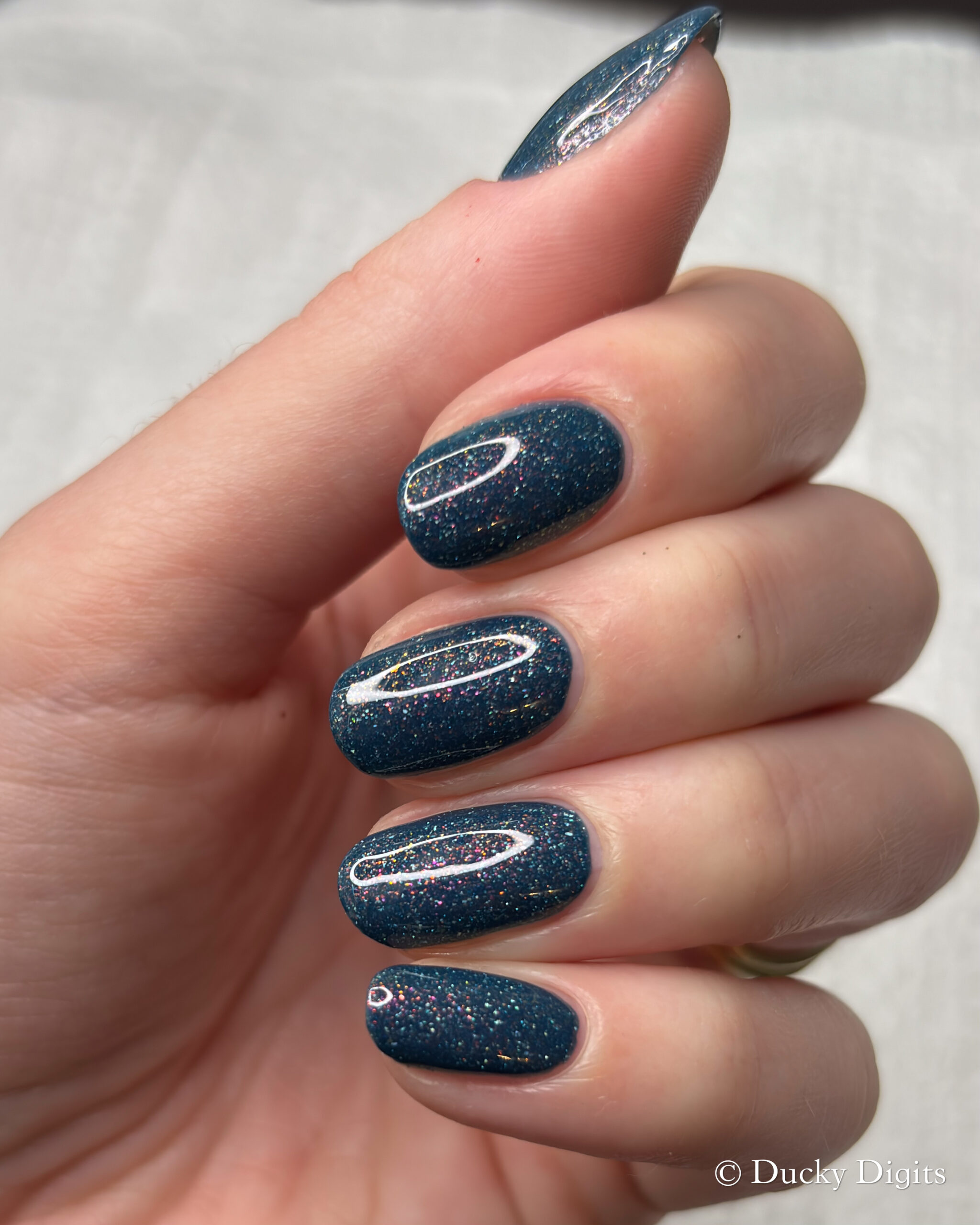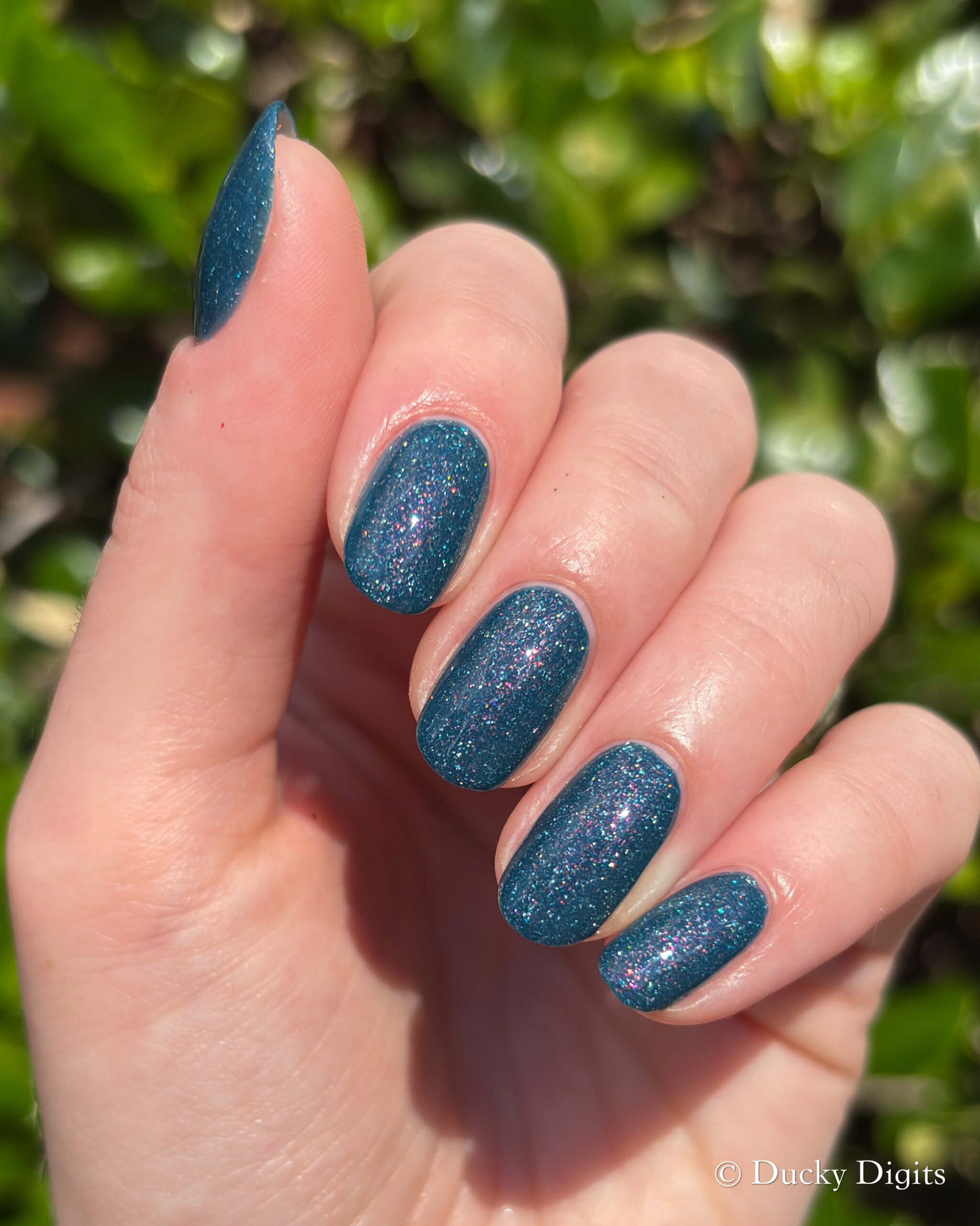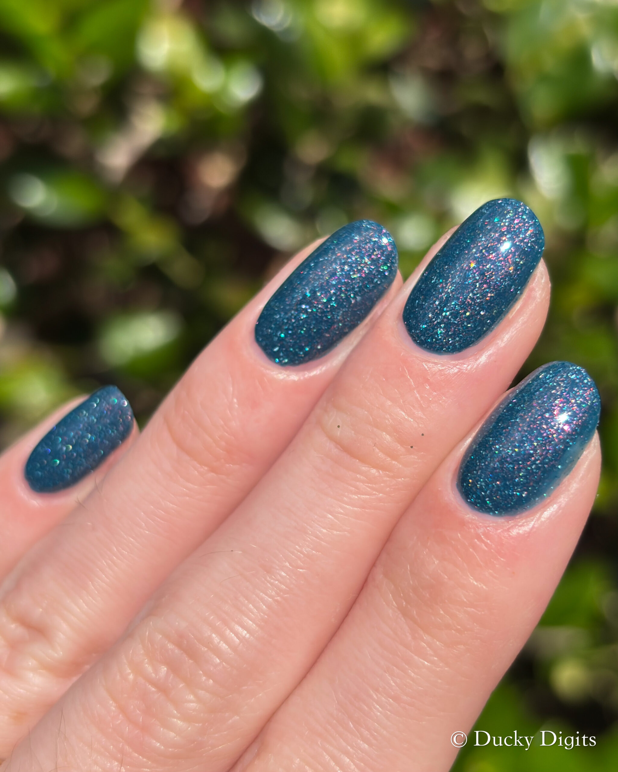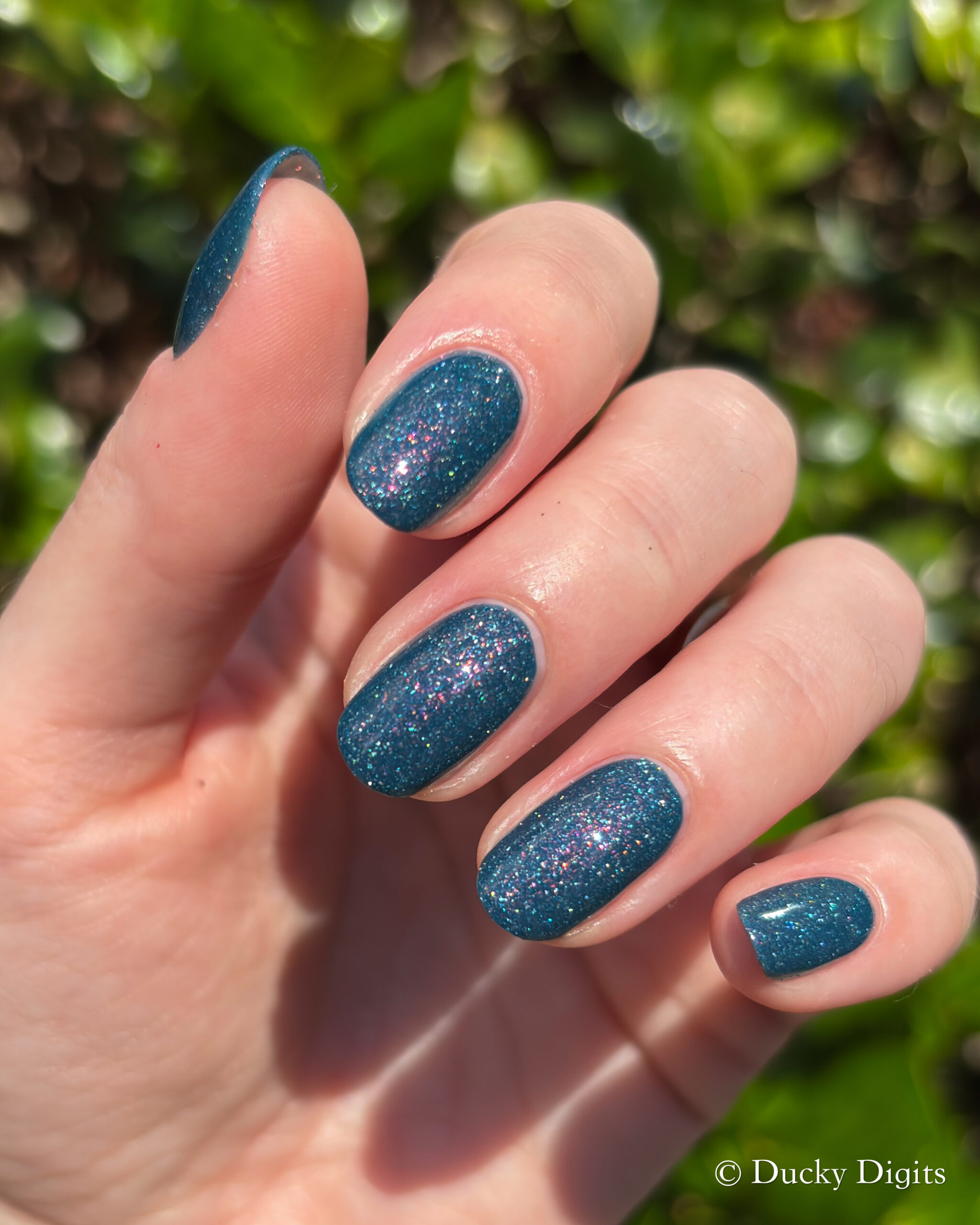 Shop, Hunt, & Drink is a dark teal crelly polish with blue undertones, loaded with color-shifting shimmer that shift pink/purple/red/orange/yellow/green, with holo flakes and light blue reflective glitters.