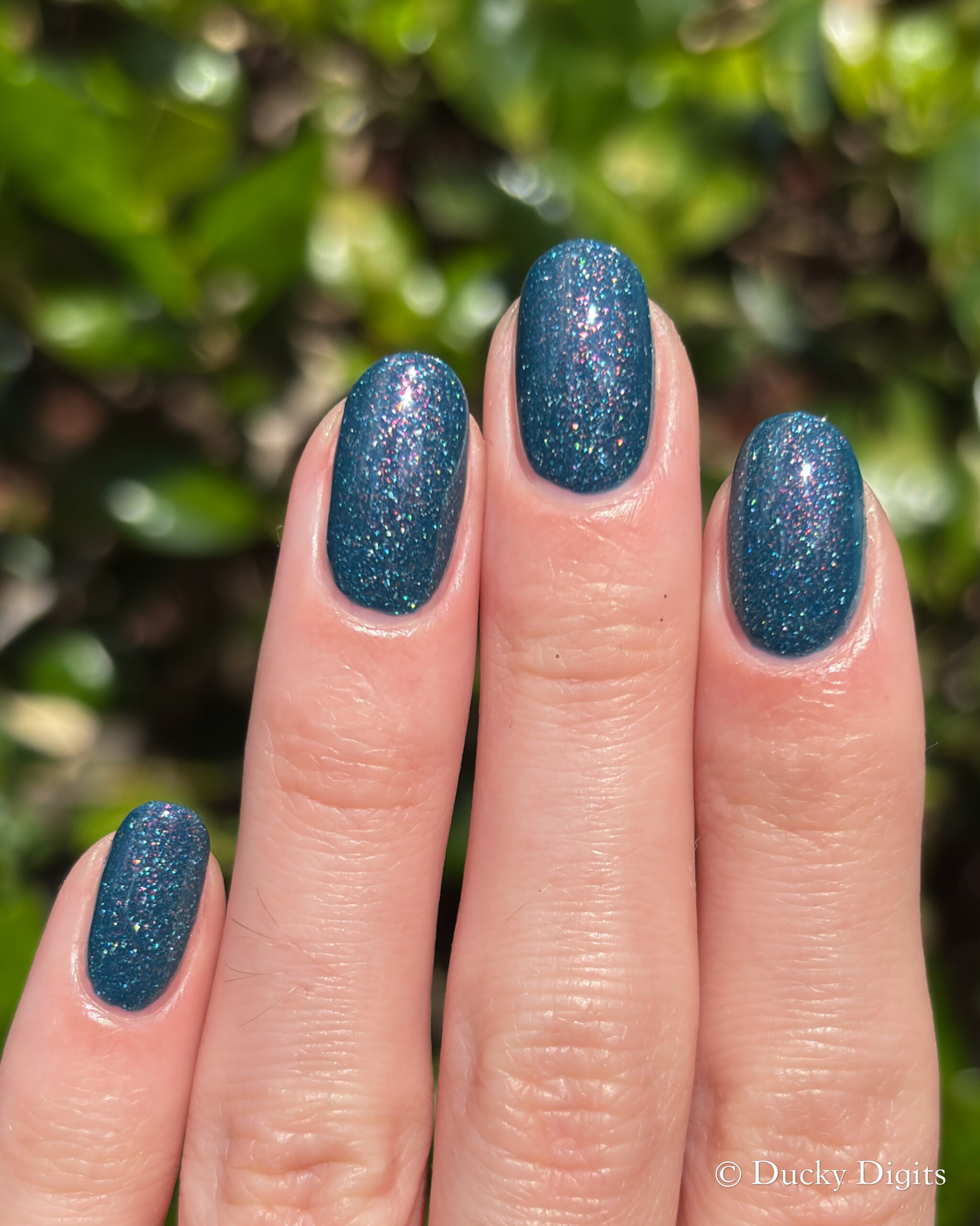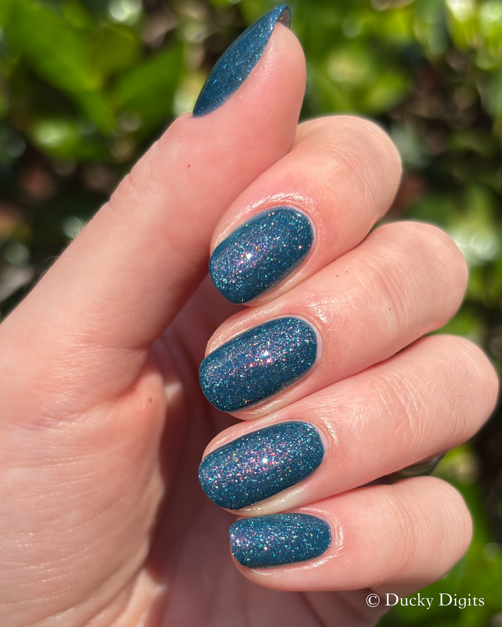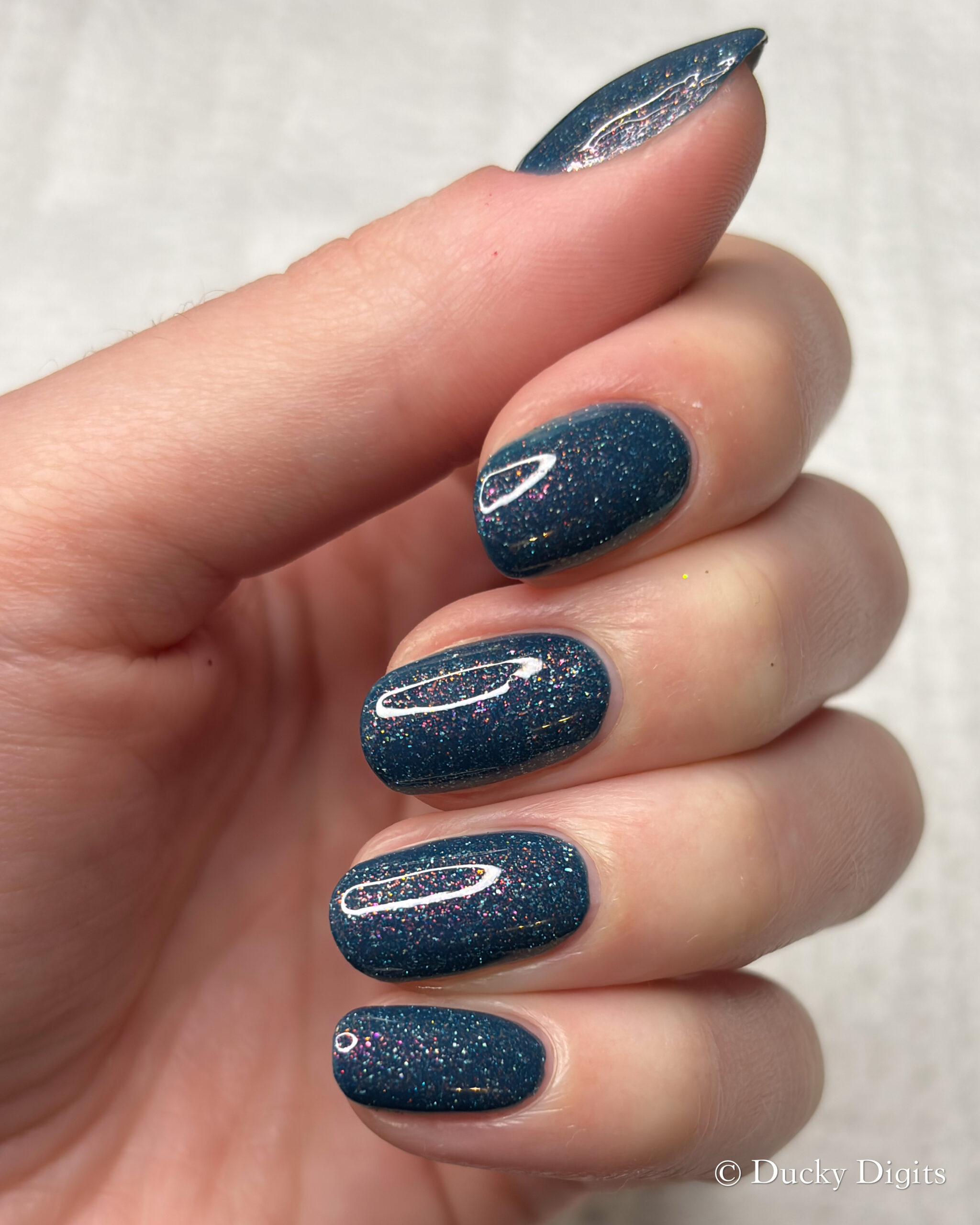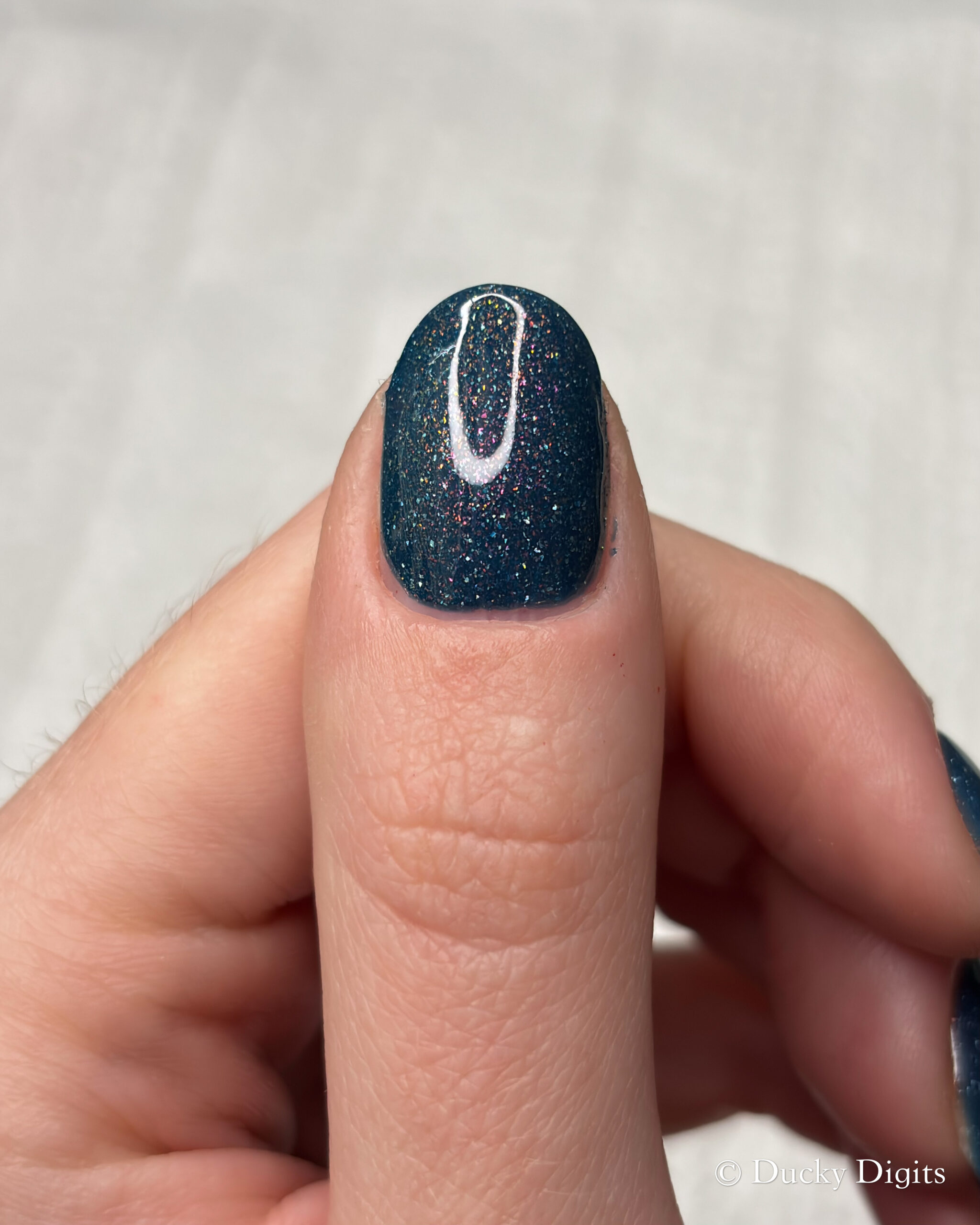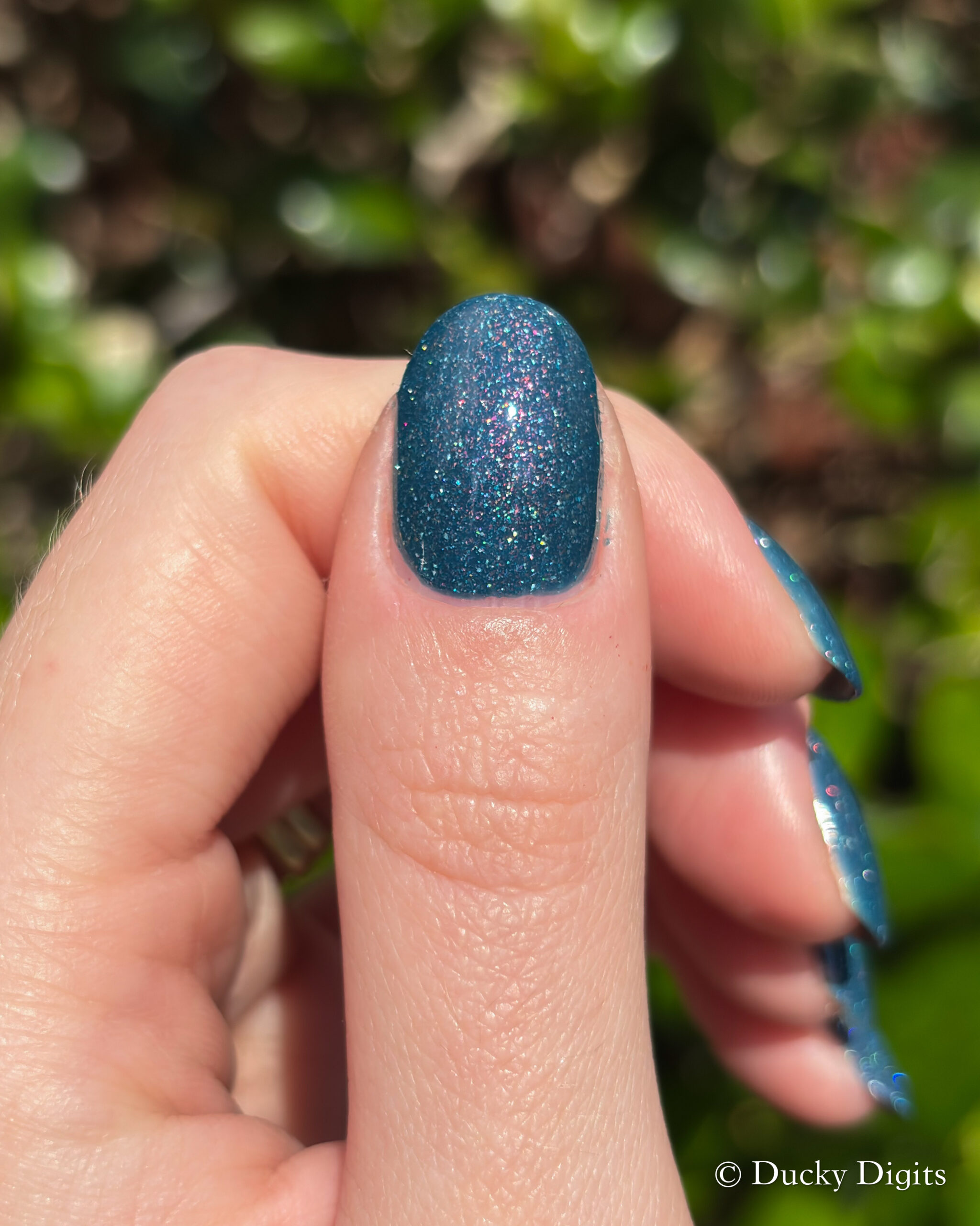 Shop, Hunt, & Drink is a dark teal crelly polish with blue undertones, loaded with color-shifting shimmer that shift pink/purple/red/orange/yellow/green, with holo flakes and light blue reflective glitters.