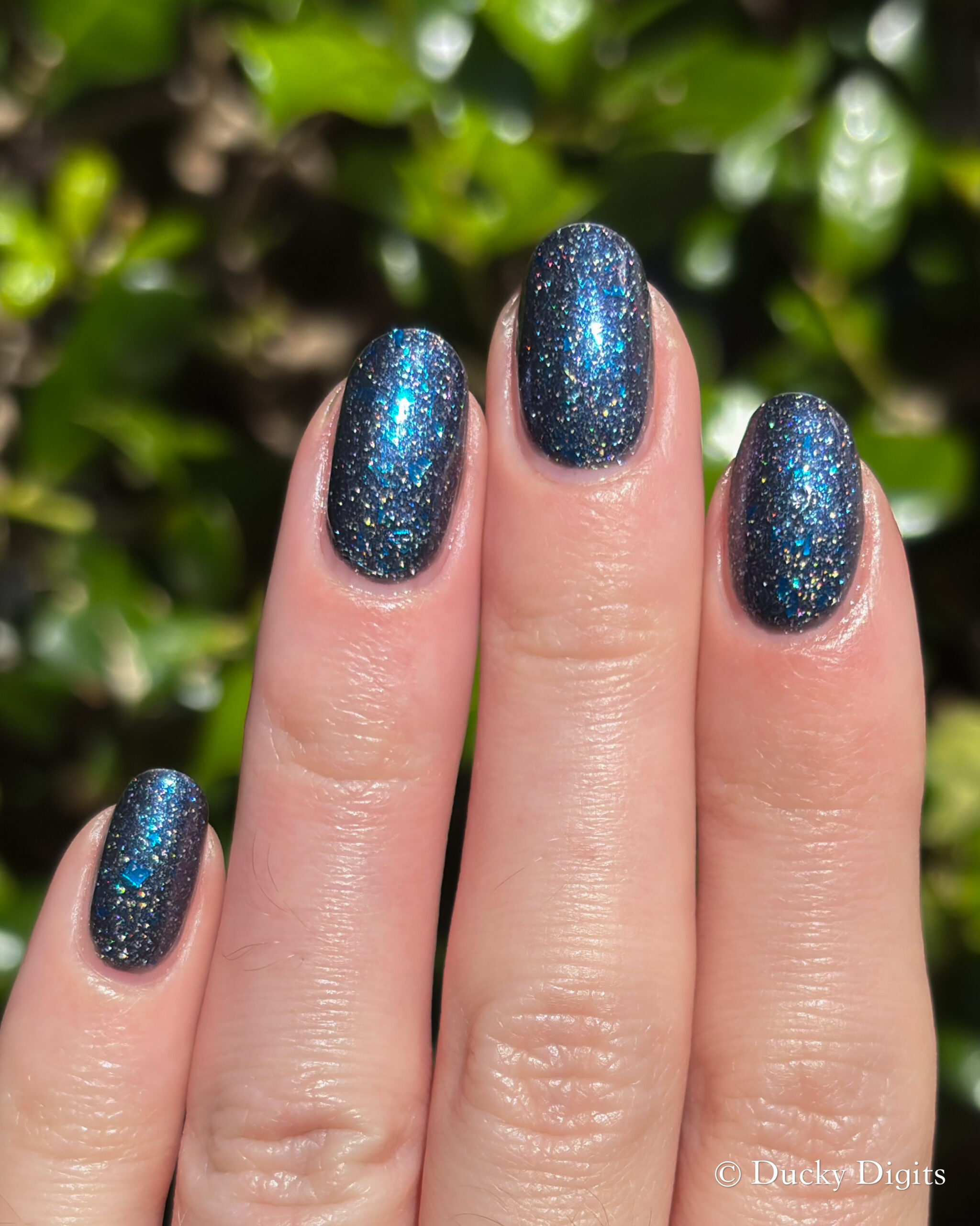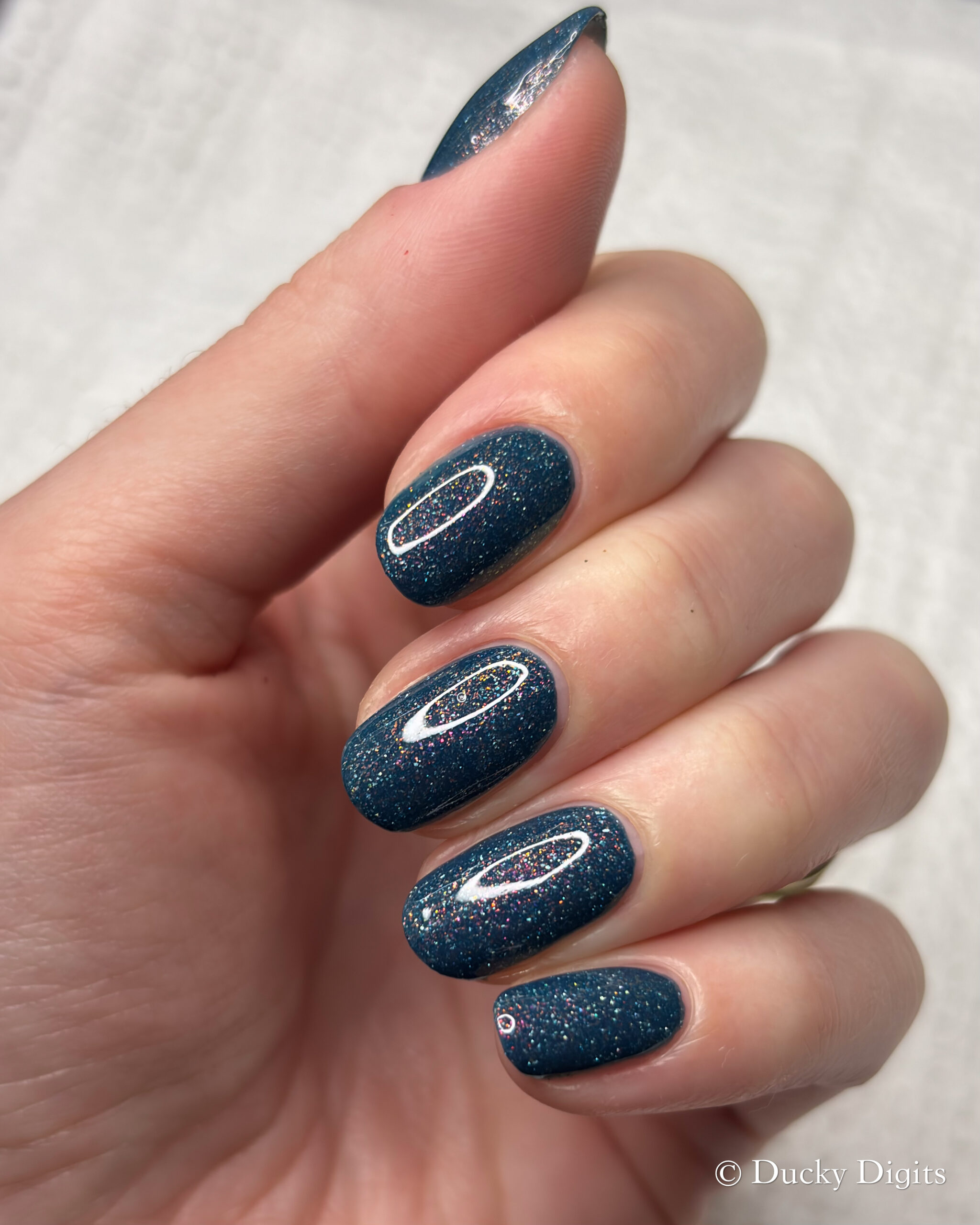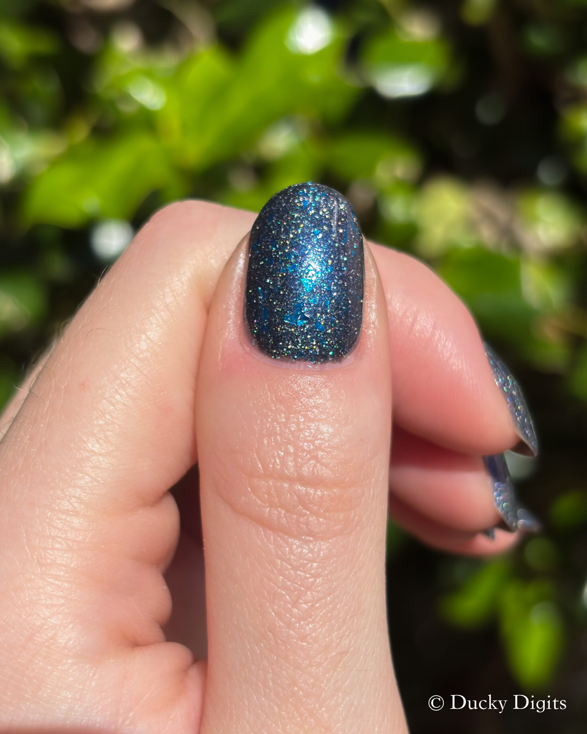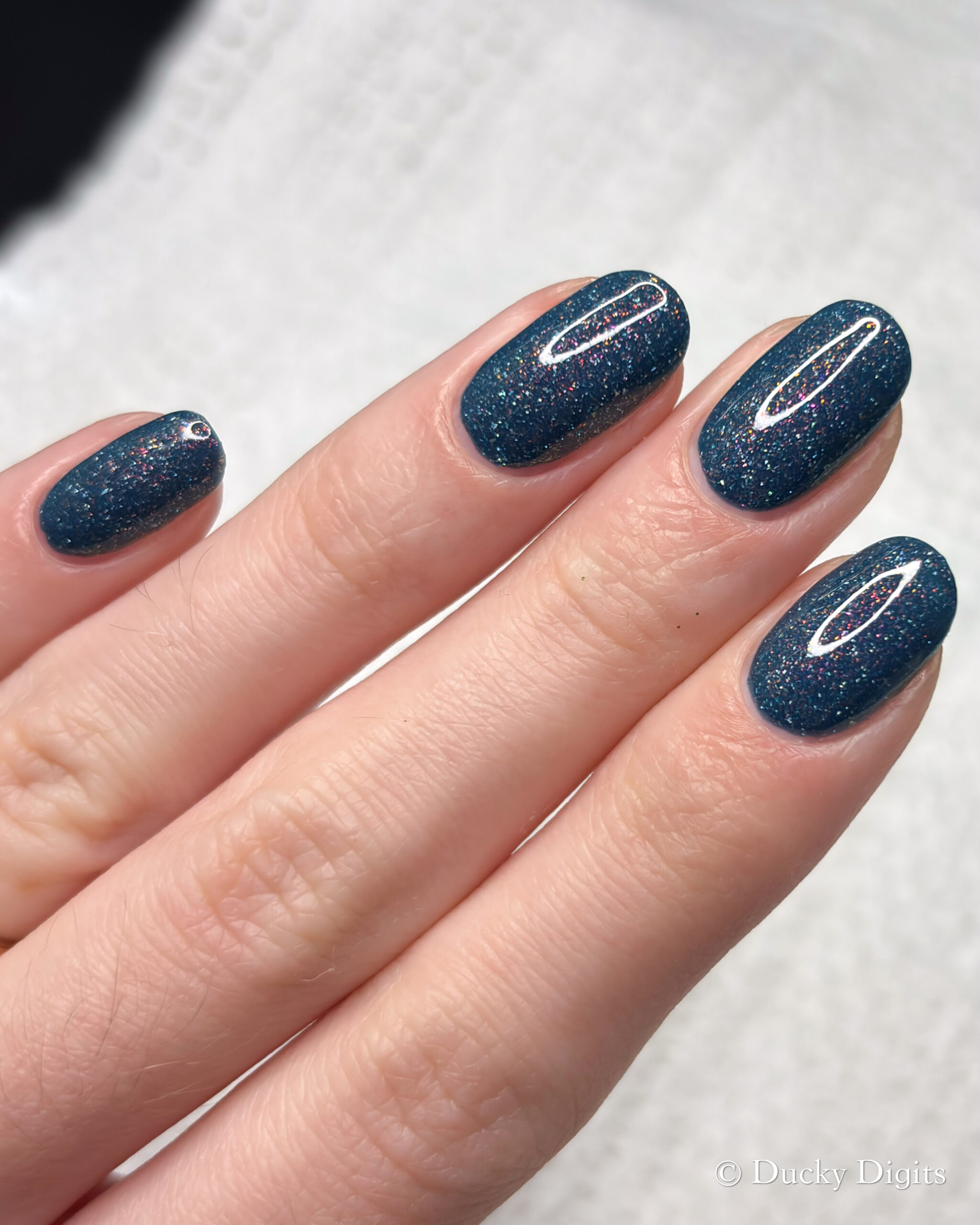 Shop, Hunt, & Drink is a dark teal crelly polish with blue undertones, loaded with color-shifting shimmer that shift pink/purple/red/orange/yellow/green, with holo flakes and light blue reflective glitters.