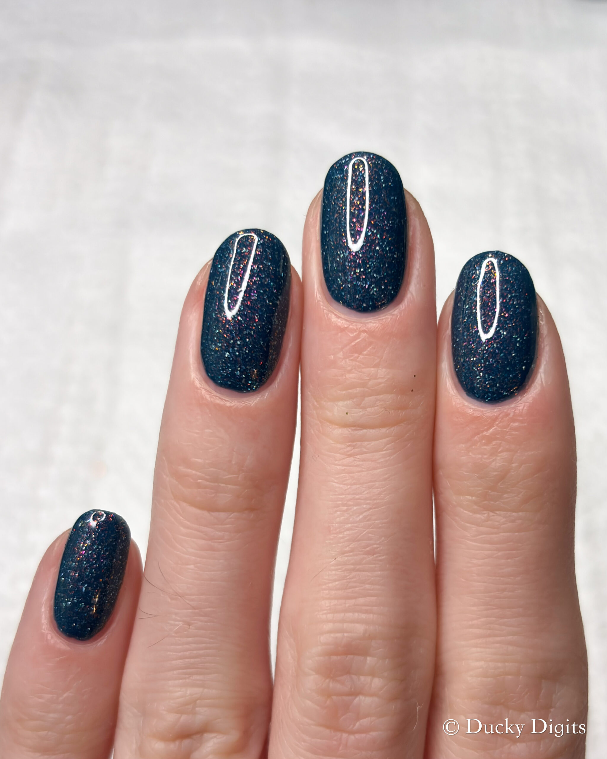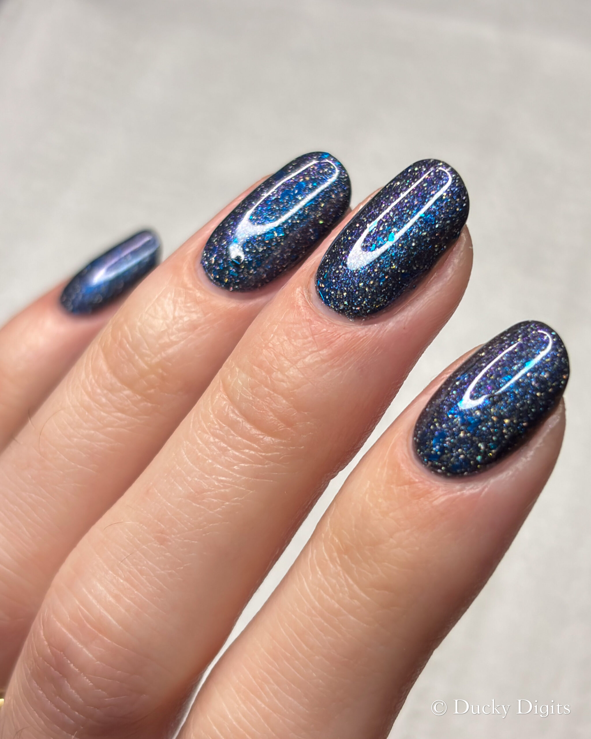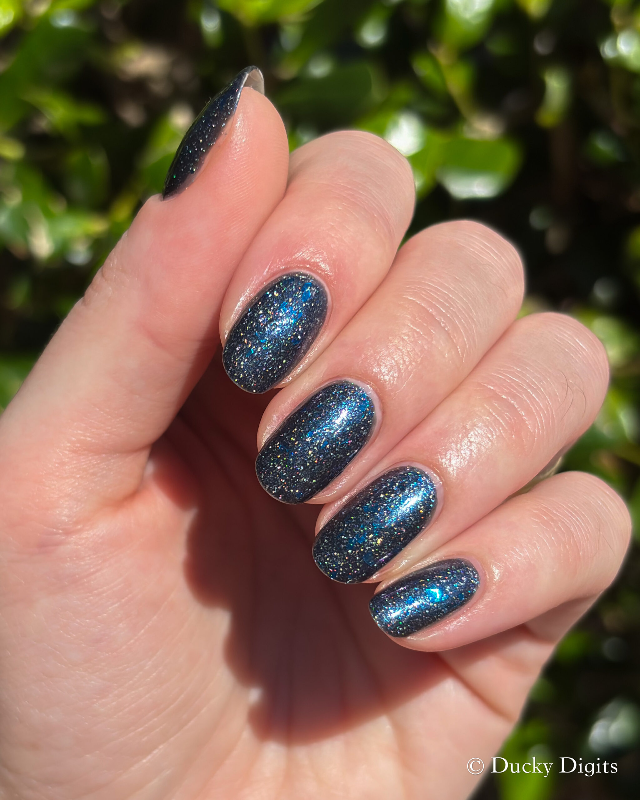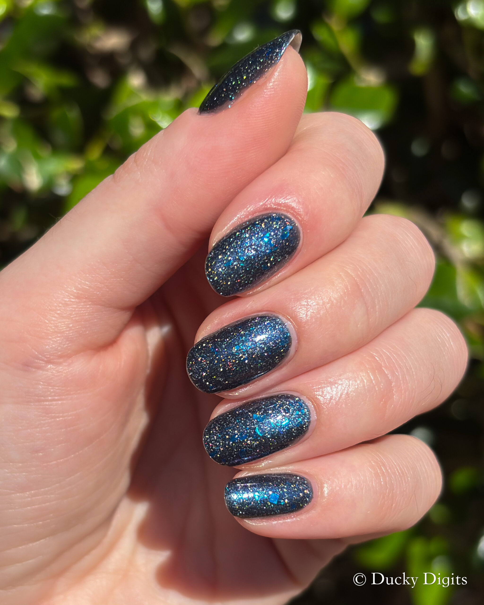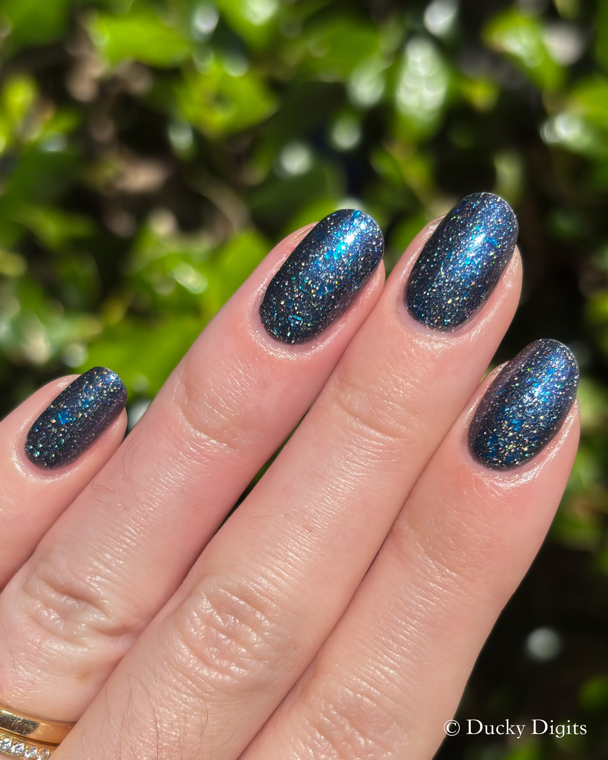 Shop, Hunt, & Drink is a dark teal crelly polish with blue undertones, loaded with color-shifting shimmer that shift pink/purple/red/orange/yellow/green, with holo flakes and light blue reflective glitters.