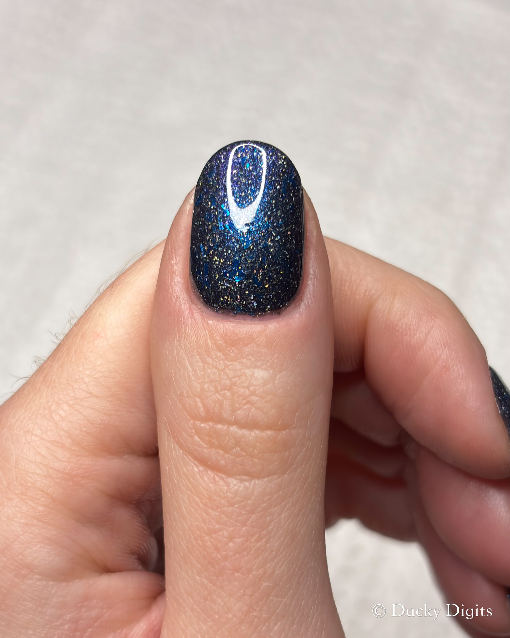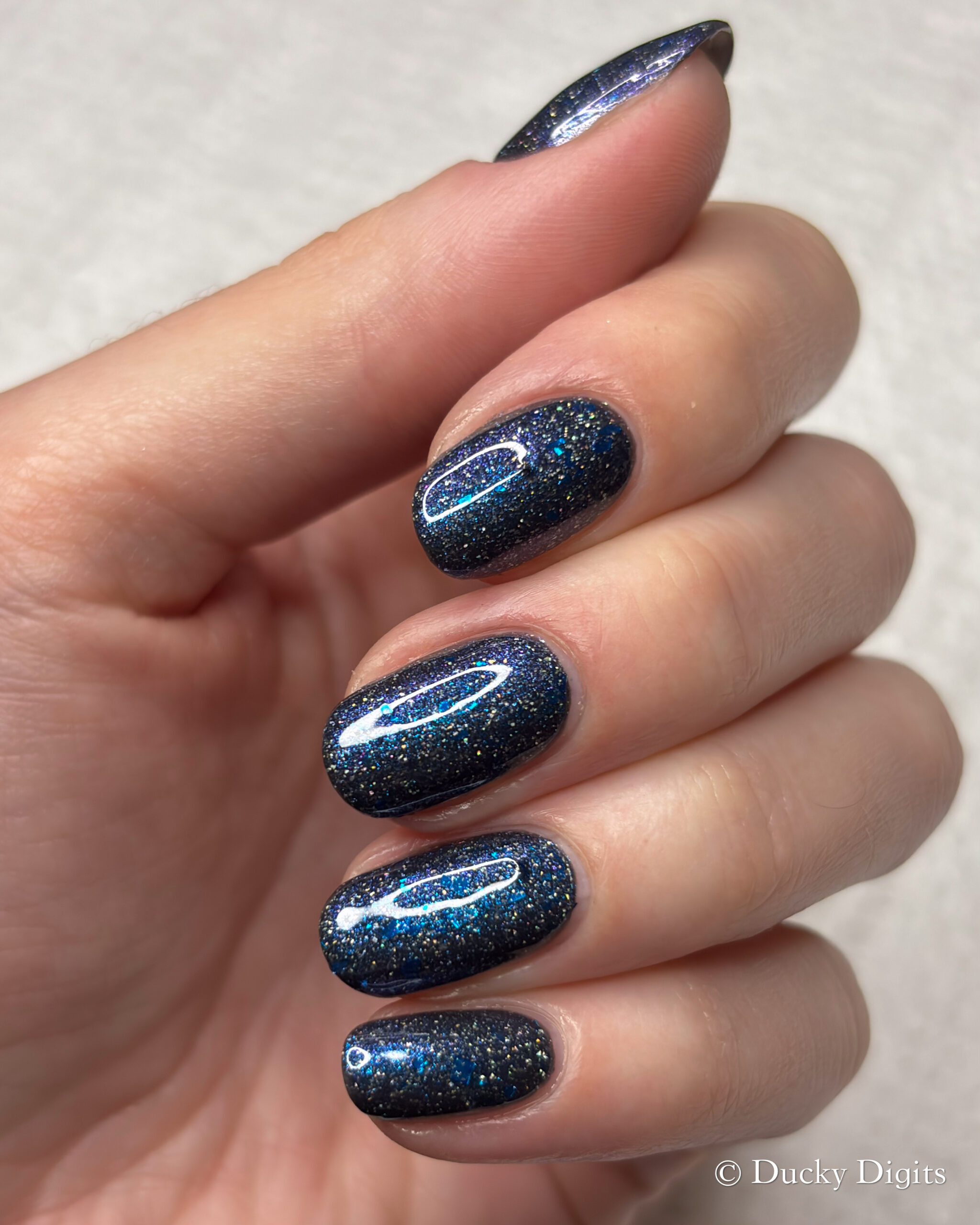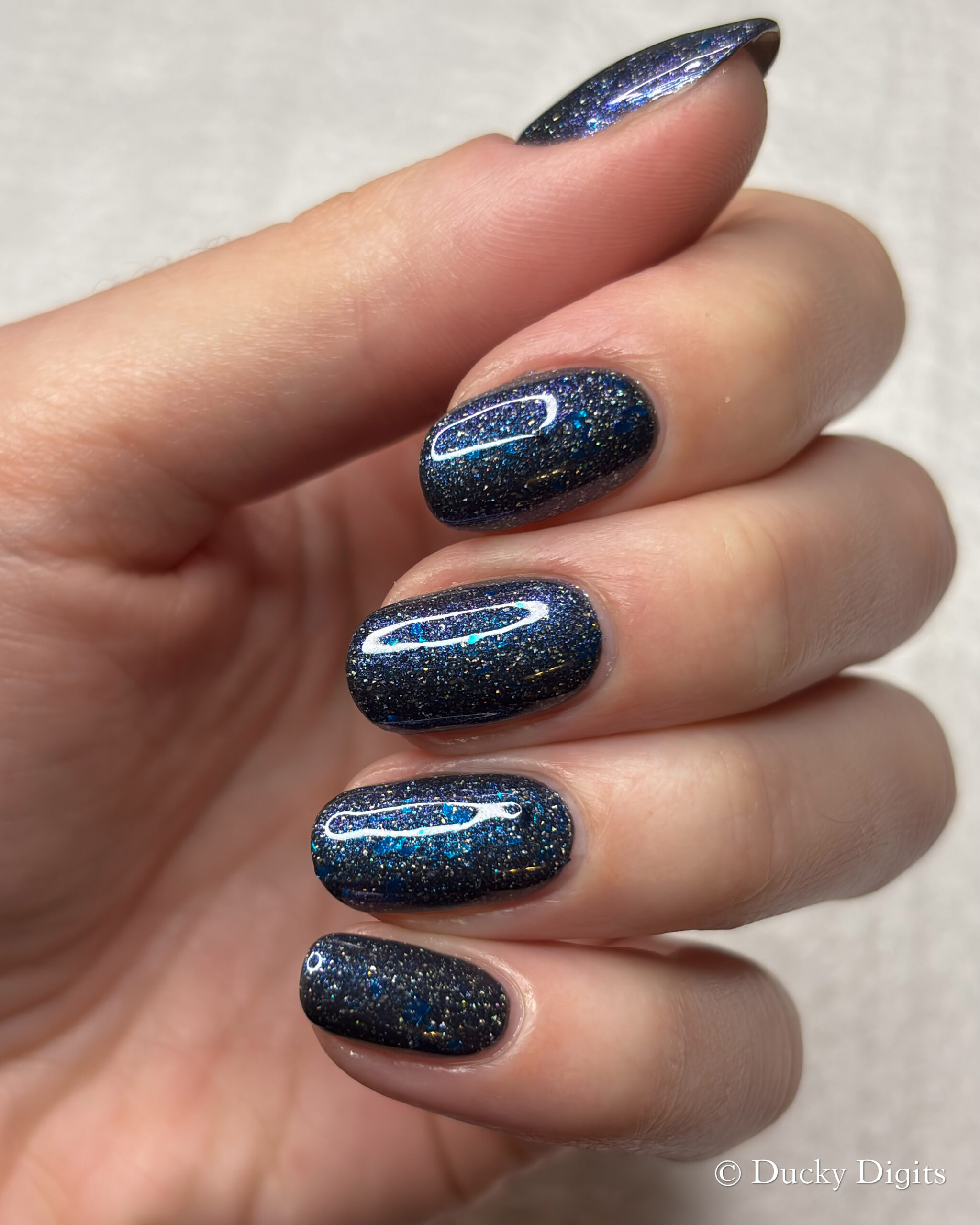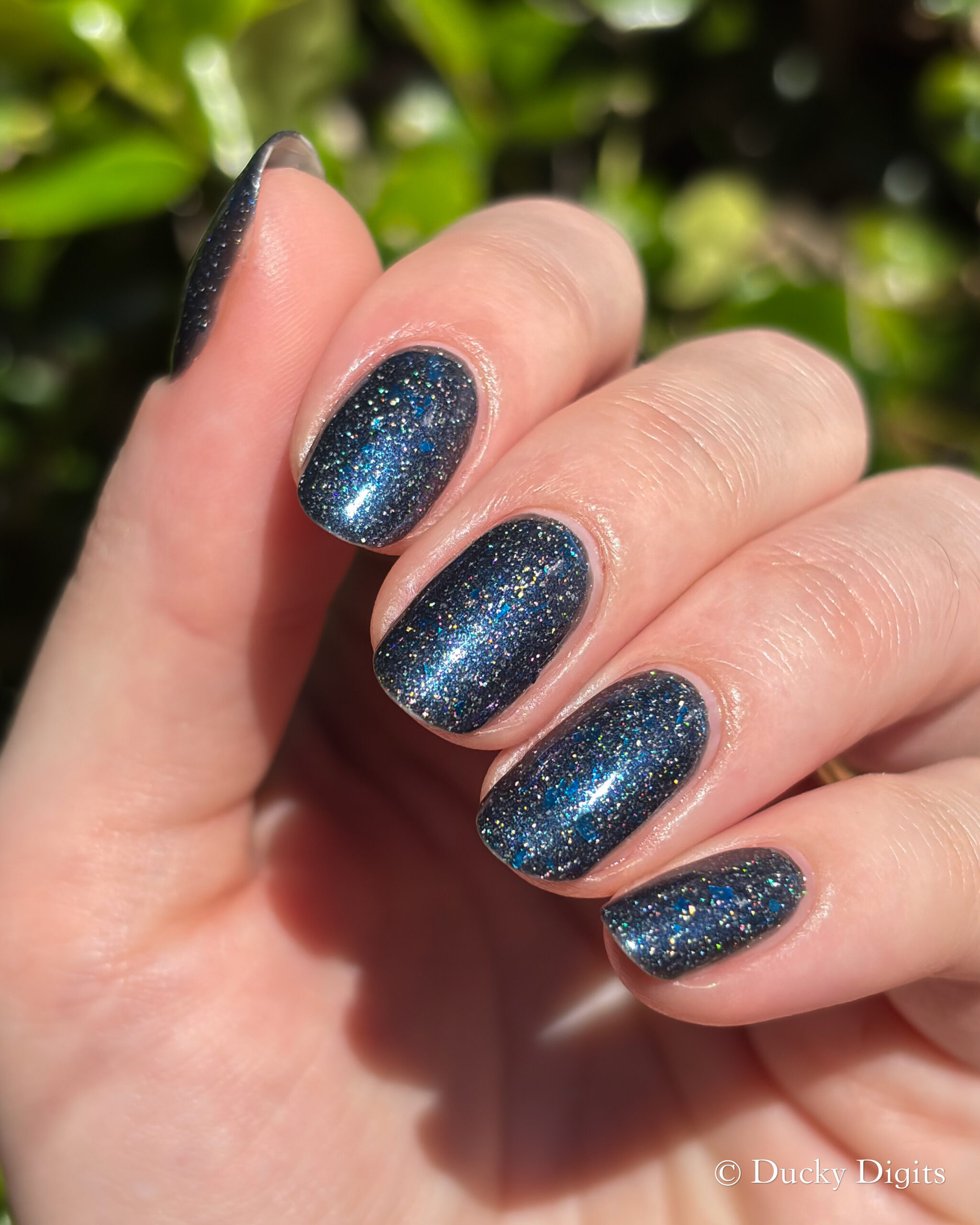 Shop, Hunt, & Drink is a dark teal crelly polish with blue undertones, loaded with color-shifting shimmer that shift pink/purple/red/orange/yellow/green, with holo flakes and light blue reflective glitters.