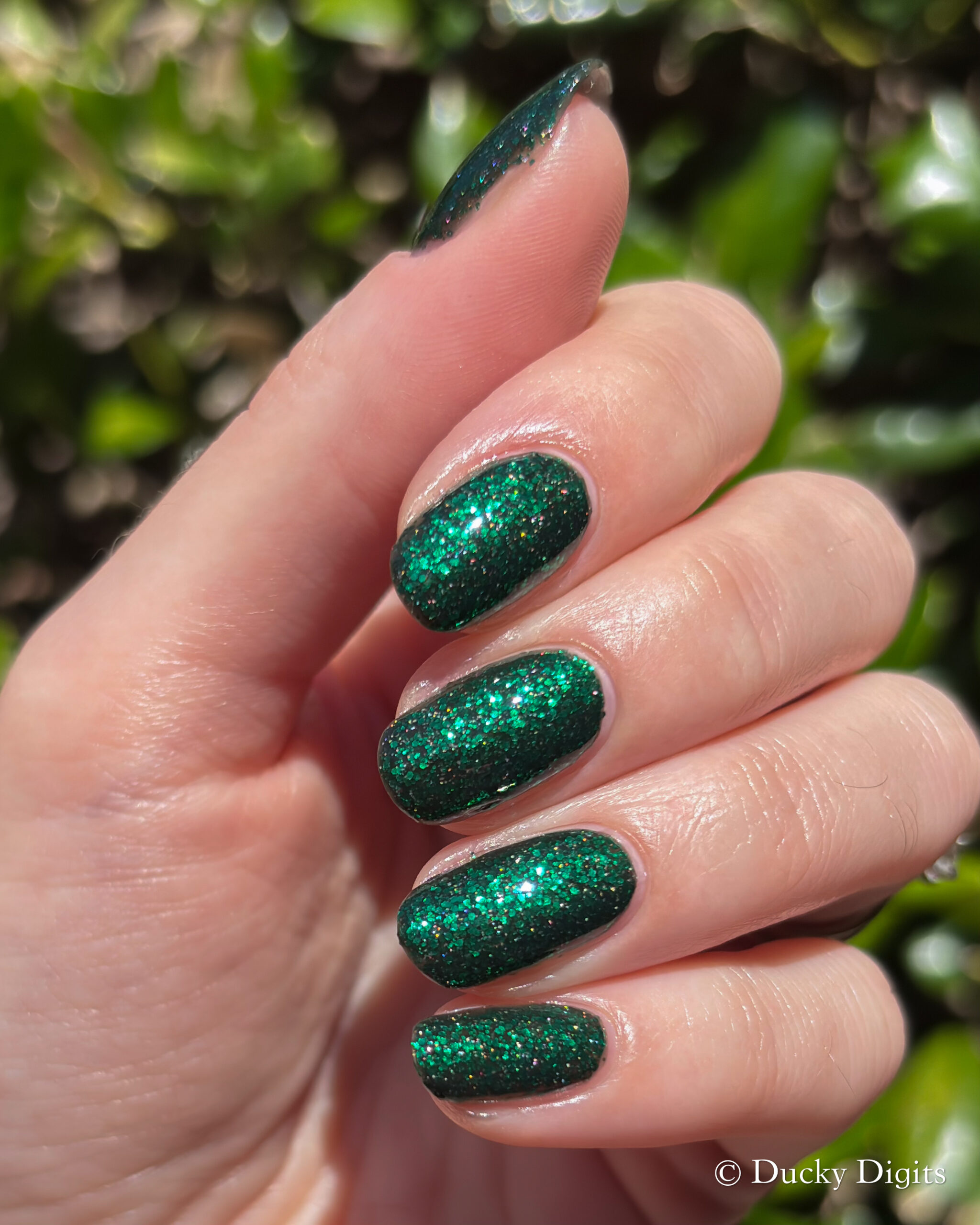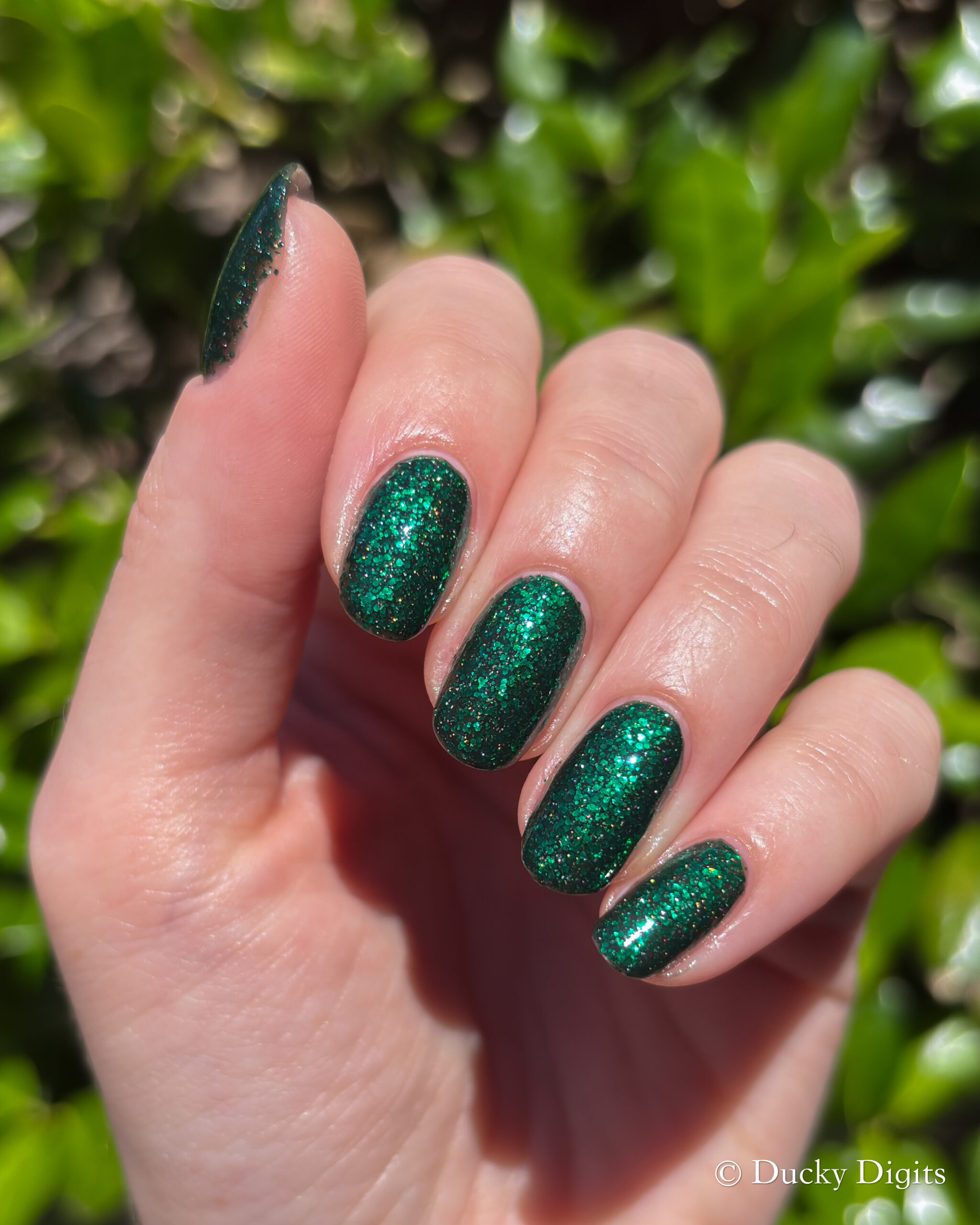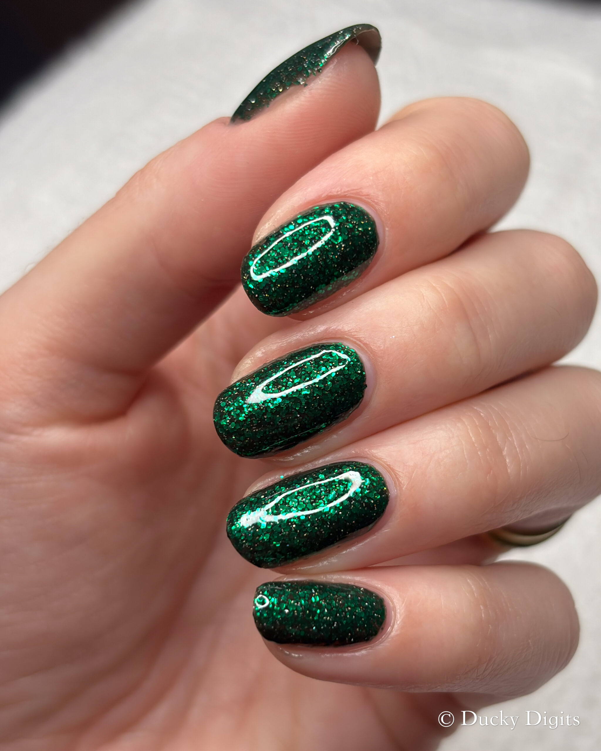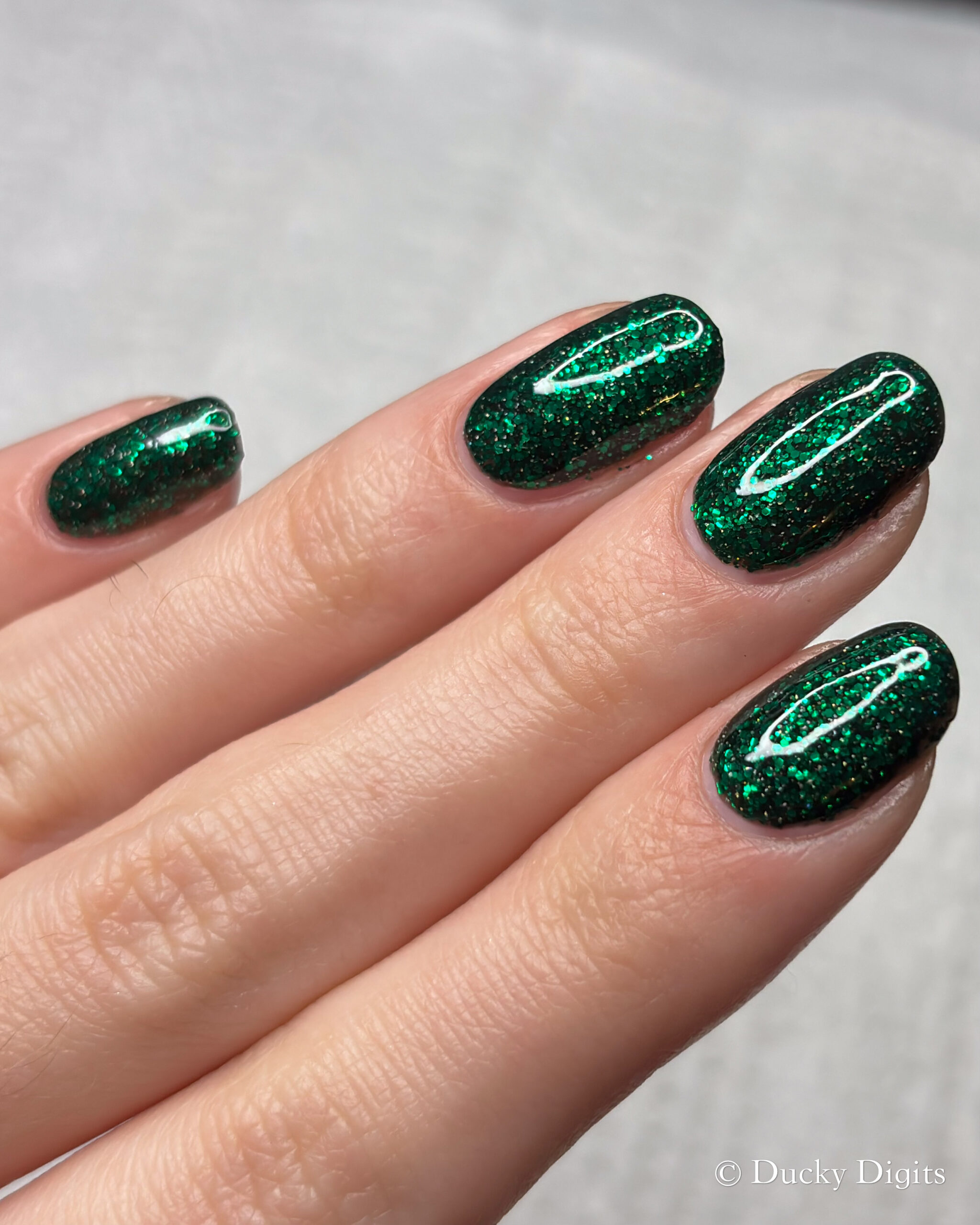 I Believe In Doing Whatever The F*ck I Want is a black-based jelly polish loaded with various sized hex emerald glitters and holo flakes.