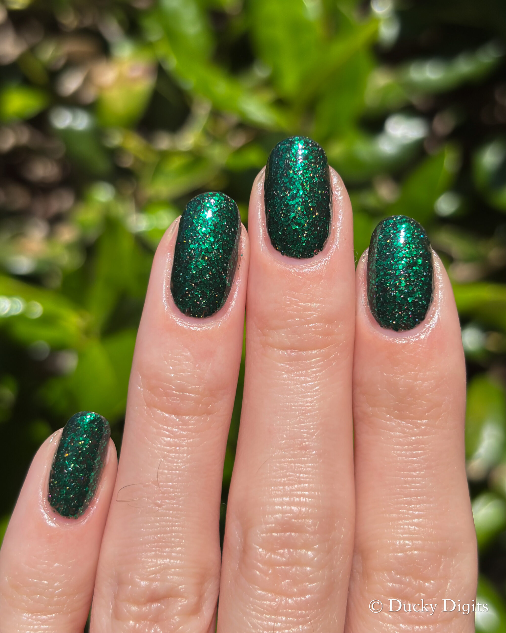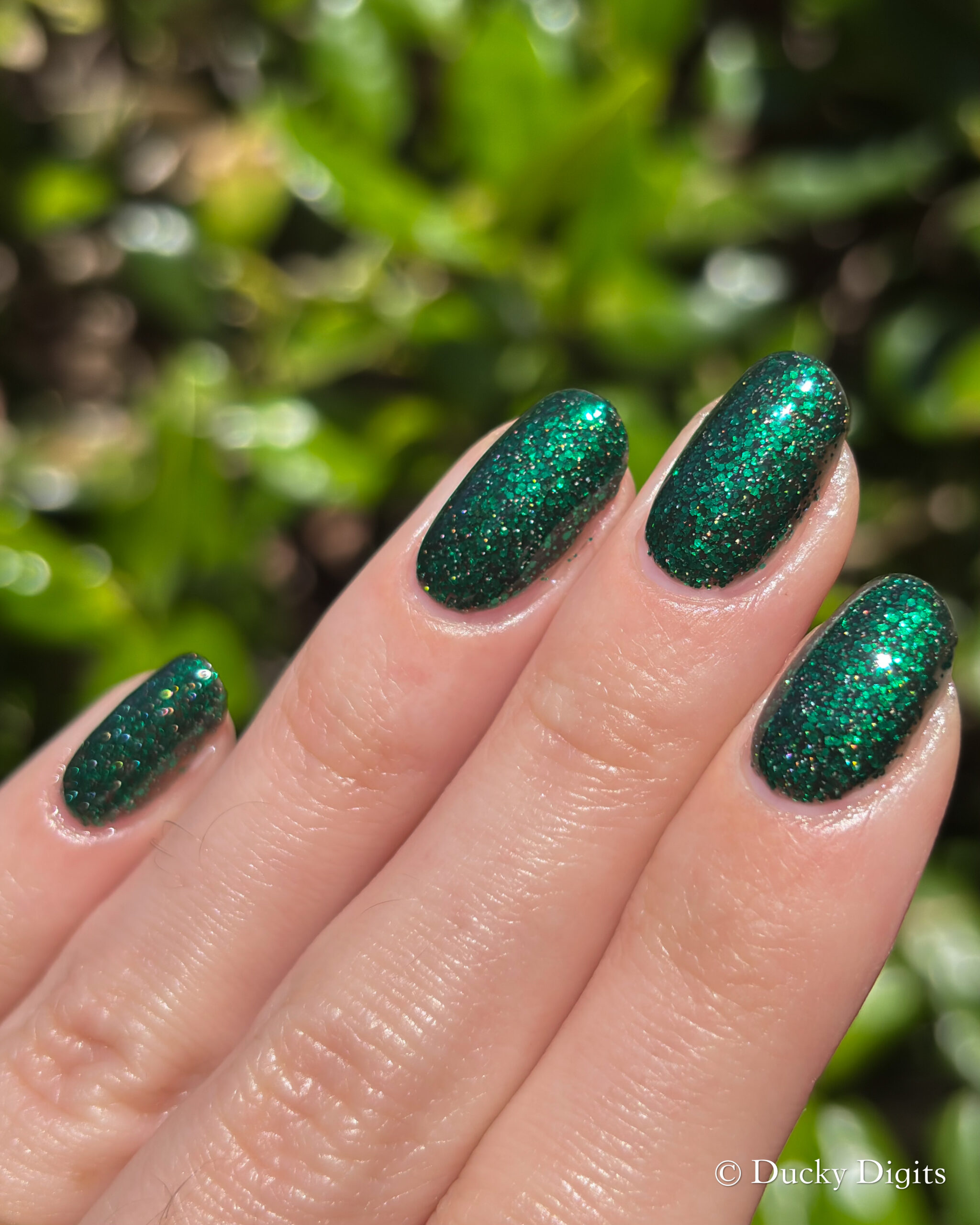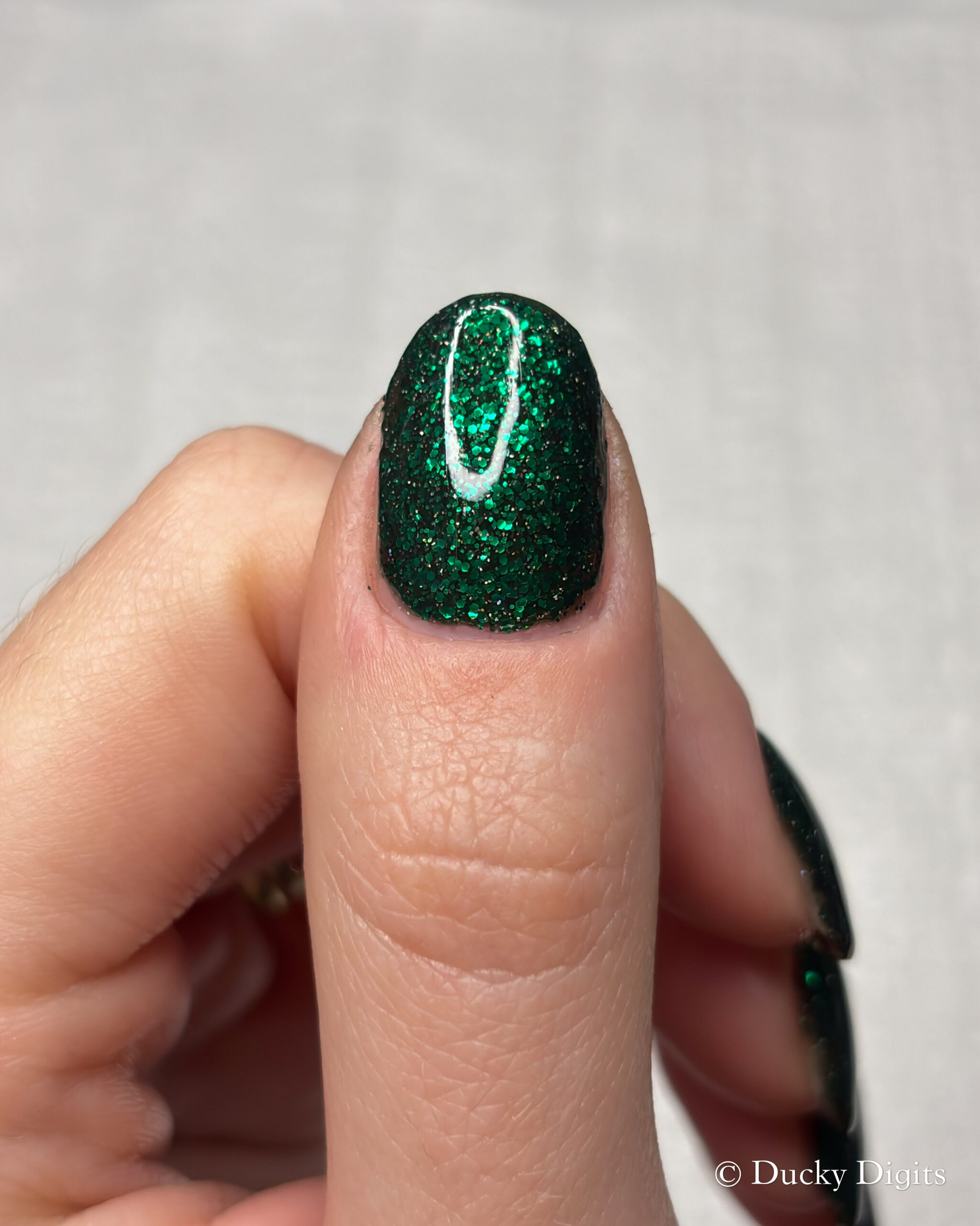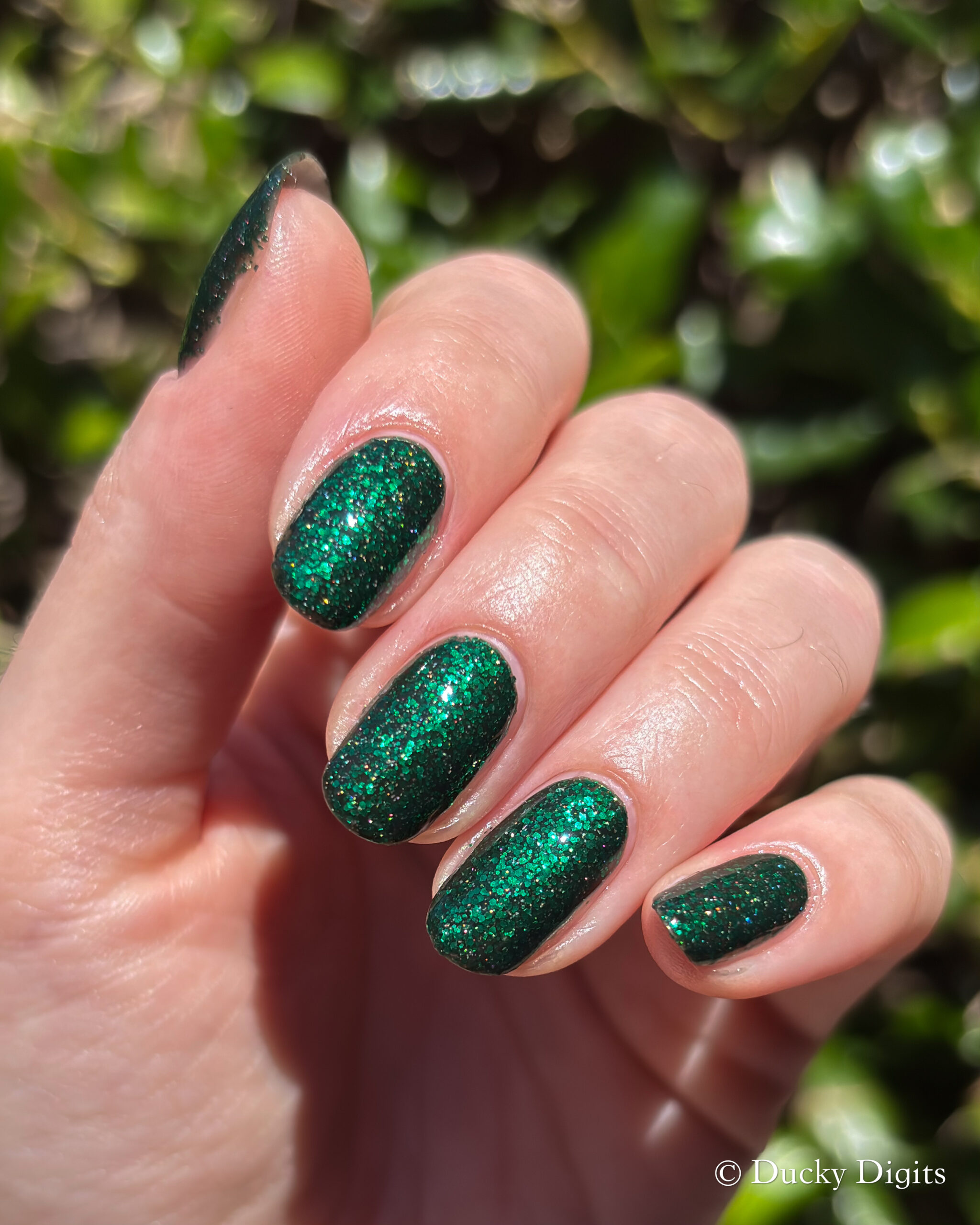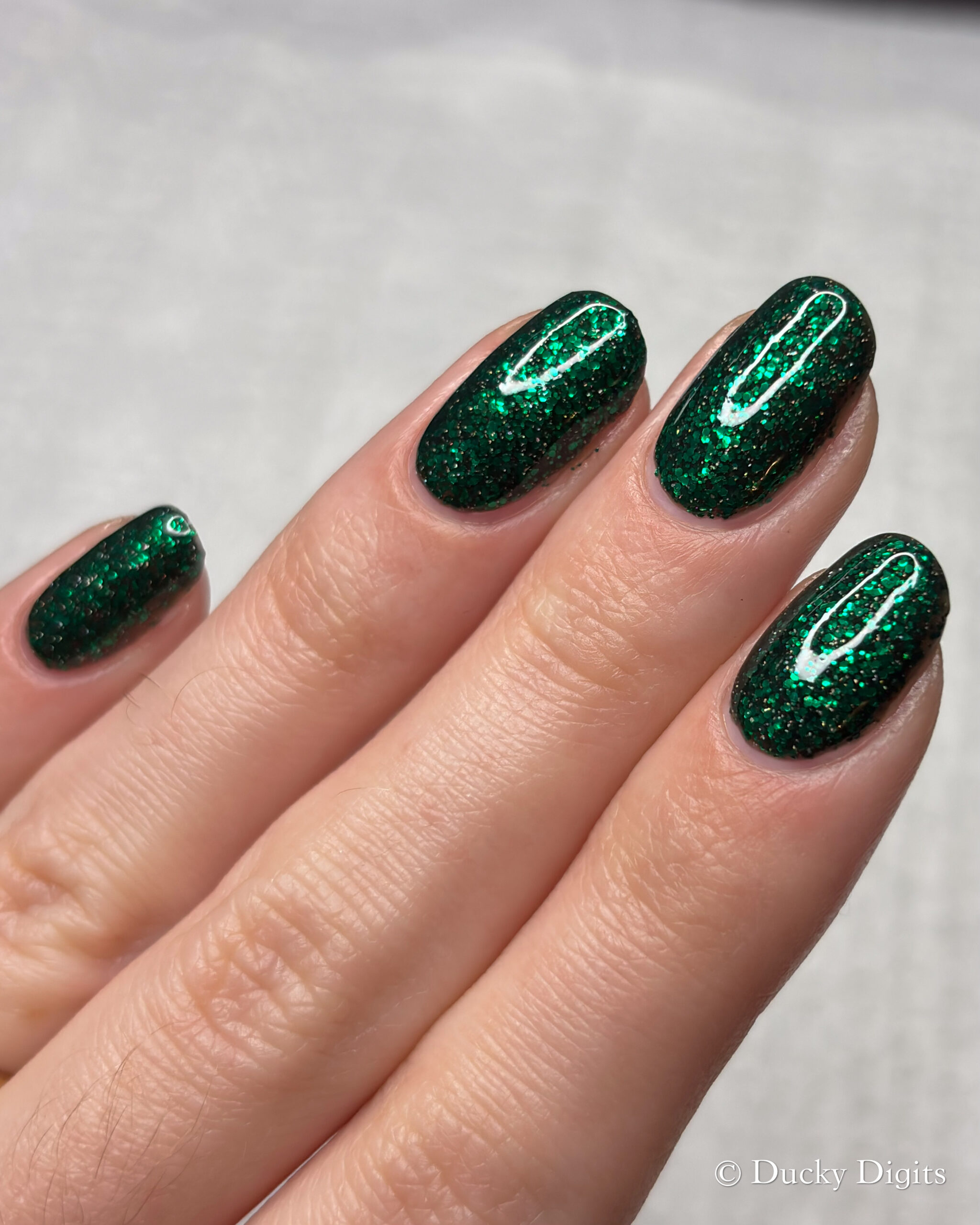 I Believe In Doing Whatever The F*ck I Want is a black-based jelly polish loaded with various sized hex emerald glitters and holo flakes.