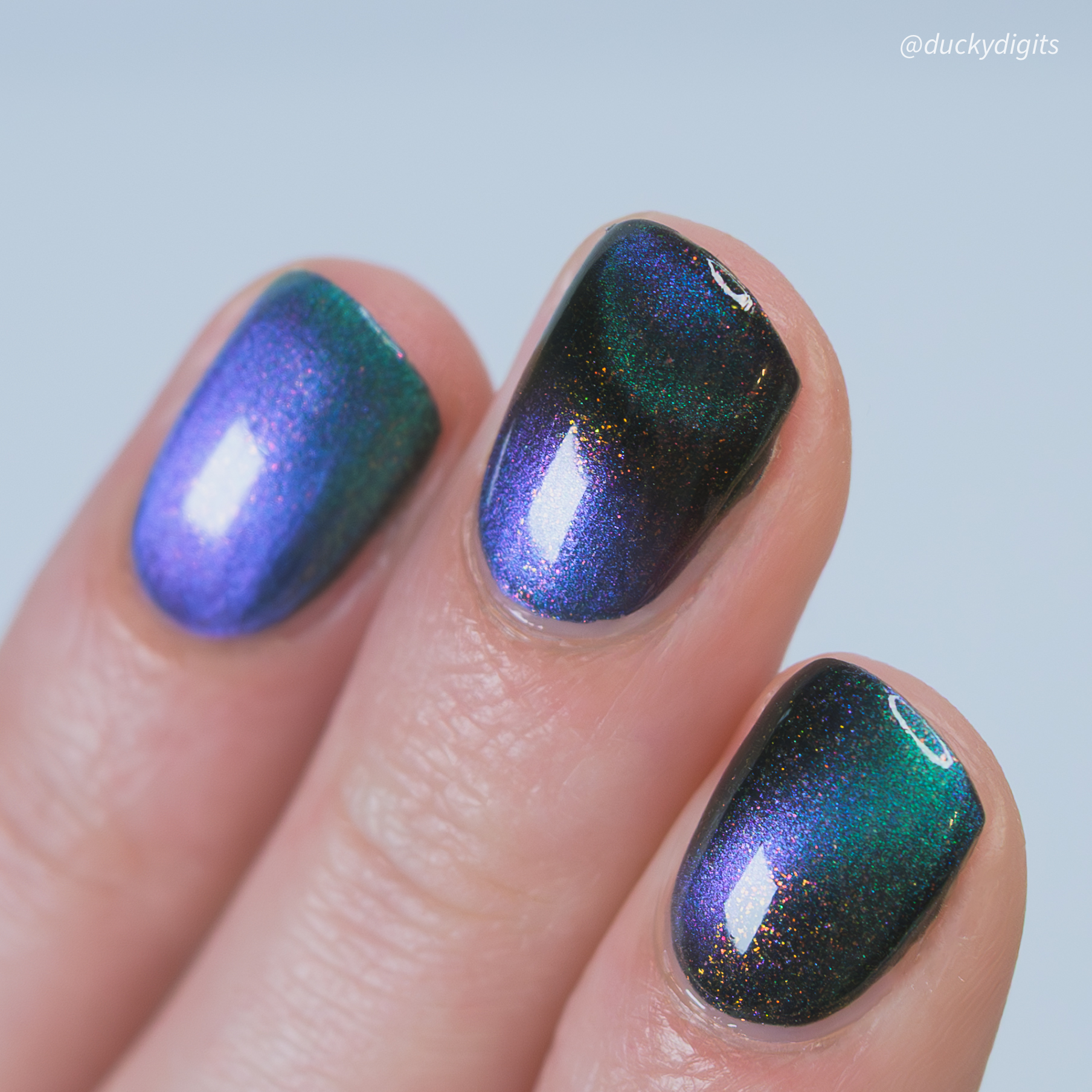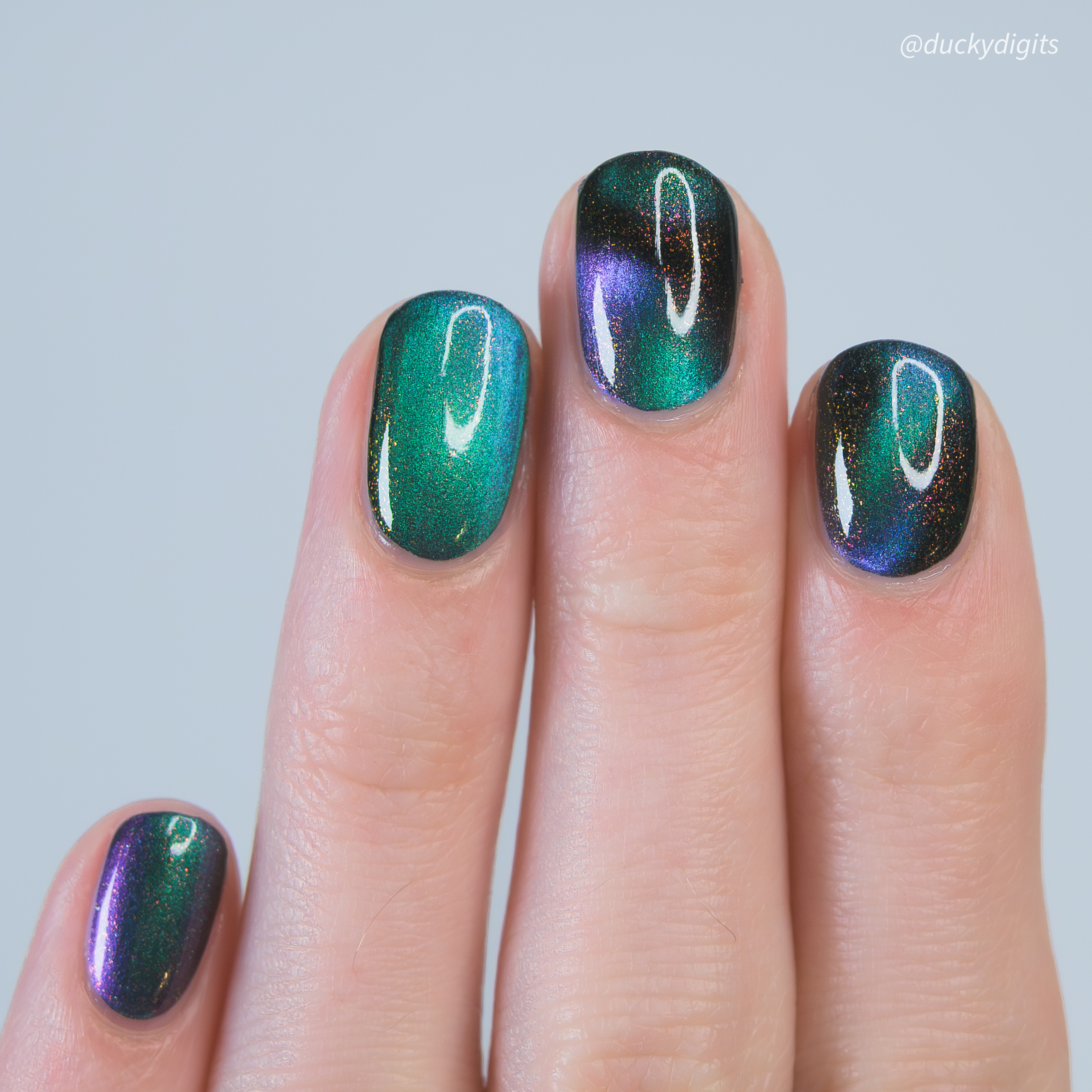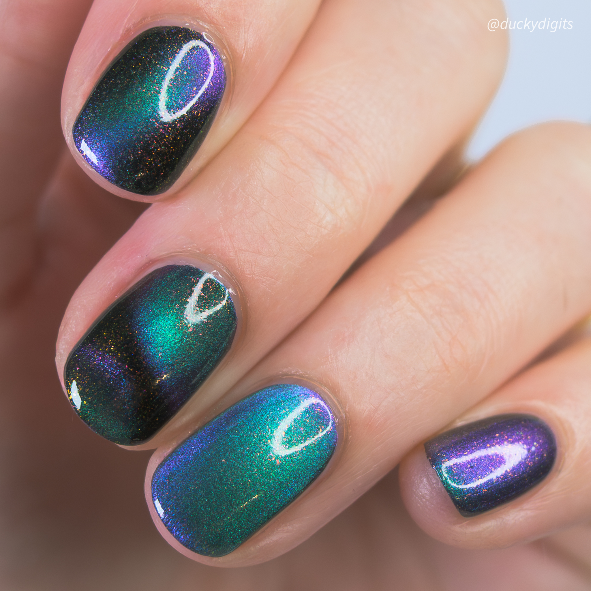 I am wearing it in 2 coats with a glossy top coat. From thumb-to-pinky: ring magnet, cat-eye, ring magnet, velvet, unmag’d.