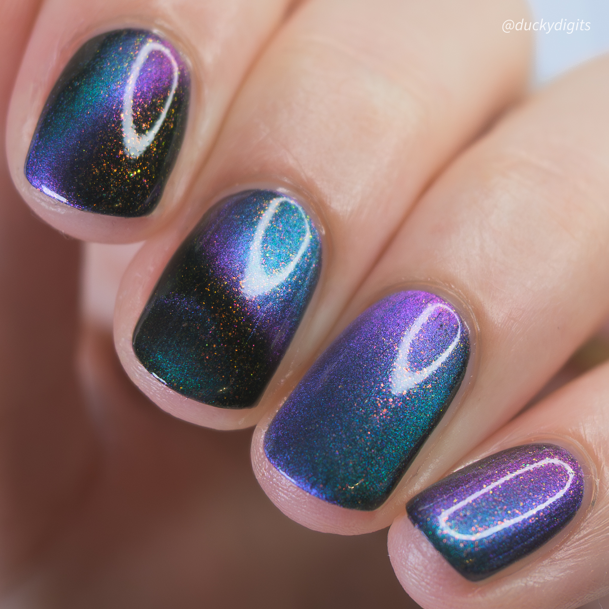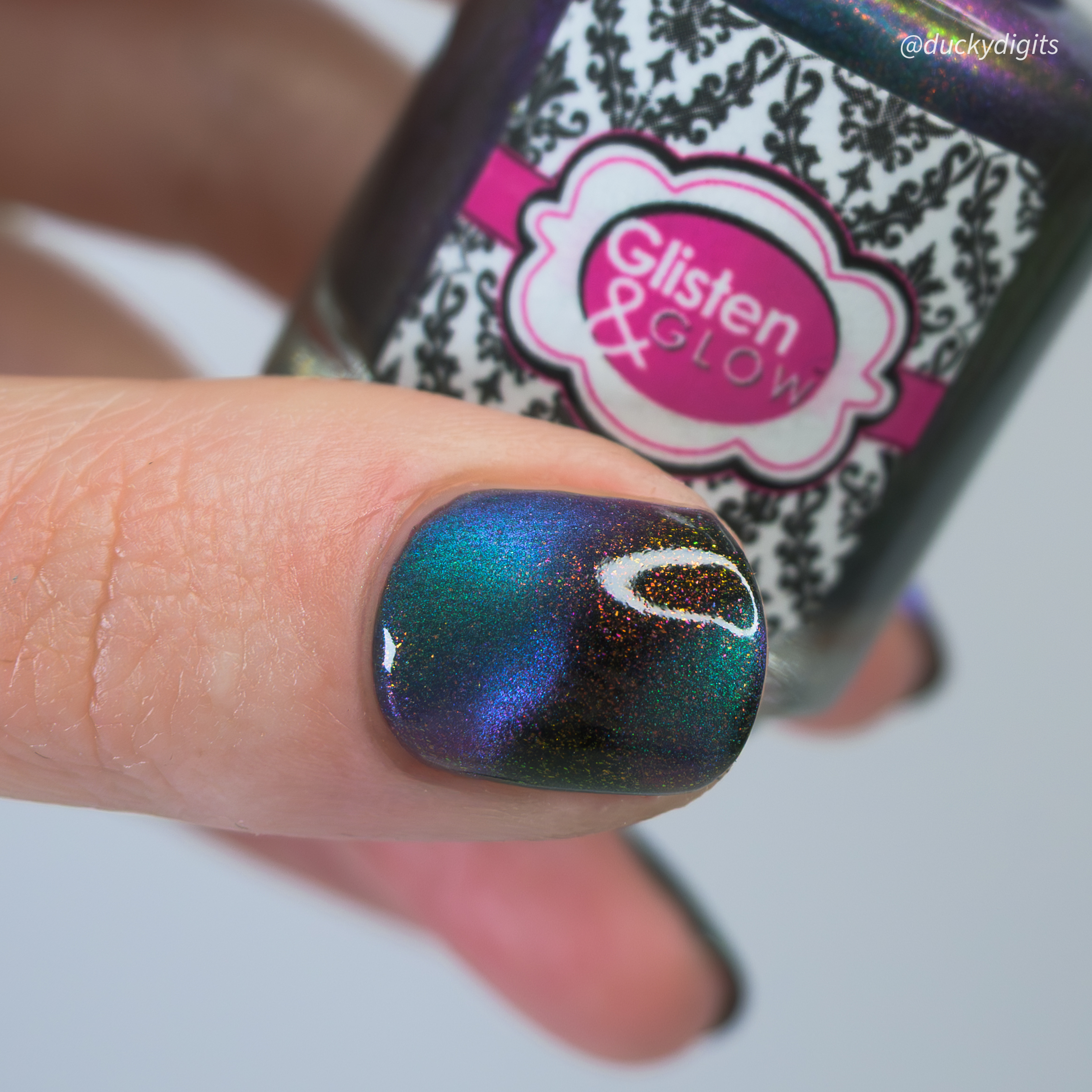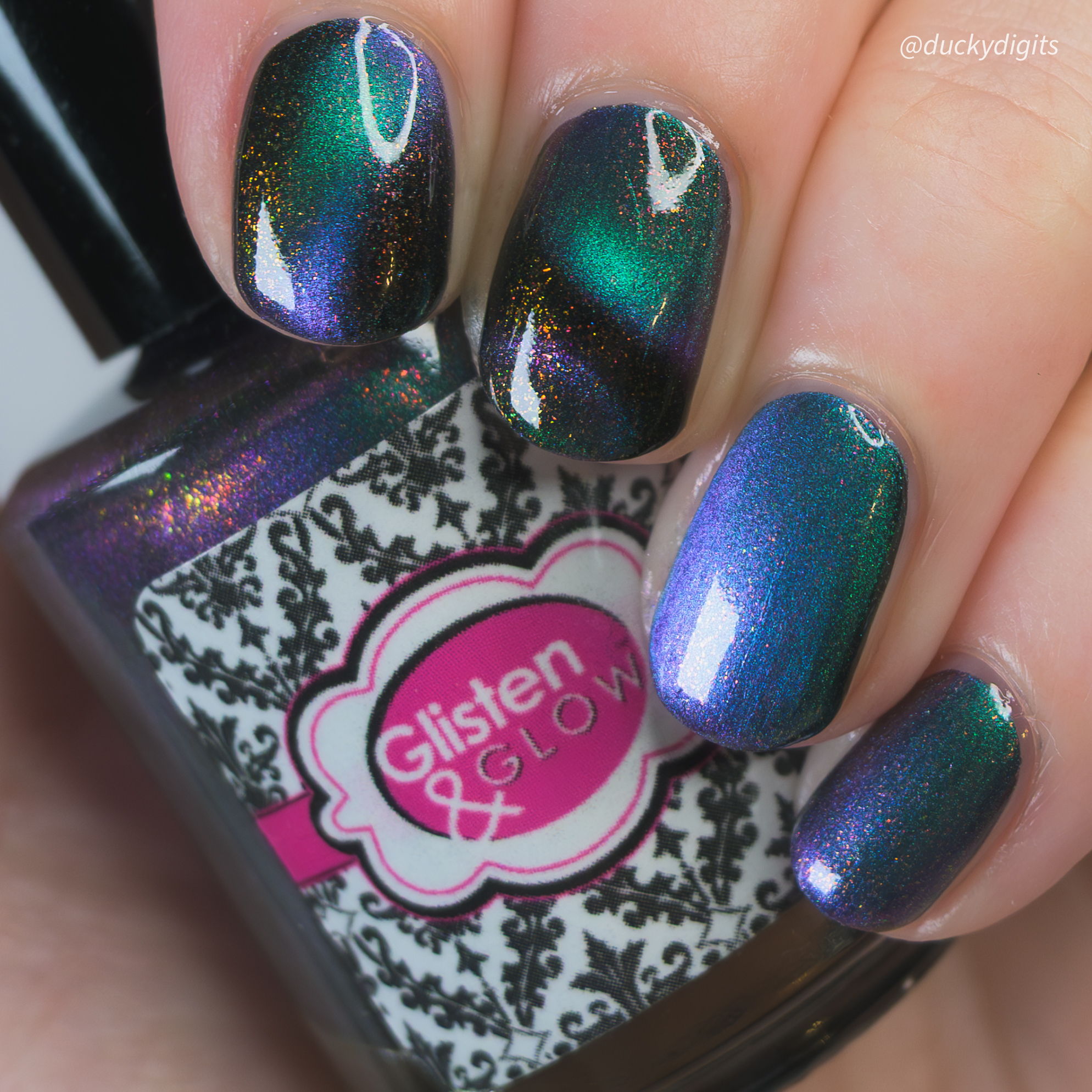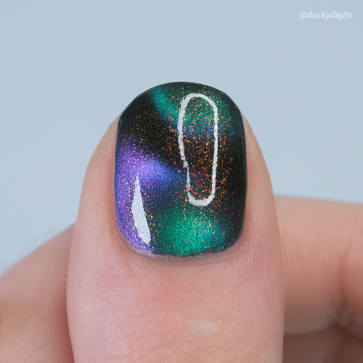 Glisten & Glow has been on a freaking roll recently with her magnetic polishes! And she is so consistent with her formulas. This one is no different. It’s quite opaque already in one coat, but you probably will want to go up to two to get the base color just a bit darker and fuller. The magnetic pigment is also extremely shifty and easy to magnetize. Because the pigment has so many different color shifts, I would highly recommend going with magnetizations like the cat-eye or ring magnet effects (so an effect where you can see the base color). It just seemed more interesting to me and did the polish elements justice in those styles.