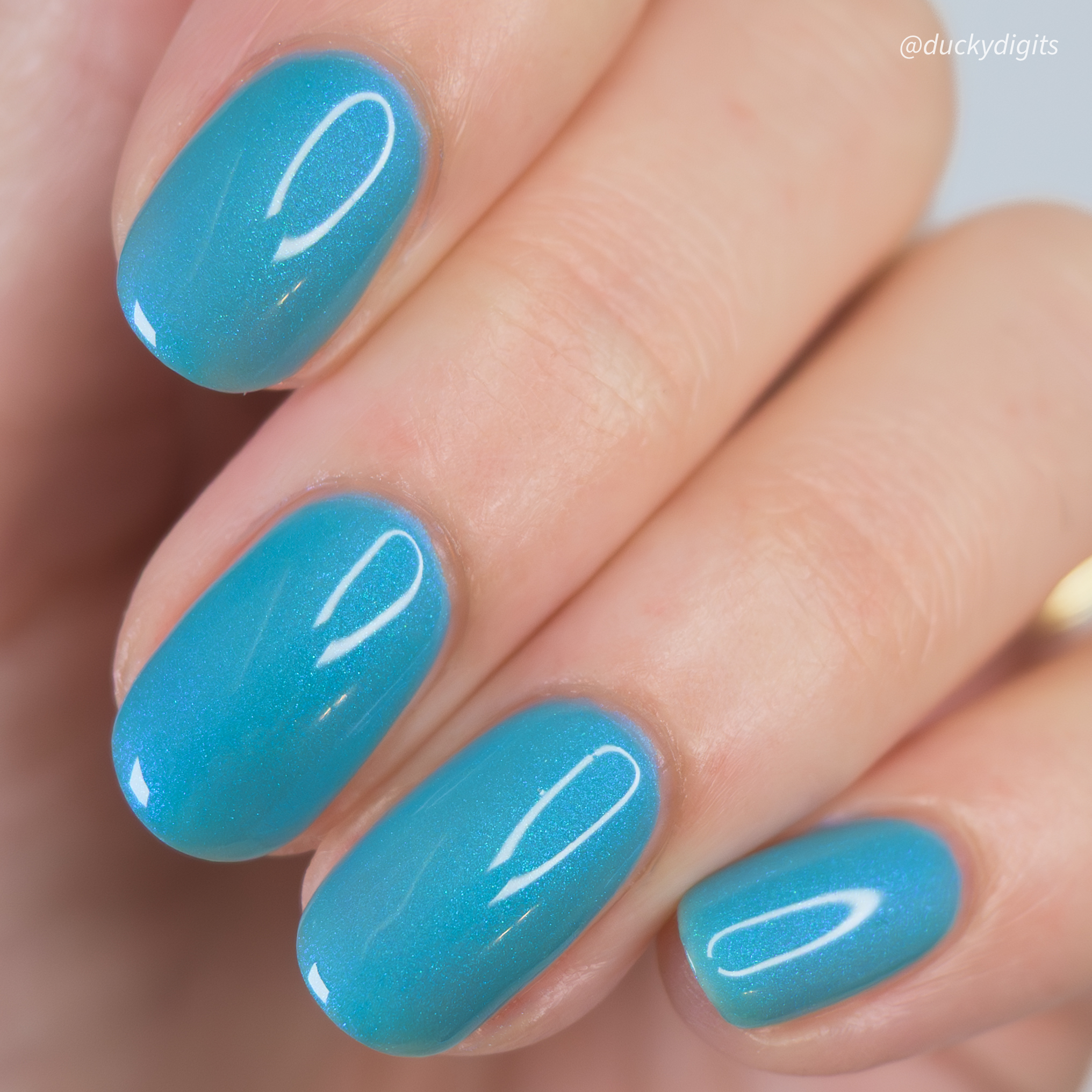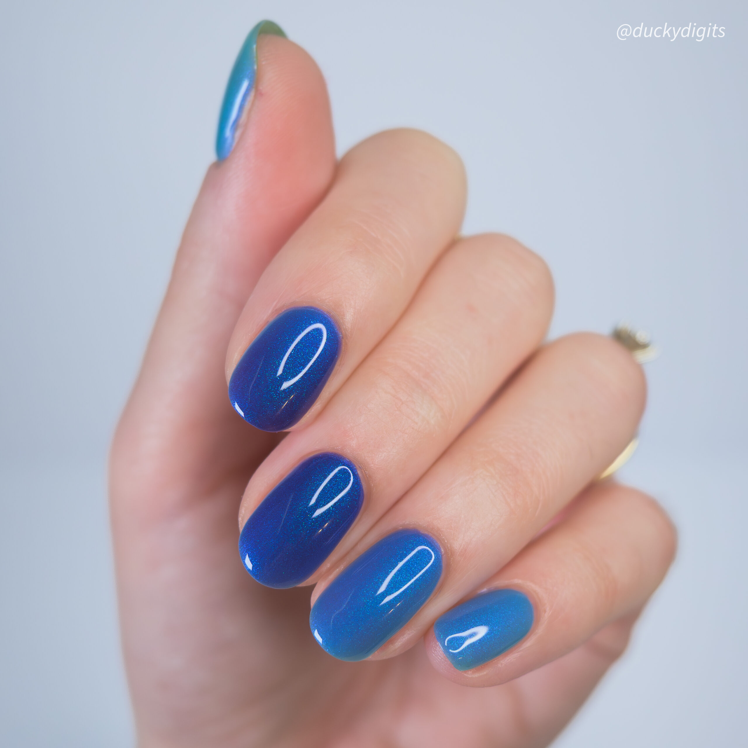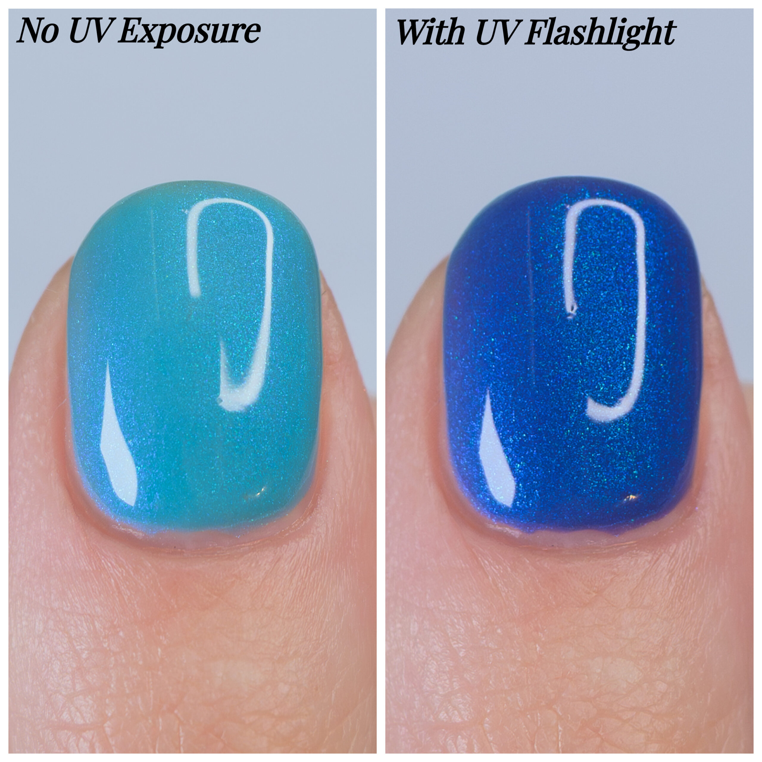I’ll admit, I was a little underwhelmed when this one was announced. It just didn’t seem that interesting aside from the solar aspect. However, my tune changed when I put it on. It’s not necessarily a “unique” polish, but it is timeless in its colors and shimmer. I feel like the base, non-UV color is like an upgraded Tiffany blue with the added shimmer. It’s very flattering on my skin tone and I would wear it without UV exposure any day. The darker blue solar transition is also incredibly eye-catching, and I love seeing it transition between the two. It’s perfect for the upcoming summer!