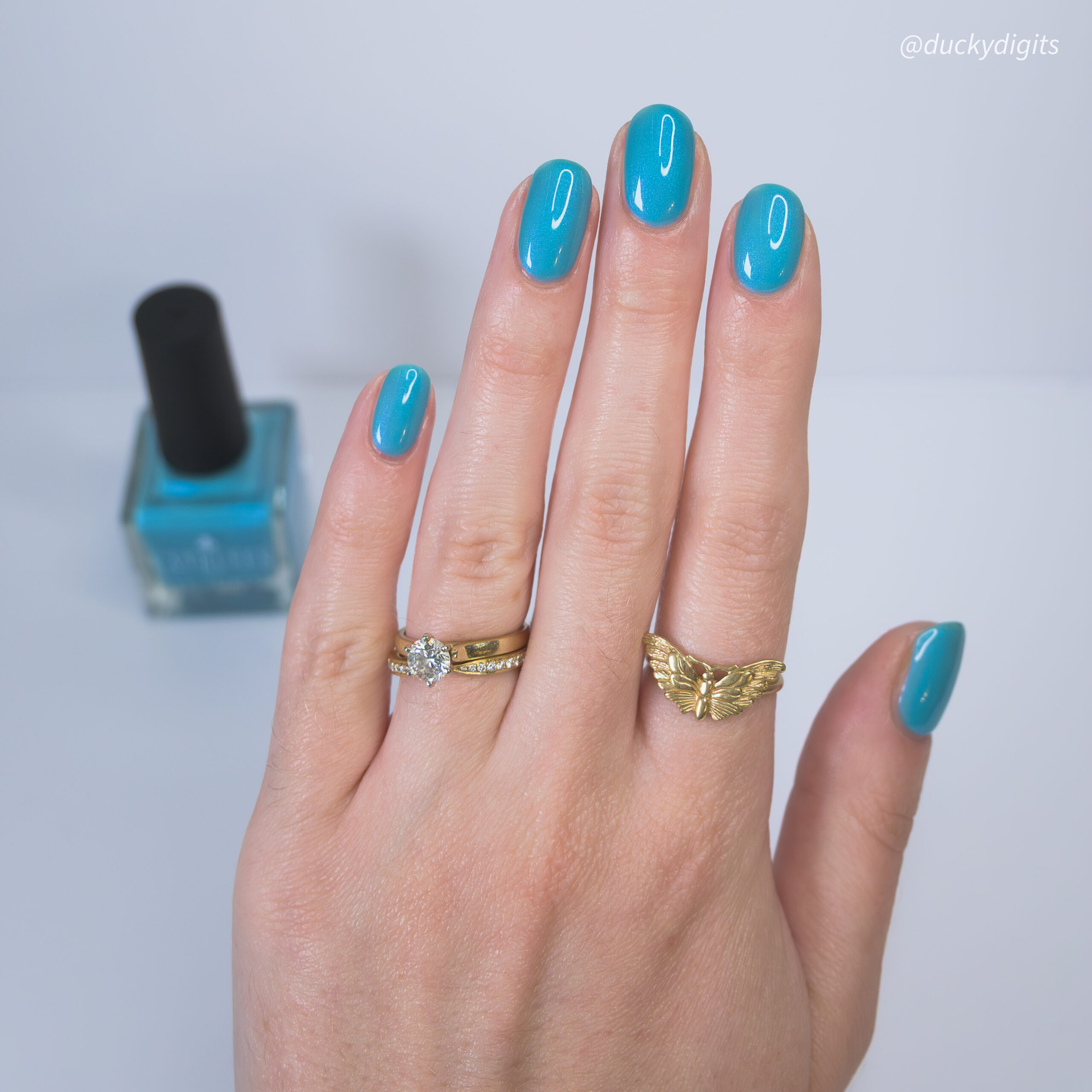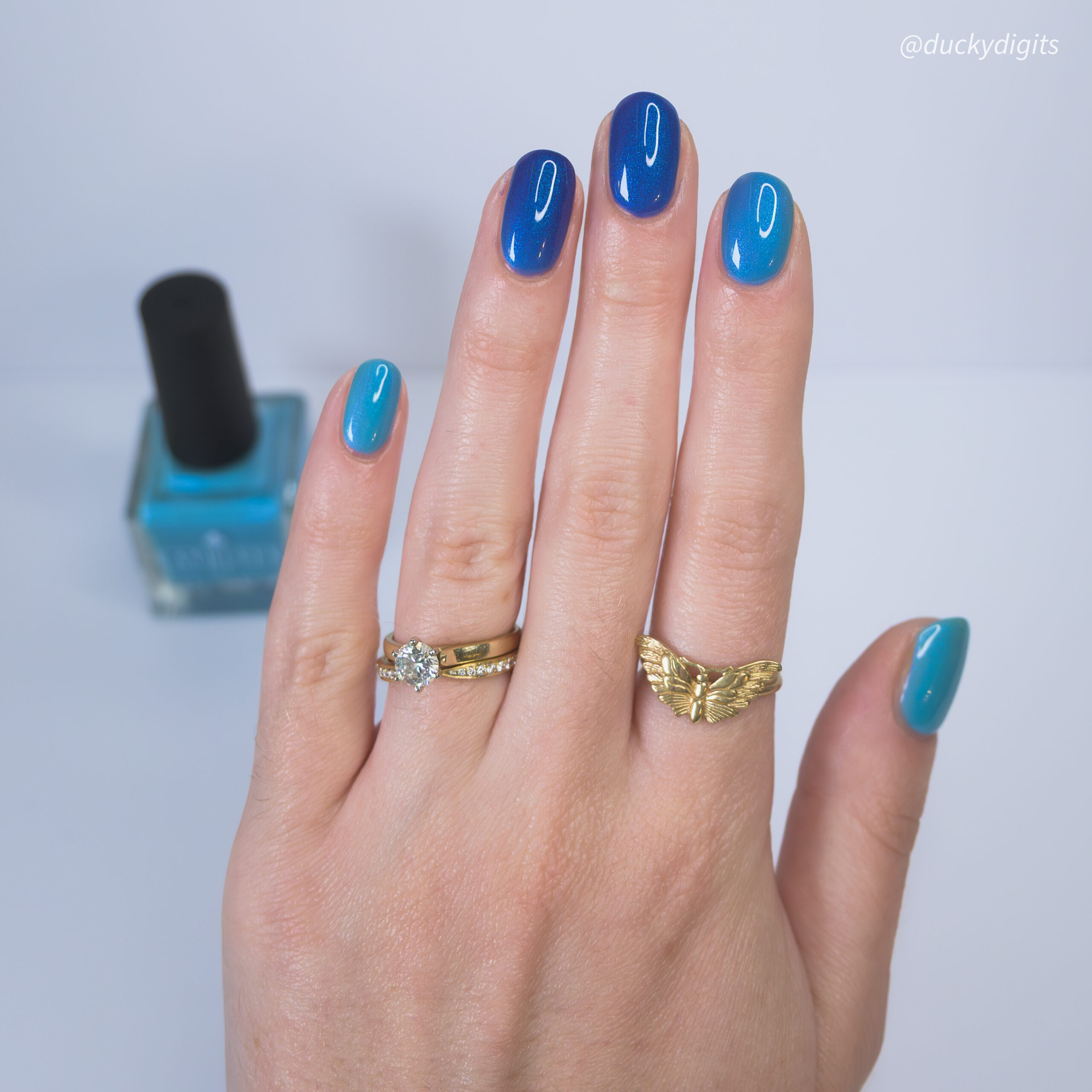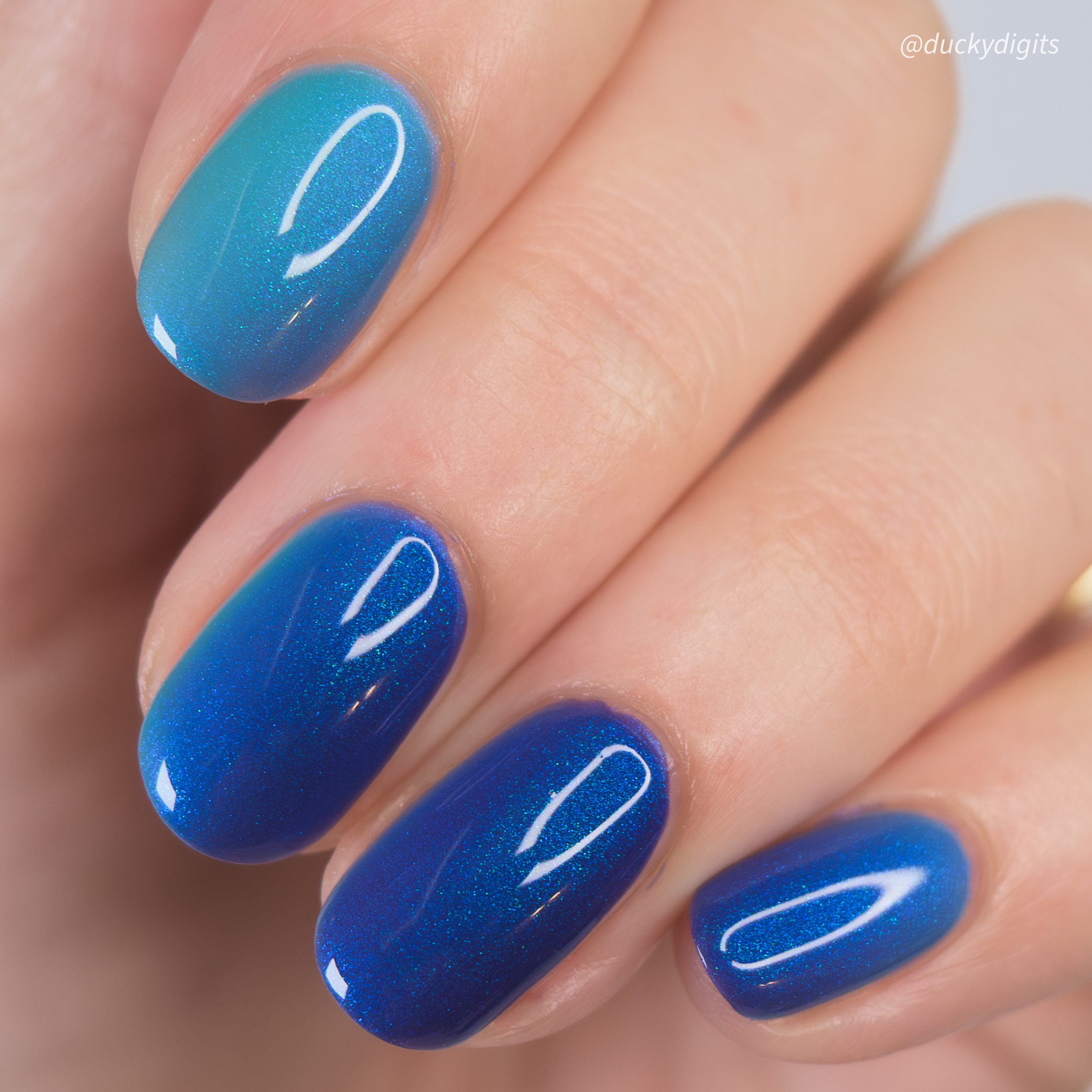I’ll admit, I was a little underwhelmed when this one was announced. It just didn’t seem that interesting aside from the solar aspect. However, my tune changed when I put it on. It’s not necessarily a “unique” polish, but it is timeless in its colors and shimmer. I feel like the base, non-UV color is like an upgraded Tiffany blue with the added shimmer. It’s very flattering on my skin tone and I would wear it without UV exposure any day. The darker blue solar transition is also incredibly eye-catching, and I love seeing it transition between the two. It’s perfect for the upcoming summer!