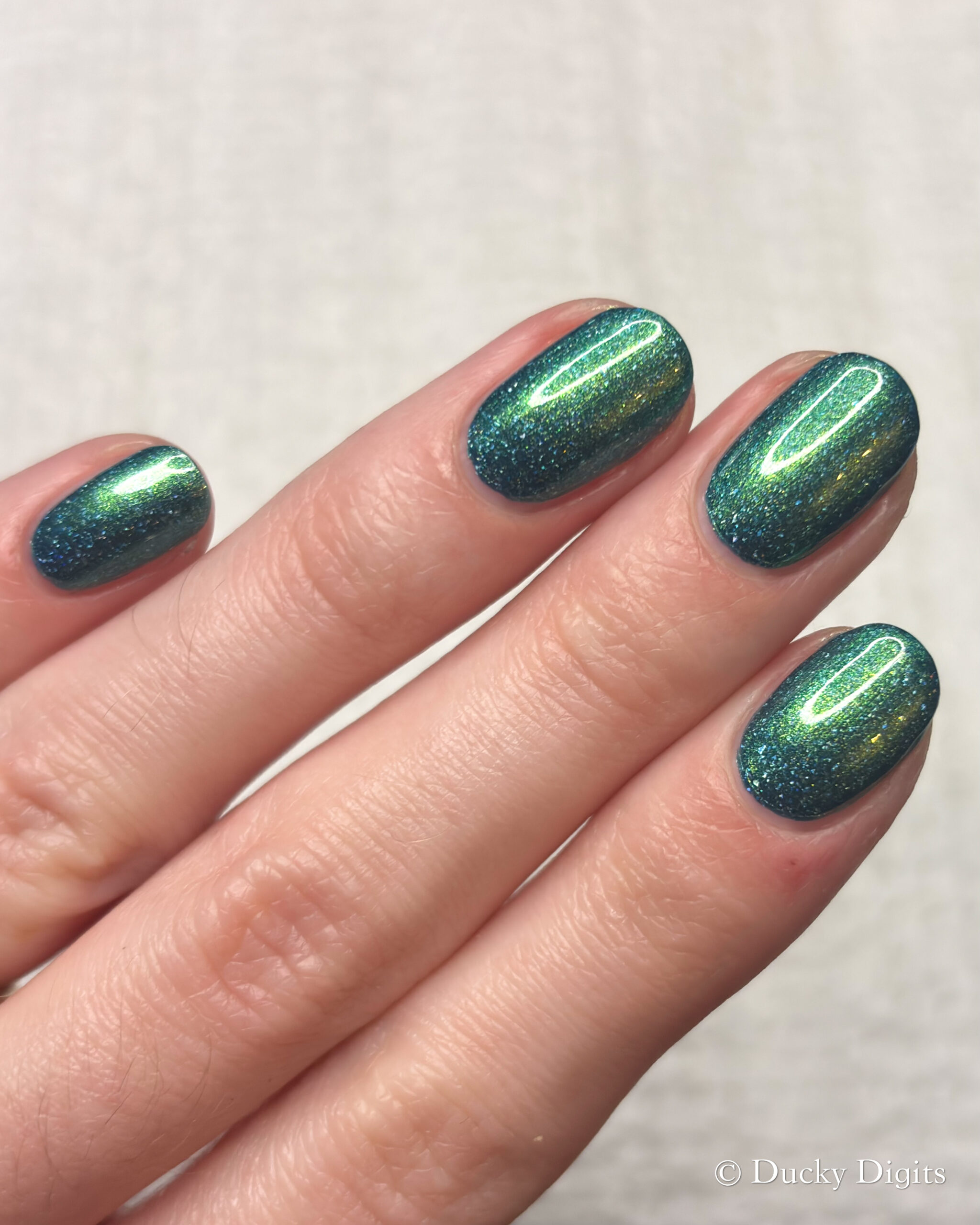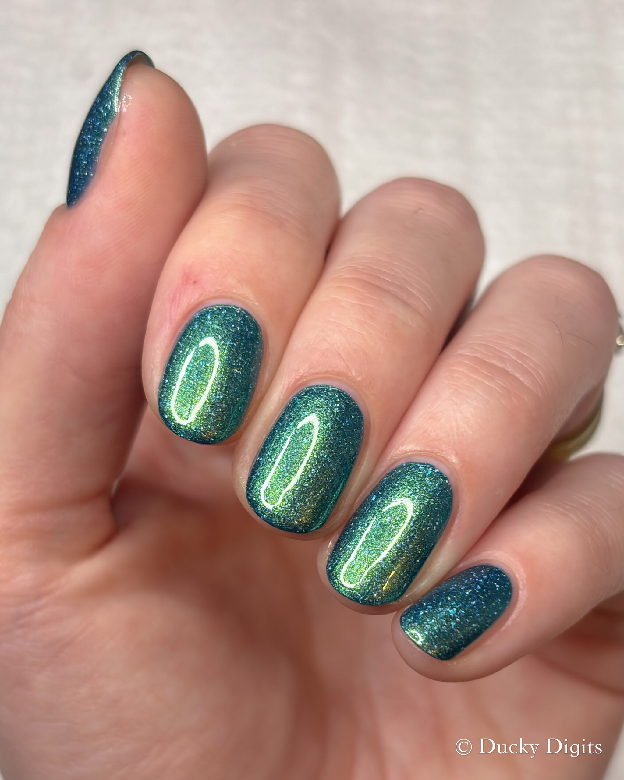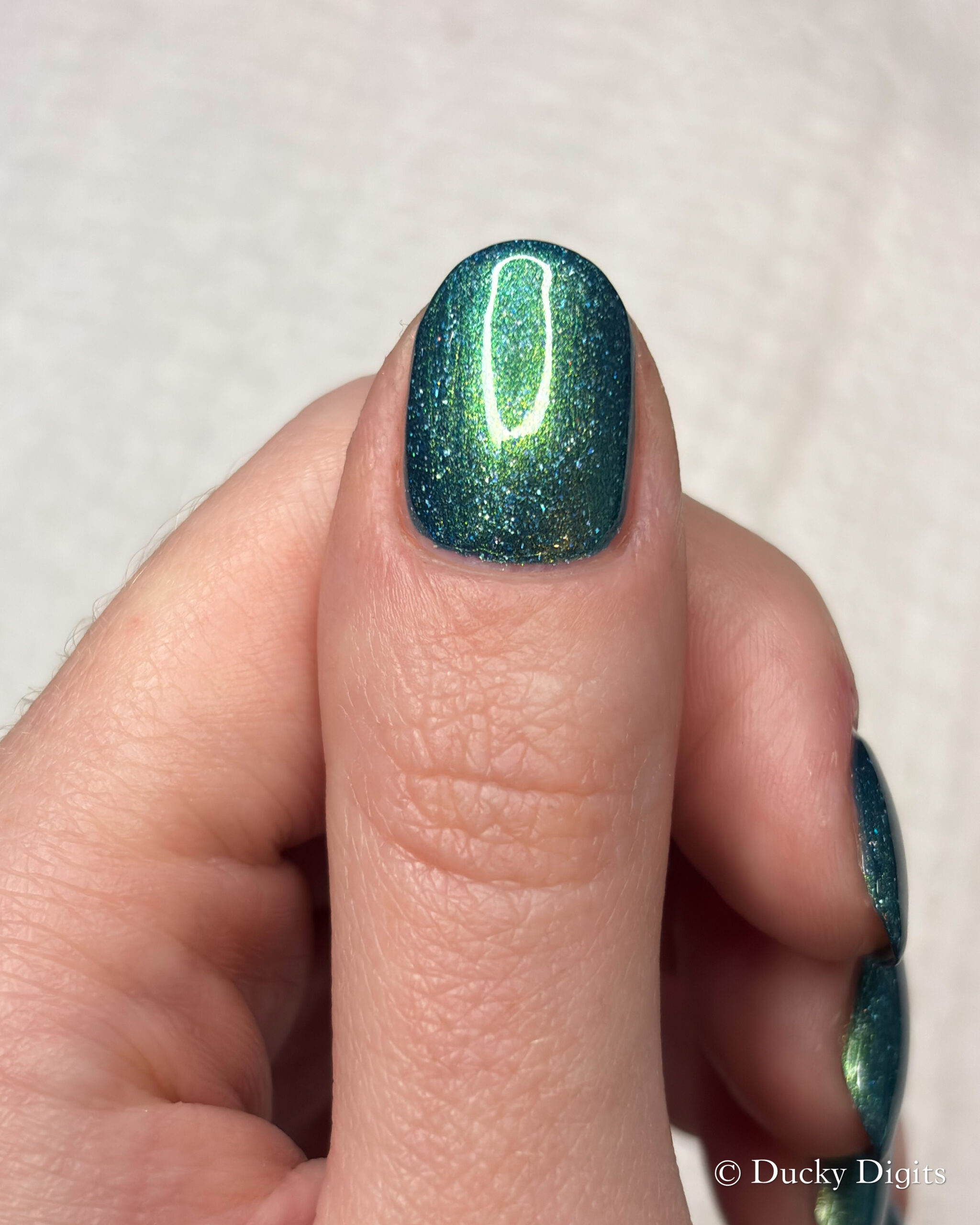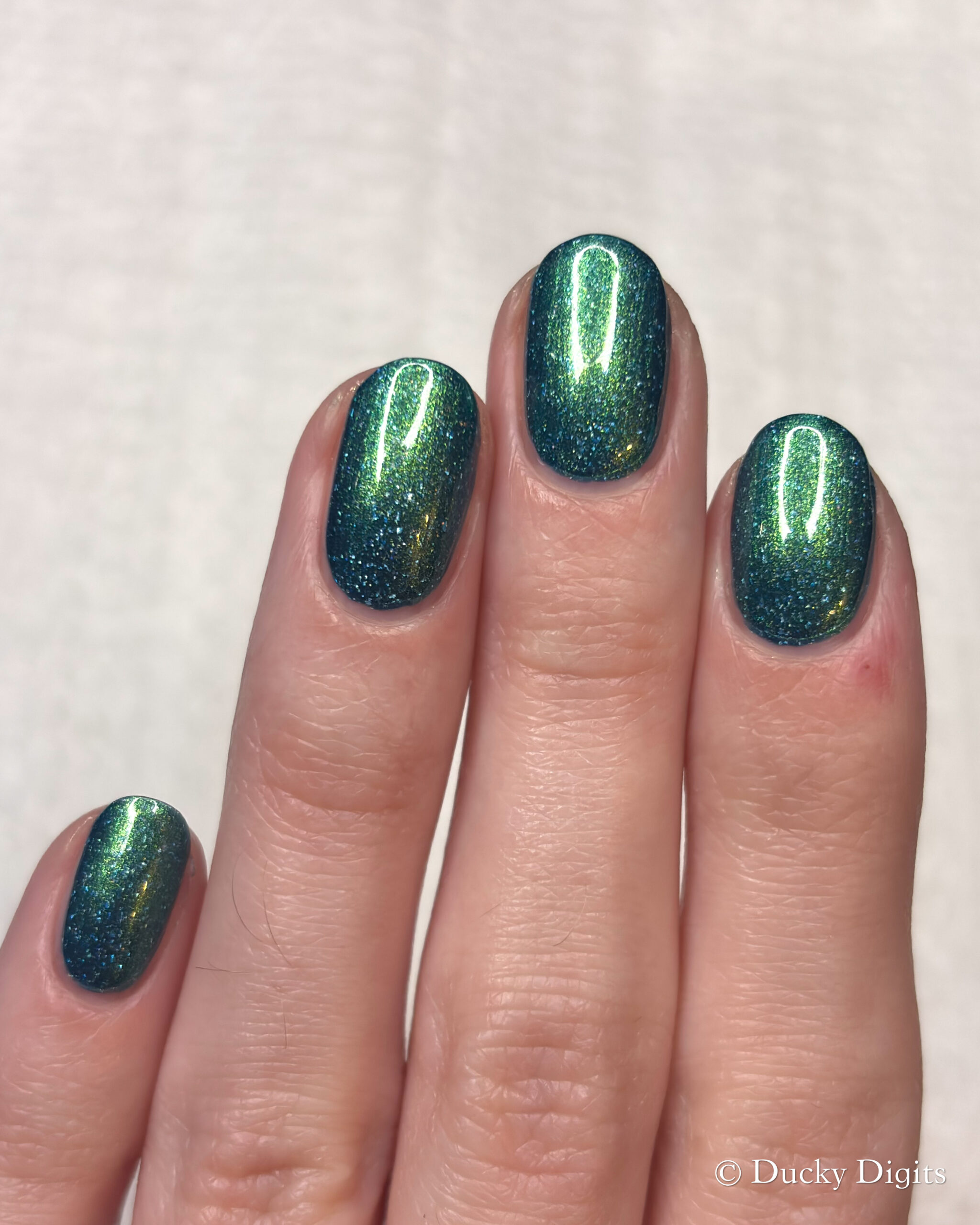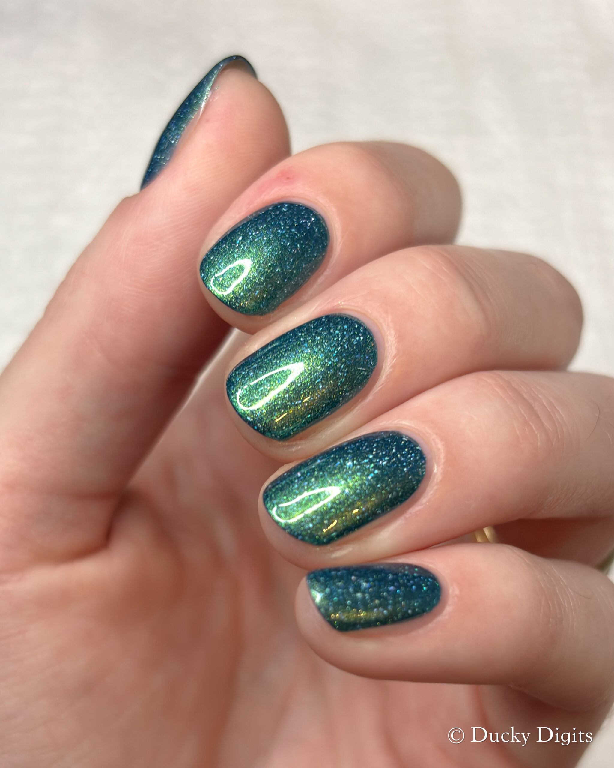 Like the K&Co offering this month, I also experienced a bit of an illusion with this polish. While looking at this polish under studio lighting then in the sun, they look like two totally different polishes! The studio lighting looks so much more jade-like to me, whereas in the sun, the blue base really takes over. You can really see this in my swatch photos between the lighting conditions. If you think about it, it’s like you’re getting two polishes in one… a mesmer in our midst!