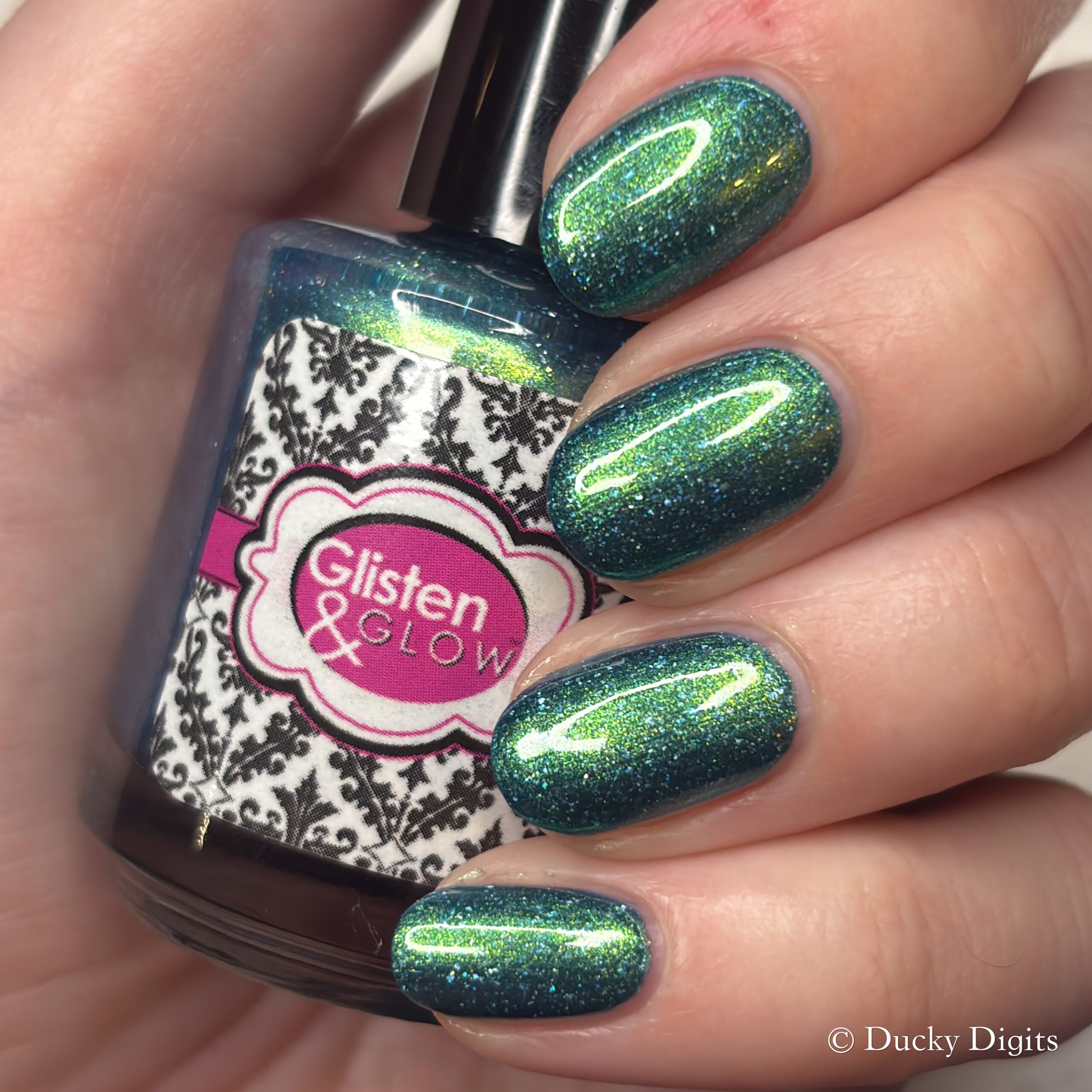 My manicure is 2 coats with the Glisten & Glow Glitter Smoother (gifted) and a glossy top coat.
